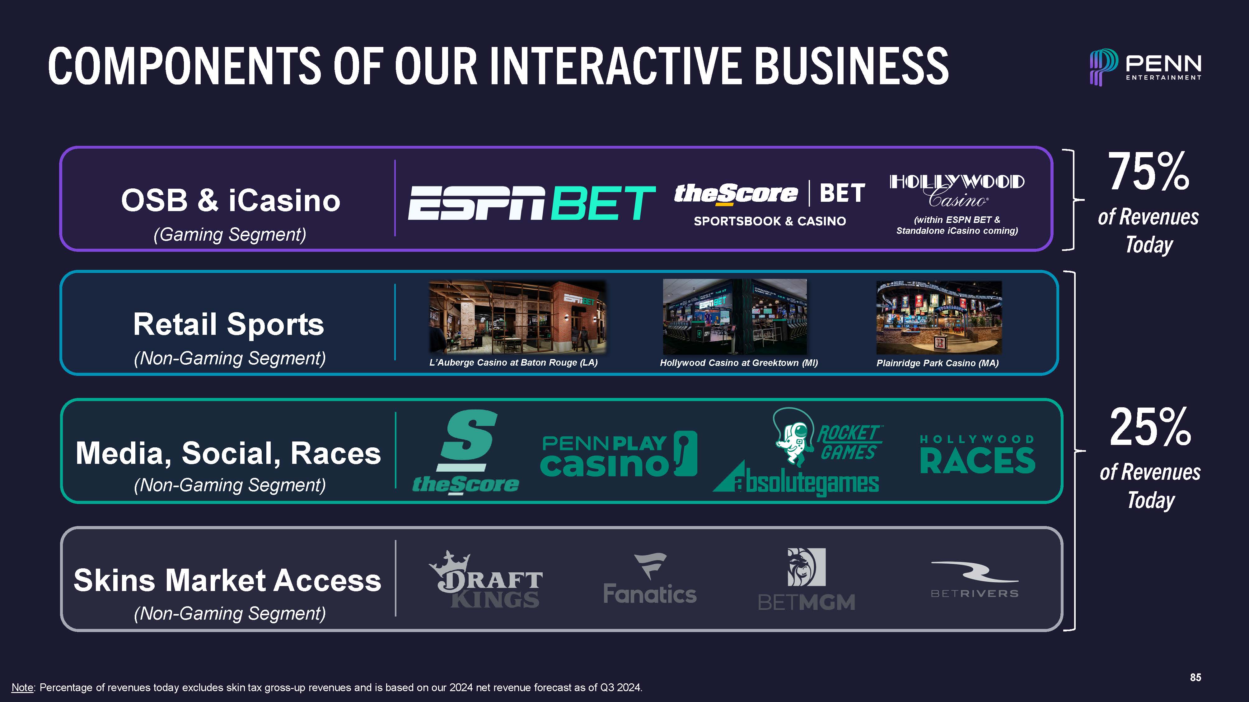 85  COMPONENTS OF OUR INTERACTIVE BUSINESS  OSB & iCasino  (Gaming Segment)  Retail Sports  (Non-Gaming Segment)  Media, Social, Races  (Non-Gaming Segment)  Skins Market Access  (Non-Gaming Segment)  (within ESPN BET & Standalone iCasino coming)  L’Auberge Casino at Baton Rouge (LA)  Hollywood Casino at Greektown (MI)  Plainridge Park Casino (MA)  25%  of Revenues Today  75%  of Revenues Today  Note: Percentage of revenues today excludes skin tax gross-up revenues and is based on our 2024 net revenue forecast as of Q3 2024.