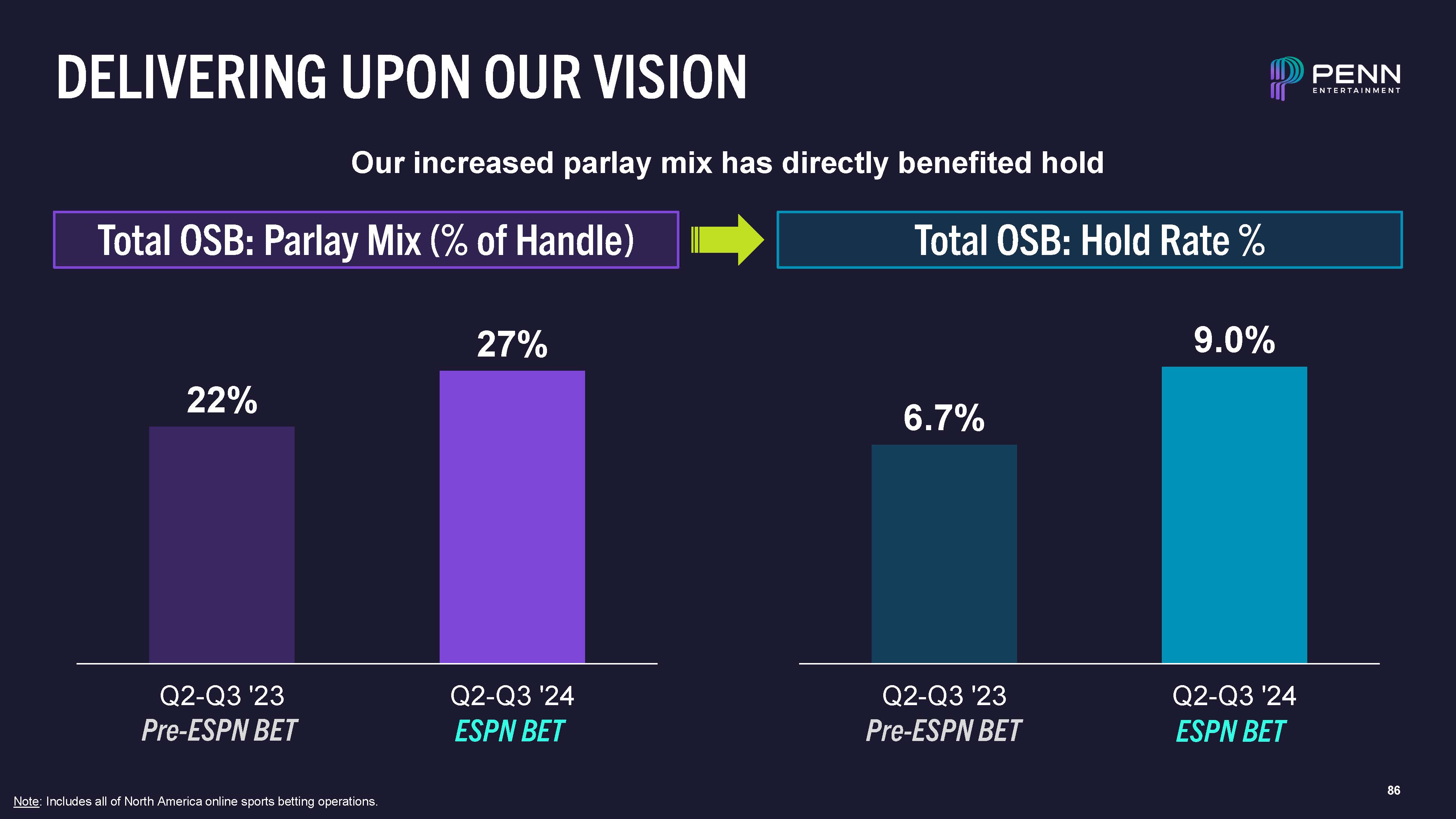 86  DELIVERING UPON OUR VISION  Our increased parlay mix has directly benefited hold  Total OSB: Parlay Mix (% of Handle)  Total OSB: Hold Rate %  6.7%  9.0%  Q2-Q3 '23  Pre-ESPN BET  Q2-Q3 '24  ESPN BET  22%  27%  Q2-Q3 '23  Pre-ESPN BET  Q2-Q3 '24  ESPN BET  Note: Includes all of North America online sports betting operations.