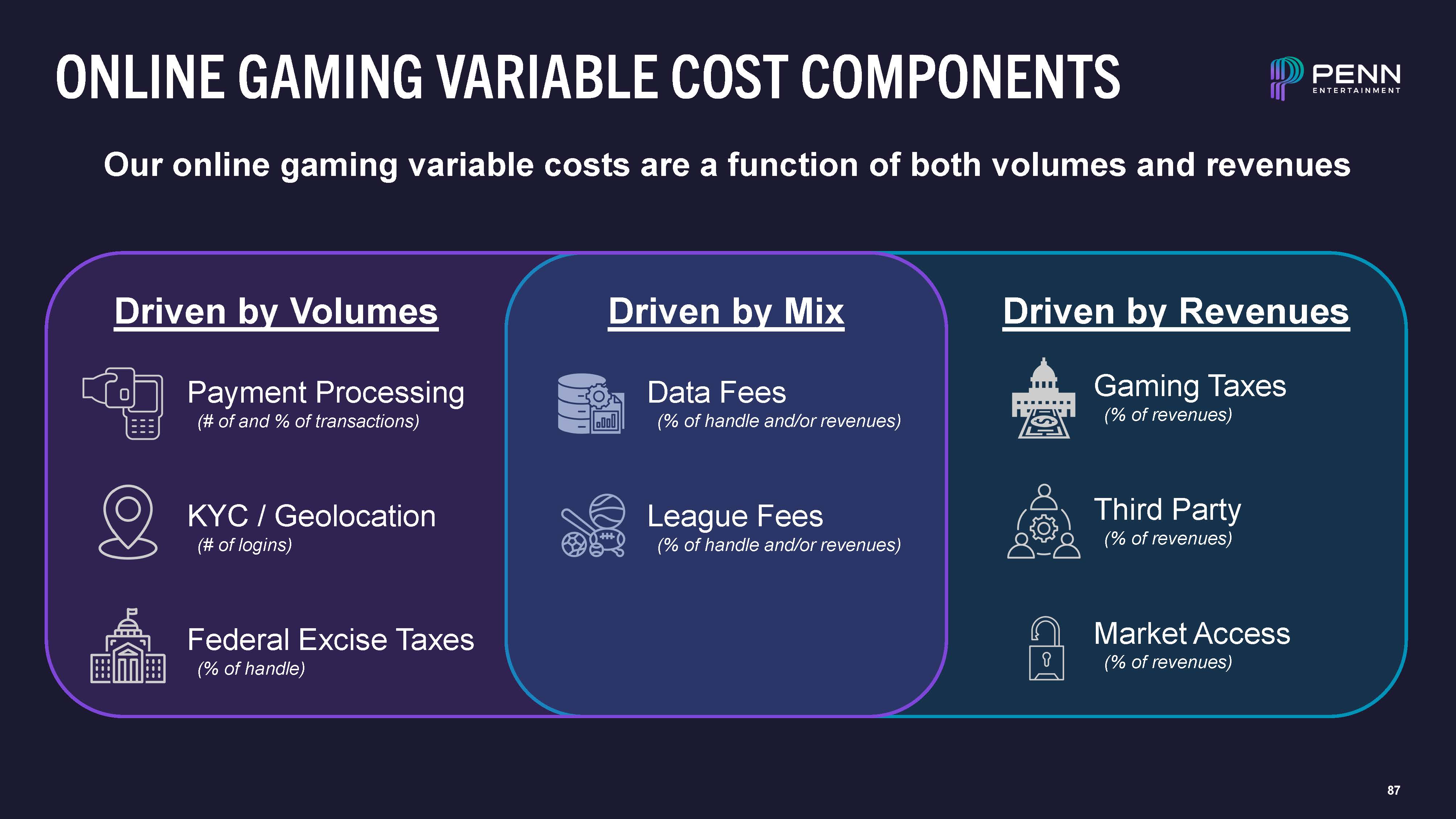 87  ONLINE GAMING VARIABLE COST COMPONENTS  Our online gaming variable costs are a function of both volumes and revenues  Data Fees  (% of handle and/or revenues)  League Fees  (% of handle and/or revenues)  Gaming Taxes  (% of revenues)  Third Party  (% of revenues)  Market Access  (% of revenues)  Payment Processing  (# of and % of transactions)  KYC / Geolocation  (# of logins)  Federal Excise Taxes  (% of handle)  Driven by Volumes  Driven by Revenues  Driven by Mix
