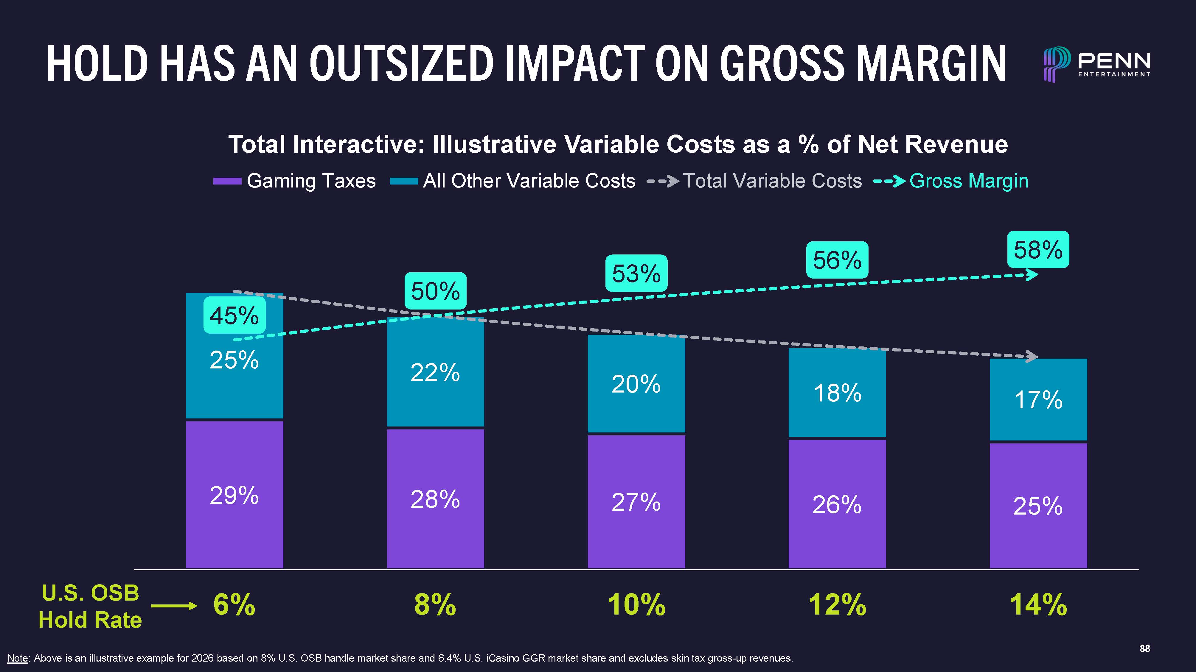 88  29%  28%  27%  26%  25%  22%  20%  18%  17%  45%  25%  50%  53%  56%  58%  6% 8% 10%  12%  14%  Total Interactive: Illustrative Variable Costs as a % of Net Revenue  Gaming Taxes All Other Variable Costs Total Variable Costs Gross Margin  HOLD HAS AN OUTSIZED IMPACT ON GROSS MARGIN  U.S. OSB  Hold Rate  Note: Above is an illustrative example for 2026 based on 8% U.S. OSB handle market share and 6.4% U.S. iCasino GGR market share and excludes skin tax gross-up revenues.