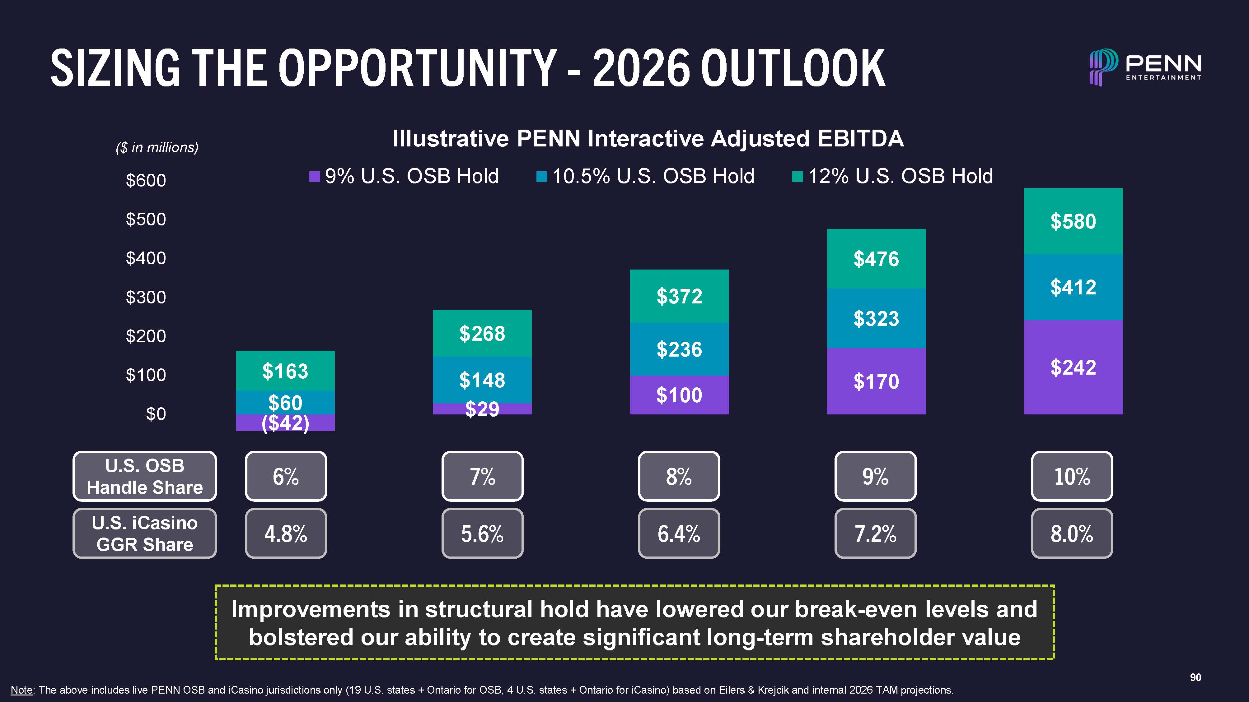 90  SIZING THE OPPORTUNITY - 2026 OUTLOOK  6%  Note: The above includes live PENN OSB and iCasino jurisdictions only (19 U.S. states + Ontario for OSB, 4 U.S. states + Ontario for iCasino) based on Eilers & Krejcik and internal 2026 TAM projections.  7%  8%  9%  10%  4.8% 5.6% 6.4% 7.2% 8.0%  ($ in millions)  Improvements in structural hold have lowered our break-even levels and bolstered our ability to create significant long-term shareholder value  ($42)  $29  $100  $170  $242  $60  $148  $236  $323  $412  $163  $268  $372  $476  $580  ($100)  $0  $100  $200  $300  $400  $500  $600  Illustrative PENN Interactive Adjusted EBITDA  9% U.S. OSB Hold 10.5% U.S. OSB Hold 12% U.S. OSB Hold  U.S. OSB  Handle Share  U.S. iCasino GGR Share