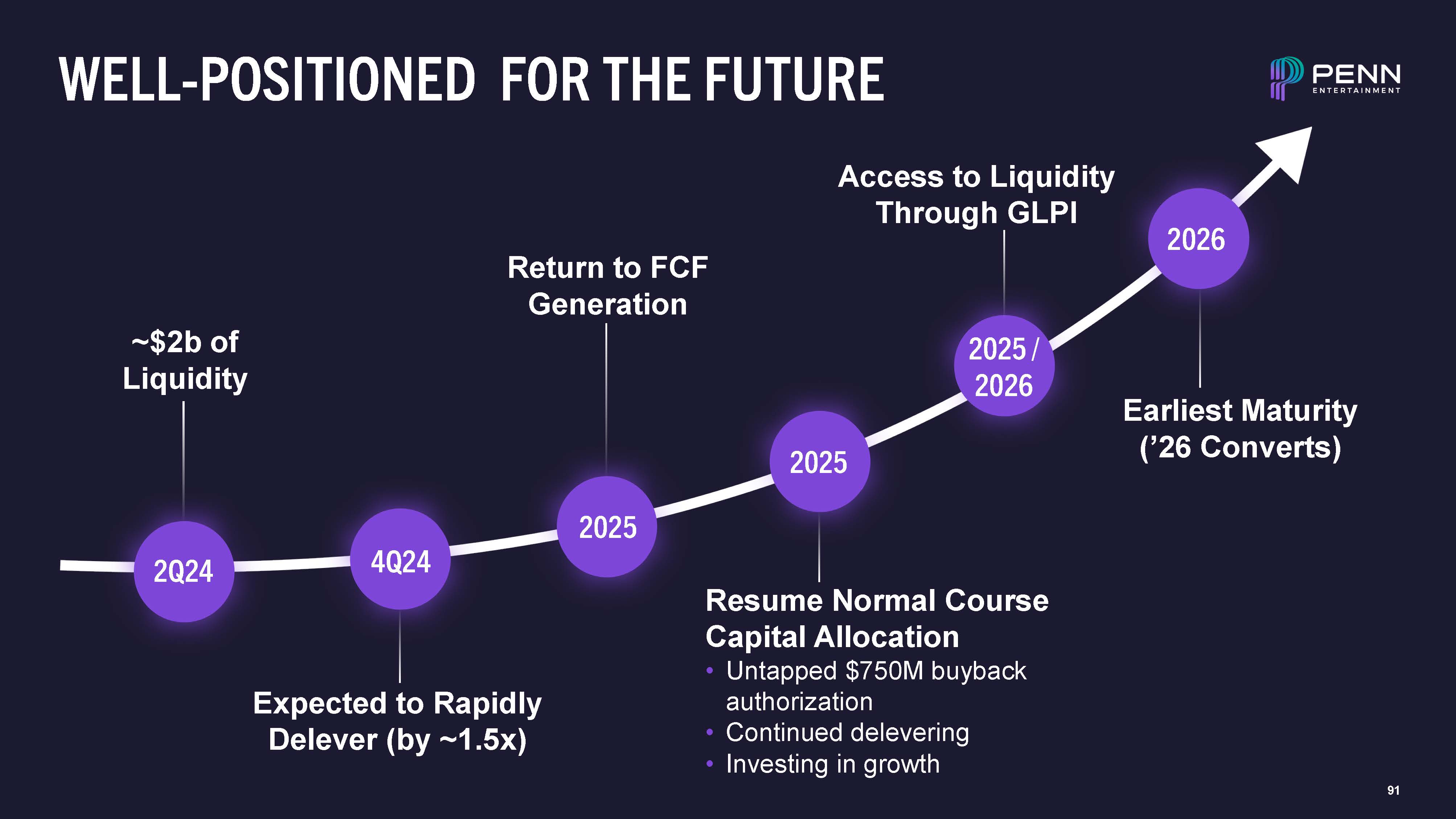 WELL-POSITIONED FOR THE FUTURE  2Q24  4Q24  2025  2025  2025 /  2026  ~$2b of Liquidity  Expected to Rapidly Delever (by ~1.5x)  Resume Normal Course Capital Allocation  Untapped $750M buyback authorization  Continued delevering  Investing in growth  Access to Liquidity Through GLPI  2026  Return to FCF  Generation  Earliest Maturity (’26 Converts)  91