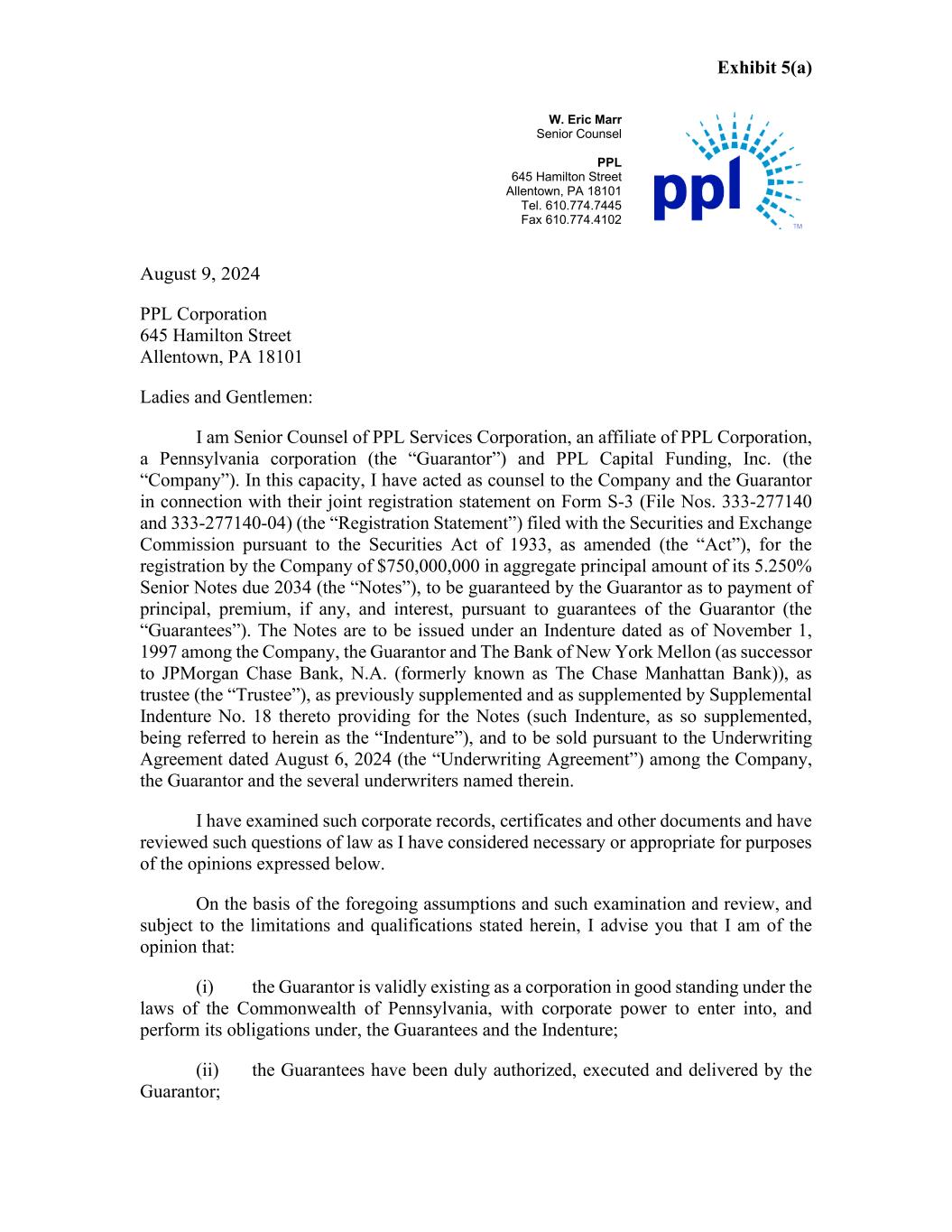 Exhibit 5(a) W. Eric Marr Senior Counsel PPL 645 Hamilton Street Allentown, PA 18101 Tel. 610.774.7445 Fax 610.774.4102 August 9, 2024 PPL Corporation 645 Hamilton Street Allentown, PA 18101 Ladies and Gentlemen: I am Senior Counsel of PPL Services Corporation, an affiliate of PPL Corporation, a Pennsylvania corporation (the “Guarantor”) and PPL Capital Funding, Inc. (the “Company”). In this capacity, I have acted as counsel to the Company and the Guarantor in connection with their joint registration statement on Form S-3 (File Nos. 333-277140 and 333-277140-04) (the “Registration Statement”) filed with the Securities and Exchange Commission pursuant to the Securities Act of 1933, as amended (the “Act”), for the registration by the Company of $750,000,000 in aggregate principal amount of its 5.250% Senior Notes due 2034 (the “Notes”), to be guaranteed by the Guarantor as to payment of principal, premium, if any, and interest, pursuant to guarantees of the Guarantor (the “Guarantees”). The Notes are to be issued under an Indenture dated as of November 1, 1997 among the Company, the Guarantor and The Bank of New York Mellon (as successor to JPMorgan Chase Bank, N.A. (formerly known as The Chase Manhattan Bank)), as trustee (the “Trustee”), as previously supplemented and as supplemented by Supplemental Indenture No. 18 thereto providing for the Notes (such Indenture, as so supplemented, being referred to herein as the “Indenture”), and to be sold pursuant to the Underwriting Agreement dated August 6, 2024 (the “Underwriting Agreement”) among the Company, the Guarantor and the several underwriters named therein. I have examined such corporate records, certificates and other documents and have reviewed such questions of law as I have considered necessary or appropriate for purposes of the opinions expressed below. On the basis of the foregoing assumptions and such examination and review, and subject to the limitations and qualifications stated herein, I advise you that I am of the opinion that: (i) the Guarantor is validly existing as a corporation in good standing under the laws of the Commonwealth of Pennsylvania, with corporate power to enter into, and perform its obligations under, the Guarantees and the Indenture; (ii) the Guarantees have been duly authorized, executed and delivered by the Guarantor;