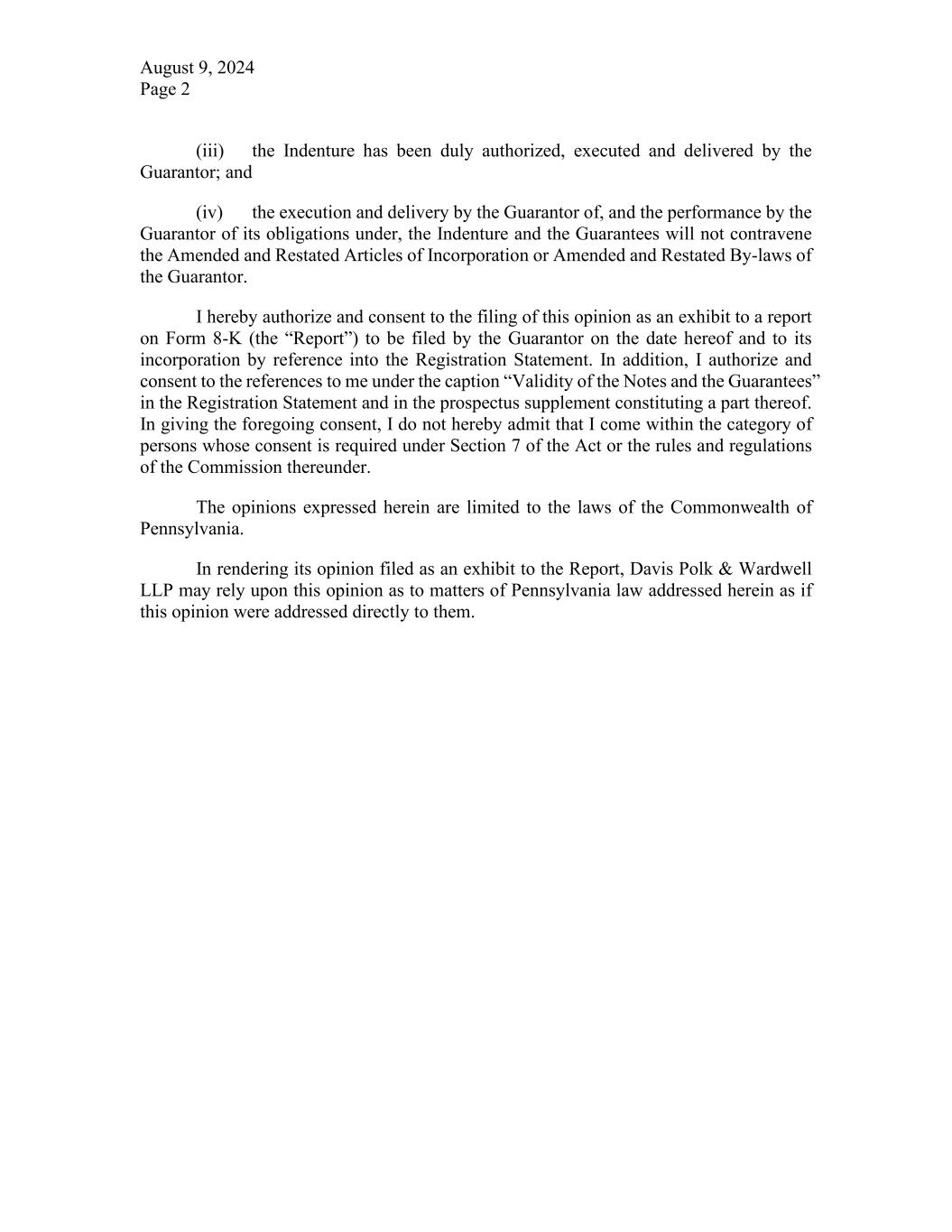 August 9, 2024 Page 2 (iii) the Indenture has been duly authorized, executed and delivered by the Guarantor; and (iv) the execution and delivery by the Guarantor of, and the performance by the Guarantor of its obligations under, the Indenture and the Guarantees will not contravene the Amended and Restated Articles of Incorporation or Amended and Restated By-laws of the Guarantor. I hereby authorize and consent to the filing of this opinion as an exhibit to a report on Form 8-K (the “Report”) to be filed by the Guarantor on the date hereof and to its incorporation by reference into the Registration Statement. In addition, I authorize and consent to the references to me under the caption “Validity of the Notes and the Guarantees” in the Registration Statement and in the prospectus supplement constituting a part thereof. In giving the foregoing consent, I do not hereby admit that I come within the category of persons whose consent is required under Section 7 of the Act or the rules and regulations of the Commission thereunder. The opinions expressed herein are limited to the laws of the Commonwealth of Pennsylvania. In rendering its opinion filed as an exhibit to the Report, Davis Polk & Wardwell LLP may rely upon this opinion as to matters of Pennsylvania law addressed herein as if this opinion were addressed directly to them.