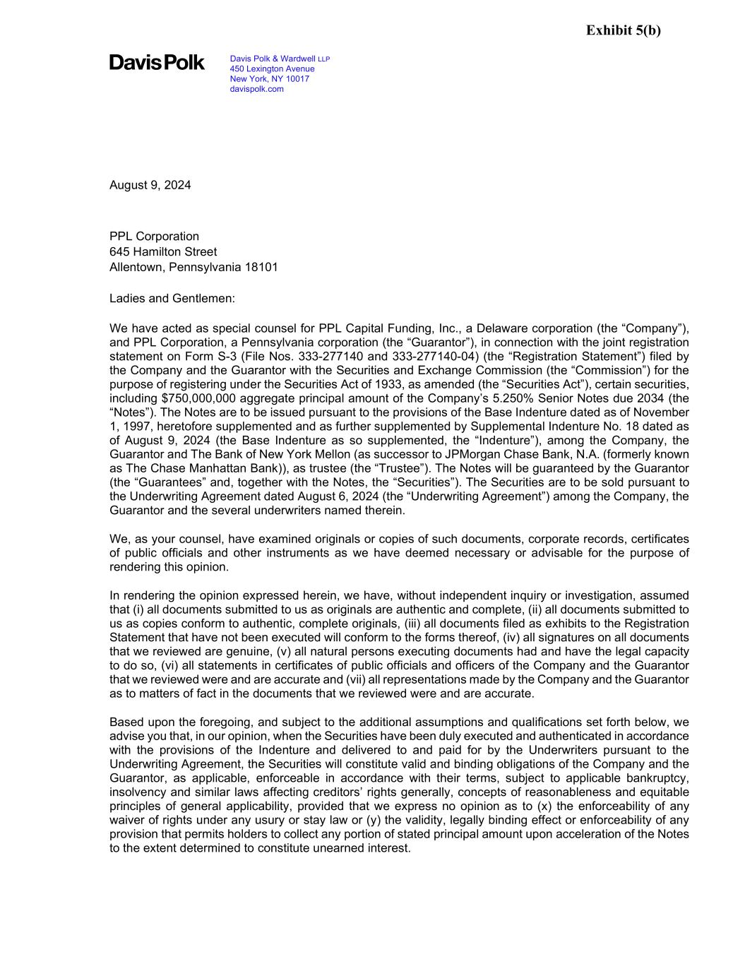 Exhibit 5(b) Davis Polk & Wardwell LLP 450 Lexington Avenue New York, NY 10017 davispolk.com August 9, 2024 PPL Corporation 645 Hamilton Street Allentown, Pennsylvania 18101 Ladies and Gentlemen: We have acted as special counsel for PPL Capital Funding, Inc., a Delaware corporation (the “Company”), and PPL Corporation, a Pennsylvania corporation (the “Guarantor”), in connection with the joint registration statement on Form S-3 (File Nos. 333-277140 and 333-277140-04) (the “Registration Statement”) filed by the Company and the Guarantor with the Securities and Exchange Commission (the “Commission”) for the purpose of registering under the Securities Act of 1933, as amended (the “Securities Act”), certain securities, including $750,000,000 aggregate principal amount of the Company’s 5.250% Senior Notes due 2034 (the “Notes”). The Notes are to be issued pursuant to the provisions of the Base Indenture dated as of November 1, 1997, heretofore supplemented and as further supplemented by Supplemental Indenture No. 18 dated as of August 9, 2024 (the Base Indenture as so supplemented, the “Indenture”), among the Company, the Guarantor and The Bank of New York Mellon (as successor to JPMorgan Chase Bank, N.A. (formerly known as The Chase Manhattan Bank)), as trustee (the “Trustee”). The Notes will be guaranteed by the Guarantor (the “Guarantees” and, together with the Notes, the “Securities”). The Securities are to be sold pursuant to the Underwriting Agreement dated August 6, 2024 (the “Underwriting Agreement”) among the Company, the Guarantor and the several underwriters named therein. We, as your counsel, have examined originals or copies of such documents, corporate records, certificates of public officials and other instruments as we have deemed necessary or advisable for the purpose of rendering this opinion. In rendering the opinion expressed herein, we have, without independent inquiry or investigation, assumed that (i) all documents submitted to us as originals are authentic and complete, (ii) all documents submitted to us as copies conform to authentic, complete originals, (iii) all documents filed as exhibits to the Registration Statement that have not been executed will conform to the forms thereof, (iv) all signatures on all documents that we reviewed are genuine, (v) all natural persons executing documents had and have the legal capacity to do so, (vi) all statements in certificates of public officials and officers of the Company and the Guarantor that we reviewed were and are accurate and (vii) all representations made by the Company and the Guarantor as to matters of fact in the documents that we reviewed were and are accurate. Based upon the foregoing, and subject to the additional assumptions and qualifications set forth below, we advise you that, in our opinion, when the Securities have been duly executed and authenticated in accordance with the provisions of the Indenture and delivered to and paid for by the Underwriters pursuant to the Underwriting Agreement, the Securities will constitute valid and binding obligations of the Company and the Guarantor, as applicable, enforceable in accordance with their terms, subject to applicable bankruptcy, insolvency and similar laws affecting creditors’ rights generally, concepts of reasonableness and equitable principles of general applicability, provided that we express no opinion as to (x) the enforceability of any waiver of rights under any usury or stay law or (y) the validity, legally binding effect or enforceability of any provision that permits holders to collect any portion of stated principal amount upon acceleration of the Notes to the extent determined to constitute unearned interest.