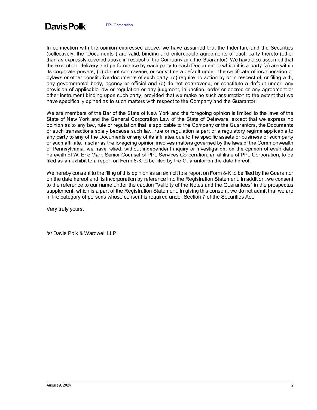 DRAFT PPL Corporation August 9, 2024 2 In connection with the opinion expressed above, we have assumed that the Indenture and the Securities (collectively, the “Documents”) are valid, binding and enforceable agreements of each party thereto (other than as expressly covered above in respect of the Company and the Guarantor). We have also assumed that the execution, delivery and performance by each party to each Document to which it is a party (a) are within its corporate powers, (b) do not contravene, or constitute a default under, the certificate of incorporation or bylaws or other constitutive documents of such party, (c) require no action by or in respect of, or filing with, any governmental body, agency or official and (d) do not contravene, or constitute a default under, any provision of applicable law or regulation or any judgment, injunction, order or decree or any agreement or other instrument binding upon such party, provided that we make no such assumption to the extent that we have specifically opined as to such matters with respect to the Company and the Guarantor. We are members of the Bar of the State of New York and the foregoing opinion is limited to the laws of the State of New York and the General Corporation Law of the State of Delaware, except that we express no opinion as to any law, rule or regulation that is applicable to the Company or the Guarantors, the Documents or such transactions solely because such law, rule or regulation is part of a regulatory regime applicable to any party to any of the Documents or any of its affiliates due to the specific assets or business of such party or such affiliate. Insofar as the foregoing opinion involves matters governed by the laws of the Commonwealth of Pennsylvania, we have relied, without independent inquiry or investigation, on the opinion of even date herewith of W. Eric Marr, Senior Counsel of PPL Services Corporation, an affiliate of PPL Corporation, to be filed as an exhibit to a report on Form 8-K to be filed by the Guarantor on the date hereof. We hereby consent to the filing of this opinion as an exhibit to a report on Form 8-K to be filed by the Guarantor on the date hereof and its incorporation by reference into the Registration Statement. In addition, we consent to the reference to our name under the caption “Validity of the Notes and the Guarantees” in the prospectus supplement, which is a part of the Registration Statement. In giving this consent, we do not admit that we are in the category of persons whose consent is required under Section 7 of the Securities Act. Very truly yours, /s/ Davis Polk & Wardwell LLP