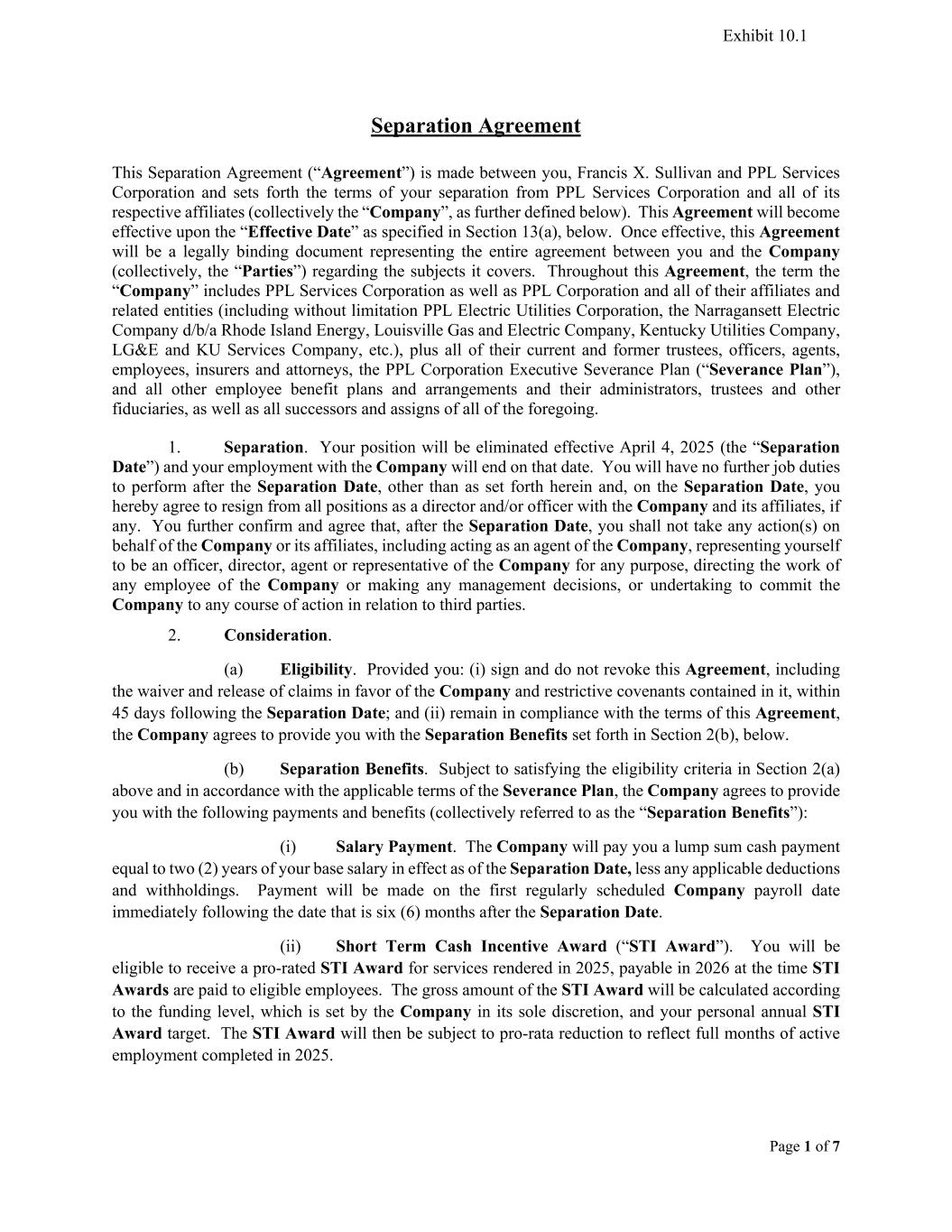 Page 1 of 7 Separation Agreement This Separation Agreement (“Agreement”) is made between you, Francis X. Sullivan and PPL Services Corporation and sets forth the terms of your separation from PPL Services Corporation and all of its respective affiliates (collectively the “Company”, as further defined below). This Agreement will become effective upon the “Effective Date” as specified in Section 13(a), below. Once effective, this Agreement will be a legally binding document representing the entire agreement between you and the Company (collectively, the “Parties”) regarding the subjects it covers. Throughout this Agreement, the term the “Company” includes PPL Services Corporation as well as PPL Corporation and all of their affiliates and related entities (including without limitation PPL Electric Utilities Corporation, the Narragansett Electric Company d/b/a Rhode Island Energy, Louisville Gas and Electric Company, Kentucky Utilities Company, LG&E and KU Services Company, etc.), plus all of their current and former trustees, officers, agents, employees, insurers and attorneys, the PPL Corporation Executive Severance Plan (“Severance Plan”), and all other employee benefit plans and arrangements and their administrators, trustees and other fiduciaries, as well as all successors and assigns of all of the foregoing. 1. Separation. Your position will be eliminated effective April 4, 2025 (the “Separation Date”) and your employment with the Company will end on that date. You will have no further job duties to perform after the Separation Date, other than as set forth herein and, on the Separation Date, you hereby agree to resign from all positions as a director and/or officer with the Company and its affiliates, if any. You further confirm and agree that, after the Separation Date, you shall not take any action(s) on behalf of the Company or its affiliates, including acting as an agent of the Company, representing yourself to be an officer, director, agent or representative of the Company for any purpose, directing the work of any employee of the Company or making any management decisions, or undertaking to commit the Company to any course of action in relation to third parties. 2. Consideration. (a) Eligibility. Provided you: (i) sign and do not revoke this Agreement, including the waiver and release of claims in favor of the Company and restrictive covenants contained in it, within 45 days following the Separation Date; and (ii) remain in compliance with the terms of this Agreement, the Company agrees to provide you with the Separation Benefits set forth in Section 2(b), below. (b) Separation Benefits. Subject to satisfying the eligibility criteria in Section 2(a) above and in accordance with the applicable terms of the Severance Plan, the Company agrees to provide you with the following payments and benefits (collectively referred to as the “Separation Benefits”): (i) Salary Payment. The Company will pay you a lump sum cash payment equal to two (2) years of your base salary in effect as of the Separation Date, less any applicable deductions and withholdings. Payment will be made on the first regularly scheduled Company payroll date immediately following the date that is six (6) months after the Separation Date. (ii) Short Term Cash Incentive Award (“STI Award”). You will be eligible to receive a pro-rated STI Award for services rendered in 2025, payable in 2026 at the time STI Awards are paid to eligible employees. The gross amount of the STI Award will be calculated according to the funding level, which is set by the Company in its sole discretion, and your personal annual STI Award target. The STI Award will then be subject to pro-rata reduction to reflect full months of active employment completed in 2025. Exhibit 10.1
