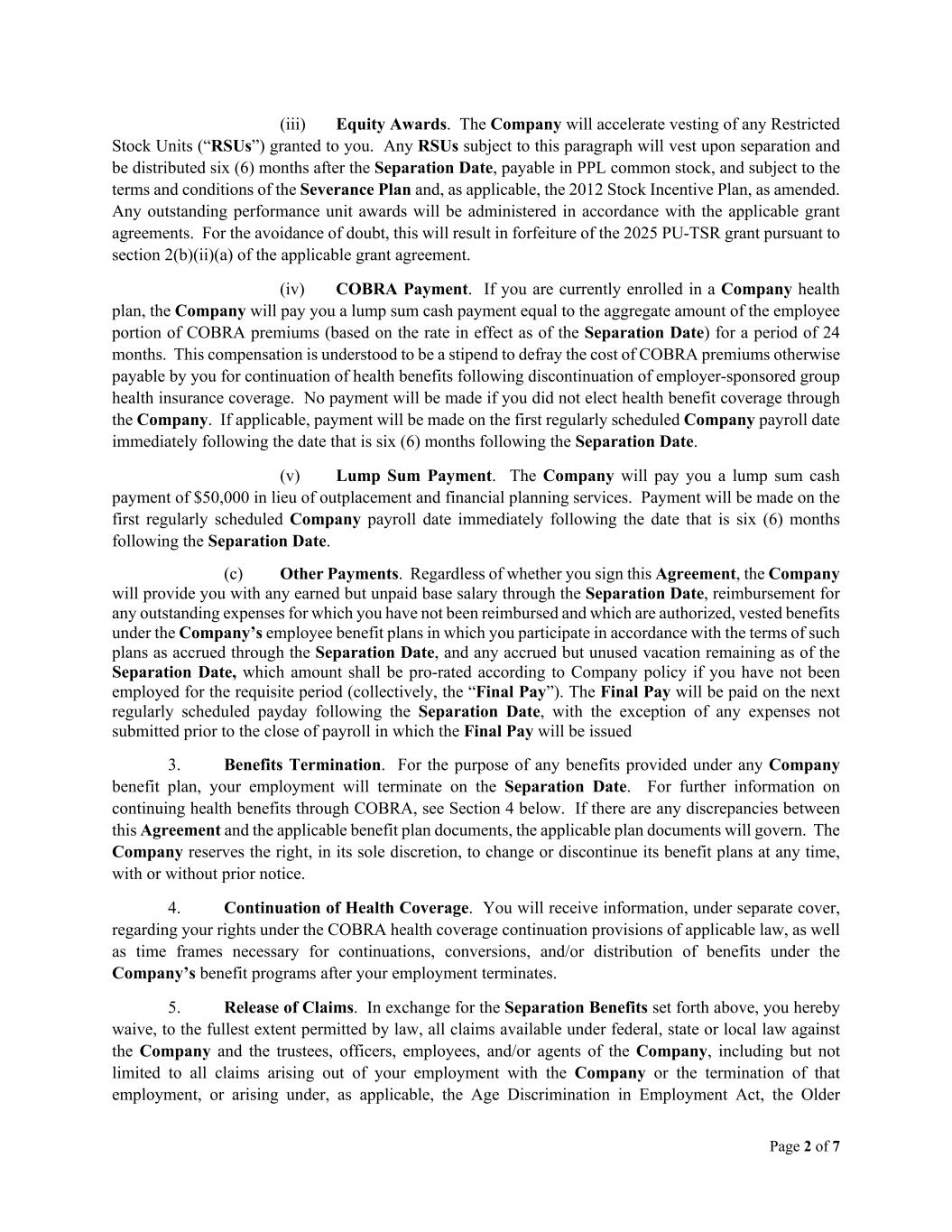 Page 2 of 7 (iii) Equity Awards. The Company will accelerate vesting of any Restricted Stock Units (“RSUs”) granted to you. Any RSUs subject to this paragraph will vest upon separation and be distributed six (6) months after the Separation Date, payable in PPL common stock, and subject to the terms and conditions of the Severance Plan and, as applicable, the 2012 Stock Incentive Plan, as amended. Any outstanding performance unit awards will be administered in accordance with the applicable grant agreements. For the avoidance of doubt, this will result in forfeiture of the 2025 PU-TSR grant pursuant to section 2(b)(ii)(a) of the applicable grant agreement. (iv) COBRA Payment. If you are currently enrolled in a Company health plan, the Company will pay you a lump sum cash payment equal to the aggregate amount of the employee portion of COBRA premiums (based on the rate in effect as of the Separation Date) for a period of 24 months. This compensation is understood to be a stipend to defray the cost of COBRA premiums otherwise payable by you for continuation of health benefits following discontinuation of employer-sponsored group health insurance coverage. No payment will be made if you did not elect health benefit coverage through the Company. If applicable, payment will be made on the first regularly scheduled Company payroll date immediately following the date that is six (6) months following the Separation Date. (v) Lump Sum Payment. The Company will pay you a lump sum cash payment of $50,000 in lieu of outplacement and financial planning services. Payment will be made on the first regularly scheduled Company payroll date immediately following the date that is six (6) months following the Separation Date. (c) Other Payments. Regardless of whether you sign this Agreement, the Company will provide you with any earned but unpaid base salary through the Separation Date, reimbursement for any outstanding expenses for which you have not been reimbursed and which are authorized, vested benefits under the Company’s employee benefit plans in which you participate in accordance with the terms of such plans as accrued through the Separation Date, and any accrued but unused vacation remaining as of the Separation Date, which amount shall be pro-rated according to Company policy if you have not been employed for the requisite period (collectively, the “Final Pay”). The Final Pay will be paid on the next regularly scheduled payday following the Separation Date, with the exception of any expenses not submitted prior to the close of payroll in which the Final Pay will be issued 3. Benefits Termination. For the purpose of any benefits provided under any Company benefit plan, your employment will terminate on the Separation Date. For further information on continuing health benefits through COBRA, see Section 4 below. If there are any discrepancies between this Agreement and the applicable benefit plan documents, the applicable plan documents will govern. The Company reserves the right, in its sole discretion, to change or discontinue its benefit plans at any time, with or without prior notice. 4. Continuation of Health Coverage. You will receive information, under separate cover, regarding your rights under the COBRA health coverage continuation provisions of applicable law, as well as time frames necessary for continuations, conversions, and/or distribution of benefits under the Company’s benefit programs after your employment terminates. 5. Release of Claims. In exchange for the Separation Benefits set forth above, you hereby waive, to the fullest extent permitted by law, all claims available under federal, state or local law against the Company and the trustees, officers, employees, and/or agents of the Company, including but not limited to all claims arising out of your employment with the Company or the termination of that employment, or arising under, as applicable, the Age Discrimination in Employment Act, the Older