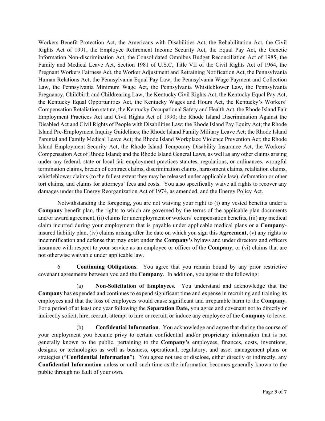 Page 3 of 7 Workers Benefit Protection Act, the Americans with Disabilities Act, the Rehabilitation Act, the Civil Rights Act of 1991, the Employee Retirement Income Security Act, the Equal Pay Act, the Genetic Information Non-discrimination Act, the Consolidated Omnibus Budget Reconciliation Act of 1985, the Family and Medical Leave Act, Section 1981 of U.S.C, Title VII of the Civil Rights Act of 1964, the Pregnant Workers Fairness Act, the Worker Adjustment and Retraining Notification Act, the Pennsylvania Human Relations Act, the Pennsylvania Equal Pay Law, the Pennsylvania Wage Payment and Collection Law, the Pennsylvania Minimum Wage Act, the Pennsylvania Whistleblower Law, the Pennsylvania Pregnancy, Childbirth and Childrearing Law, the Kentucky Civil Rights Act, the Kentucky Equal Pay Act, the Kentucky Equal Opportunities Act, the Kentucky Wages and Hours Act, the Kentucky’s Workers’ Compensation Retaliation statute, the Kentucky Occupational Safety and Health Act, the Rhode Island Fair Employment Practices Act and Civil Rights Act of 1990; the Rhode Island Discrimination Against the Disabled Act and Civil Rights of People with Disabilities Law; the Rhode Island Pay Equity Act; the Rhode Island Pre-Employment Inquiry Guidelines; the Rhode Island Family Military Leave Act; the Rhode Island Parental and Family Medical Leave Act; the Rhode Island Workplace Violence Prevention Act; the Rhode Island Employment Security Act, the Rhode Island Temporary Disability Insurance Act, the Workers’ Compensation Act of Rhode Island; and the Rhode Island General Laws, as well as any other claims arising under any federal, state or local fair employment practices statutes, regulations, or ordinances, wrongful termination claims, breach of contract claims, discrimination claims, harassment claims, retaliation claims, whistleblower claims (to the fullest extent they may be released under applicable law), defamation or other tort claims, and claims for attorneys’ fees and costs. You also specifically waive all rights to recover any damages under the Energy Reorganization Act of 1974, as amended, and the Energy Policy Act. Notwithstanding the foregoing, you are not waiving your right to (i) any vested benefits under a Company benefit plan, the rights to which are governed by the terms of the applicable plan documents and/or award agreement, (ii) claims for unemployment or workers’ compensation benefits, (iii) any medical claim incurred during your employment that is payable under applicable medical plans or a Company- insured liability plan, (iv) claims arising after the date on which you sign this Agreement, (v) any rights to indemnification and defense that may exist under the Company’s bylaws and under directors and officers insurance with respect to your service as an employee or officer of the Company, or (vi) claims that are not otherwise waivable under applicable law. 6. Continuing Obligations. You agree that you remain bound by any prior restrictive covenant agreements between you and the Company. In addition, you agree to the following: (a) Non-Solicitation of Employees. You understand and acknowledge that the Company has expended and continues to expend significant time and expense in recruiting and training its employees and that the loss of employees would cause significant and irreparable harm to the Company. For a period of at least one year following the Separation Date, you agree and covenant not to directly or indirectly solicit, hire, recruit, attempt to hire or recruit, or induce any employee of the Company to leave. (b) Confidential Information. You acknowledge and agree that during the course of your employment you became privy to certain confidential and/or proprietary information that is not generally known to the public, pertaining to the Company’s employees, finances, costs, inventions, designs, or technologies as well as business, operational, regulatory, and asset management plans or strategies (“Confidential Information”). You agree not use or disclose, either directly or indirectly, any Confidential Information unless or until such time as the information becomes generally known to the public through no fault of your own.