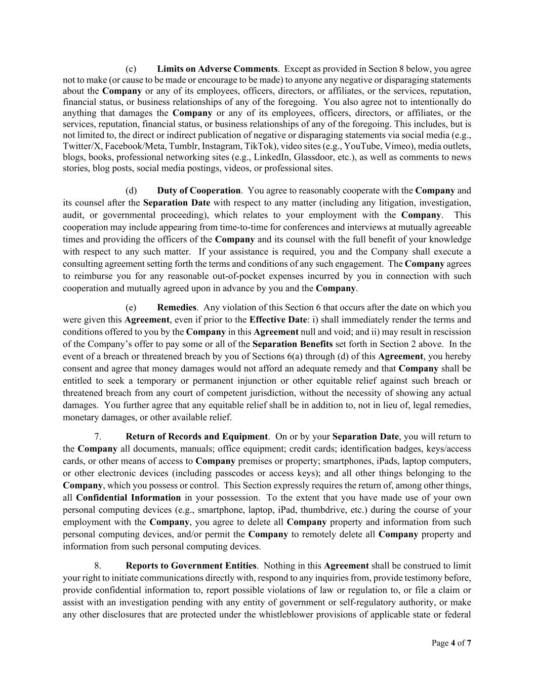 Page 4 of 7 (c) Limits on Adverse Comments. Except as provided in Section 8 below, you agree not to make (or cause to be made or encourage to be made) to anyone any negative or disparaging statements about the Company or any of its employees, officers, directors, or affiliates, or the services, reputation, financial status, or business relationships of any of the foregoing. You also agree not to intentionally do anything that damages the Company or any of its employees, officers, directors, or affiliates, or the services, reputation, financial status, or business relationships of any of the foregoing. This includes, but is not limited to, the direct or indirect publication of negative or disparaging statements via social media (e.g., Twitter/X, Facebook/Meta, Tumblr, Instagram, TikTok), video sites (e.g., YouTube, Vimeo), media outlets, blogs, books, professional networking sites (e.g., LinkedIn, Glassdoor, etc.), as well as comments to news stories, blog posts, social media postings, videos, or professional sites. (d) Duty of Cooperation. You agree to reasonably cooperate with the Company and its counsel after the Separation Date with respect to any matter (including any litigation, investigation, audit, or governmental proceeding), which relates to your employment with the Company. This cooperation may include appearing from time-to-time for conferences and interviews at mutually agreeable times and providing the officers of the Company and its counsel with the full benefit of your knowledge with respect to any such matter. If your assistance is required, you and the Company shall execute a consulting agreement setting forth the terms and conditions of any such engagement. The Company agrees to reimburse you for any reasonable out-of-pocket expenses incurred by you in connection with such cooperation and mutually agreed upon in advance by you and the Company. (e) Remedies. Any violation of this Section 6 that occurs after the date on which you were given this Agreement, even if prior to the Effective Date: i) shall immediately render the terms and conditions offered to you by the Company in this Agreement null and void; and ii) may result in rescission of the Company’s offer to pay some or all of the Separation Benefits set forth in Section 2 above. In the event of a breach or threatened breach by you of Sections 6(a) through (d) of this Agreement, you hereby consent and agree that money damages would not afford an adequate remedy and that Company shall be entitled to seek a temporary or permanent injunction or other equitable relief against such breach or threatened breach from any court of competent jurisdiction, without the necessity of showing any actual damages. You further agree that any equitable relief shall be in addition to, not in lieu of, legal remedies, monetary damages, or other available relief. 7. Return of Records and Equipment. On or by your Separation Date, you will return to the Company all documents, manuals; office equipment; credit cards; identification badges, keys/access cards, or other means of access to Company premises or property; smartphones, iPads, laptop computers, or other electronic devices (including passcodes or access keys); and all other things belonging to the Company, which you possess or control. This Section expressly requires the return of, among other things, all Confidential Information in your possession. To the extent that you have made use of your own personal computing devices (e.g., smartphone, laptop, iPad, thumbdrive, etc.) during the course of your employment with the Company, you agree to delete all Company property and information from such personal computing devices, and/or permit the Company to remotely delete all Company property and information from such personal computing devices. 8. Reports to Government Entities. Nothing in this Agreement shall be construed to limit your right to initiate communications directly with, respond to any inquiries from, provide testimony before, provide confidential information to, report possible violations of law or regulation to, or file a claim or assist with an investigation pending with any entity of government or self-regulatory authority, or make any other disclosures that are protected under the whistleblower provisions of applicable state or federal