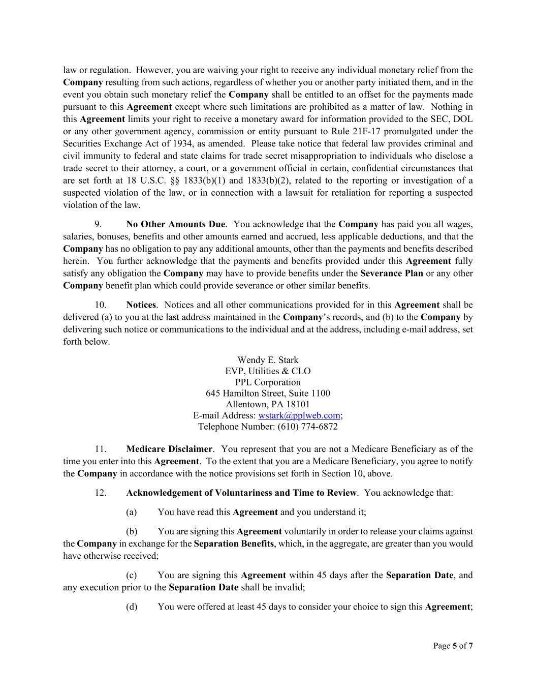 Page 5 of 7 law or regulation. However, you are waiving your right to receive any individual monetary relief from the Company resulting from such actions, regardless of whether you or another party initiated them, and in the event you obtain such monetary relief the Company shall be entitled to an offset for the payments made pursuant to this Agreement except where such limitations are prohibited as a matter of law. Nothing in this Agreement limits your right to receive a monetary award for information provided to the SEC, DOL or any other government agency, commission or entity pursuant to Rule 21F-17 promulgated under the Securities Exchange Act of 1934, as amended. Please take notice that federal law provides criminal and civil immunity to federal and state claims for trade secret misappropriation to individuals who disclose a trade secret to their attorney, a court, or a government official in certain, confidential circumstances that are set forth at 18 U.S.C. §§ 1833(b)(1) and 1833(b)(2), related to the reporting or investigation of a suspected violation of the law, or in connection with a lawsuit for retaliation for reporting a suspected violation of the law. 9. No Other Amounts Due. You acknowledge that the Company has paid you all wages, salaries, bonuses, benefits and other amounts earned and accrued, less applicable deductions, and that the Company has no obligation to pay any additional amounts, other than the payments and benefits described herein. You further acknowledge that the payments and benefits provided under this Agreement fully satisfy any obligation the Company may have to provide benefits under the Severance Plan or any other Company benefit plan which could provide severance or other similar benefits. 10. Notices. Notices and all other communications provided for in this Agreement shall be delivered (a) to you at the last address maintained in the Company’s records, and (b) to the Company by delivering such notice or communications to the individual and at the address, including e-mail address, set forth below. Wendy E. Stark EVP, Utilities & CLO PPL Corporation 645 Hamilton Street, Suite 1100 Allentown, PA 18101 E-mail Address: wstark@pplweb.com; Telephone Number: (610) 774-6872 11. Medicare Disclaimer. You represent that you are not a Medicare Beneficiary as of the time you enter into this Agreement. To the extent that you are a Medicare Beneficiary, you agree to notify the Company in accordance with the notice provisions set forth in Section 10, above. 12. Acknowledgement of Voluntariness and Time to Review. You acknowledge that: (a) You have read this Agreement and you understand it; (b) You are signing this Agreement voluntarily in order to release your claims against the Company in exchange for the Separation Benefits, which, in the aggregate, are greater than you would have otherwise received; (c) You are signing this Agreement within 45 days after the Separation Date, and any execution prior to the Separation Date shall be invalid; (d) You were offered at least 45 days to consider your choice to sign this Agreement;