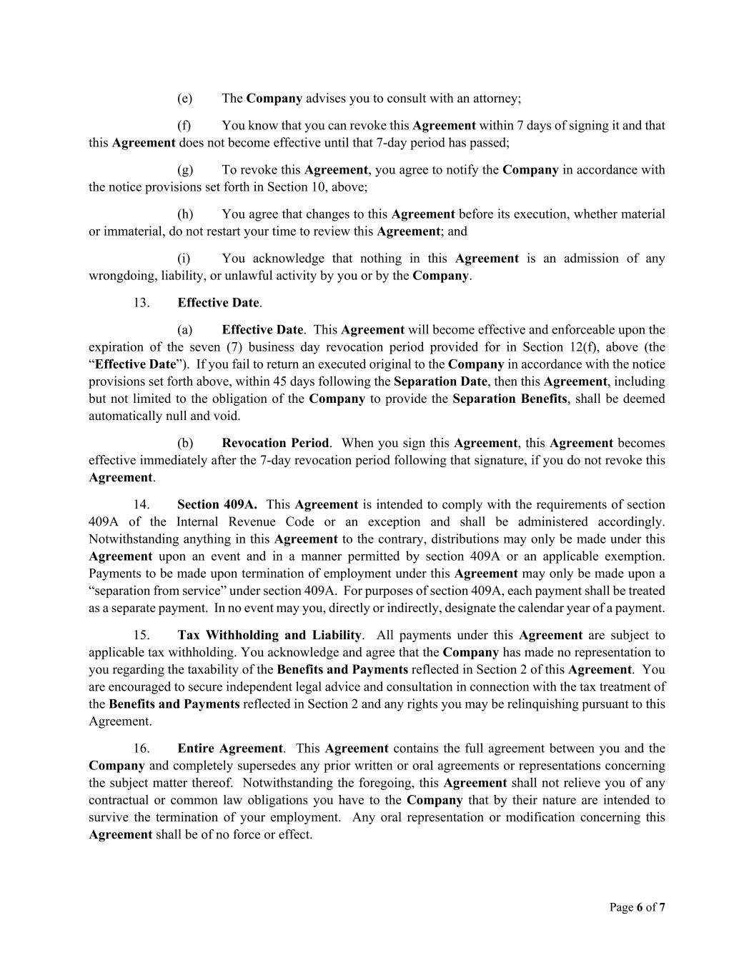 Page 6 of 7 (e) The Company advises you to consult with an attorney; (f) You know that you can revoke this Agreement within 7 days of signing it and that this Agreement does not become effective until that 7-day period has passed; (g) To revoke this Agreement, you agree to notify the Company in accordance with the notice provisions set forth in Section 10, above; (h) You agree that changes to this Agreement before its execution, whether material or immaterial, do not restart your time to review this Agreement; and (i) You acknowledge that nothing in this Agreement is an admission of any wrongdoing, liability, or unlawful activity by you or by the Company. 13. Effective Date. (a) Effective Date. This Agreement will become effective and enforceable upon the expiration of the seven (7) business day revocation period provided for in Section 12(f), above (the “Effective Date”). If you fail to return an executed original to the Company in accordance with the notice provisions set forth above, within 45 days following the Separation Date, then this Agreement, including but not limited to the obligation of the Company to provide the Separation Benefits, shall be deemed automatically null and void. (b) Revocation Period. When you sign this Agreement, this Agreement becomes effective immediately after the 7-day revocation period following that signature, if you do not revoke this Agreement. 14. Section 409A. This Agreement is intended to comply with the requirements of section 409A of the Internal Revenue Code or an exception and shall be administered accordingly. Notwithstanding anything in this Agreement to the contrary, distributions may only be made under this Agreement upon an event and in a manner permitted by section 409A or an applicable exemption. Payments to be made upon termination of employment under this Agreement may only be made upon a “separation from service” under section 409A. For purposes of section 409A, each payment shall be treated as a separate payment. In no event may you, directly or indirectly, designate the calendar year of a payment. 15. Tax Withholding and Liability. All payments under this Agreement are subject to applicable tax withholding. You acknowledge and agree that the Company has made no representation to you regarding the taxability of the Benefits and Payments reflected in Section 2 of this Agreement. You are encouraged to secure independent legal advice and consultation in connection with the tax treatment of the Benefits and Payments reflected in Section 2 and any rights you may be relinquishing pursuant to this Agreement. 16. Entire Agreement. This Agreement contains the full agreement between you and the Company and completely supersedes any prior written or oral agreements or representations concerning the subject matter thereof. Notwithstanding the foregoing, this Agreement shall not relieve you of any contractual or common law obligations you have to the Company that by their nature are intended to survive the termination of your employment. Any oral representation or modification concerning this Agreement shall be of no force or effect.