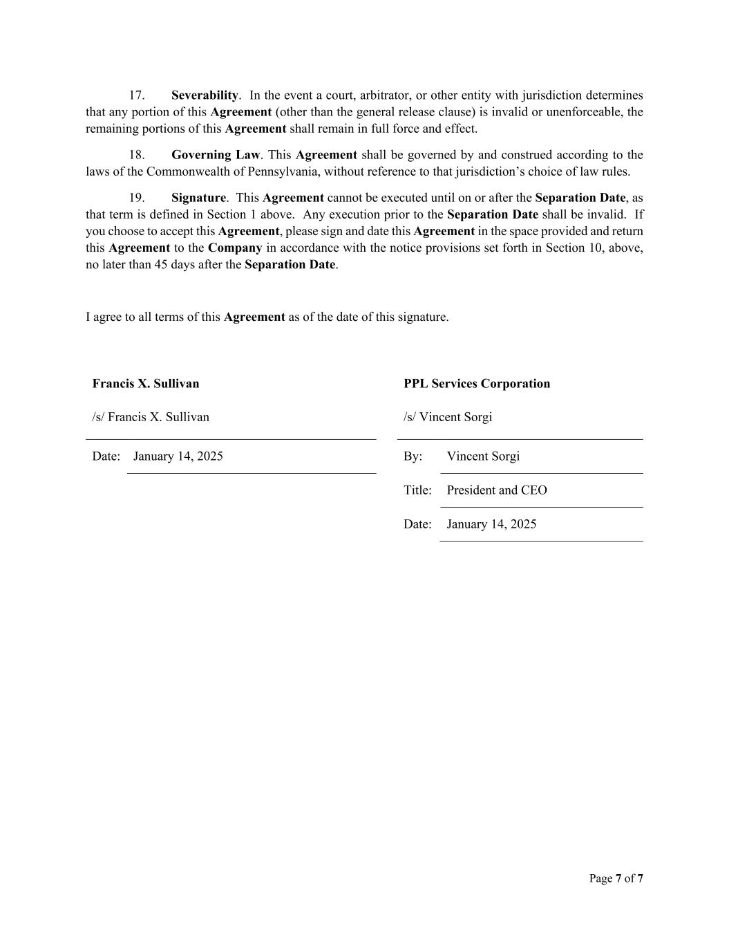 Page 7 of 7 17. Severability. In the event a court, arbitrator, or other entity with jurisdiction determines that any portion of this Agreement (other than the general release clause) is invalid or unenforceable, the remaining portions of this Agreement shall remain in full force and effect. 18. Governing Law. This Agreement shall be governed by and construed according to the laws of the Commonwealth of Pennsylvania, without reference to that jurisdiction’s choice of law rules. 19. Signature. This Agreement cannot be executed until on or after the Separation Date, as that term is defined in Section 1 above. Any execution prior to the Separation Date shall be invalid. If you choose to accept this Agreement, please sign and date this Agreement in the space provided and return this Agreement to the Company in accordance with the notice provisions set forth in Section 10, above, no later than 45 days after the Separation Date. I agree to all terms of this Agreement as of the date of this signature. Francis X. Sullivan PPL Services Corporation /s/ Francis X. Sullivan /s/ Vincent Sorgi Date: January 14, 2025 By: Vincent Sorgi Title: President and CEO Date: January 14, 2025
