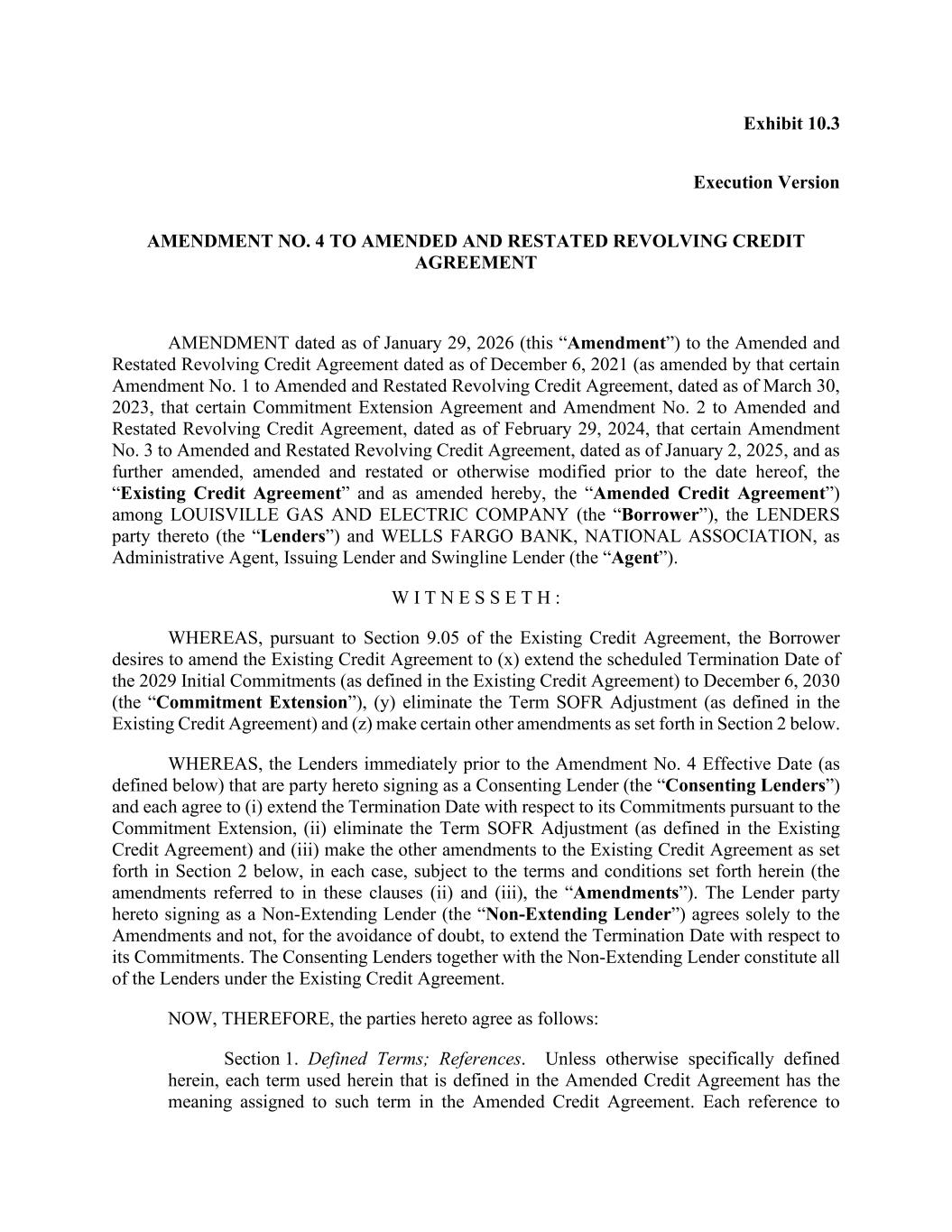 Exhibit 10.3 Execution Version AMENDMENT NO. 4 TO AMENDED AND RESTATED REVOLVING CREDIT AGREEMENT AMENDMENT dated as of January 29, 2026 (this “Amendment”) to the Amended and Restated Revolving Credit Agreement dated as of December 6, 2021 (as amended by that certain Amendment No. 1 to Amended and Restated Revolving Credit Agreement, dated as of March 30, 2023, that certain Commitment Extension Agreement and Amendment No. 2 to Amended and Restated Revolving Credit Agreement, dated as of February 29, 2024, that certain Amendment No. 3 to Amended and Restated Revolving Credit Agreement, dated as of January 2, 2025, and as further amended, amended and restated or otherwise modified prior to the date hereof, the “Existing Credit Agreement” and as amended hereby, the “Amended Credit Agreement”) among LOUISVILLE GAS AND ELECTRIC COMPANY (the “Borrower”), the LENDERS party thereto (the “Lenders”) and WELLS FARGO BANK, NATIONAL ASSOCIATION, as Administrative Agent, Issuing Lender and Swingline Lender (the “Agent”). W I T N E S S E T H : WHEREAS, pursuant to Section 9.05 of the Existing Credit Agreement, the Borrower desires to amend the Existing Credit Agreement to (x) extend the scheduled Termination Date of the 2029 Initial Commitments (as defined in the Existing Credit Agreement) to December 6, 2030 (the “Commitment Extension”), (y) eliminate the Term SOFR Adjustment (as defined in the Existing Credit Agreement) and (z) make certain other amendments as set forth in Section 2 below. WHEREAS, the Lenders immediately prior to the Amendment No. 4 Effective Date (as defined below) that are party hereto signing as a Consenting Lender (the “Consenting Lenders”) and each agree to (i) extend the Termination Date with respect to its Commitments pursuant to the Commitment Extension, (ii) eliminate the Term SOFR Adjustment (as defined in the Existing Credit Agreement) and (iii) make the other amendments to the Existing Credit Agreement as set forth in Section 2 below, in each case, subject to the terms and conditions set forth herein (the amendments referred to in these clauses (ii) and (iii), the “Amendments”). The Lender party hereto signing as a Non-Extending Lender (the “Non-Extending Lender”) agrees solely to the Amendments and not, for the avoidance of doubt, to extend the Termination Date with respect to its Commitments. The Consenting Lenders together with the Non-Extending Lender constitute all of the Lenders under the Existing Credit Agreement. NOW, THEREFORE, the parties hereto agree as follows: Section 1. Defined Terms; References. Unless otherwise specifically defined herein, each term used herein that is defined in the Amended Credit Agreement has the meaning assigned to such term in the Amended Credit Agreement. Each reference to
