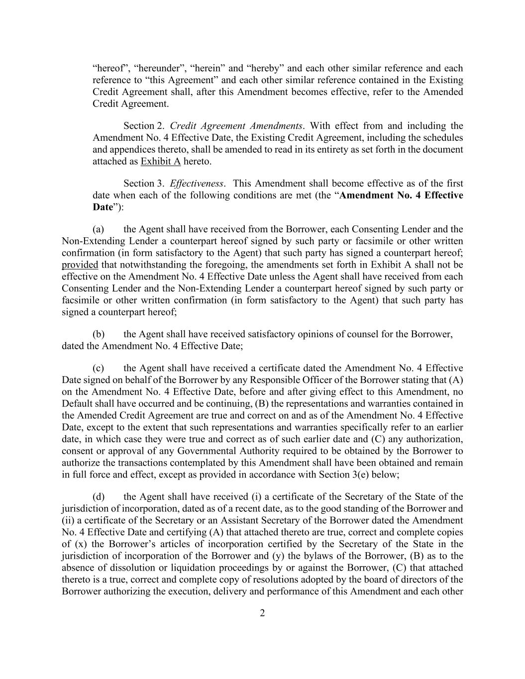 2 “hereof”, “hereunder”, “herein” and “hereby” and each other similar reference and each reference to “this Agreement” and each other similar reference contained in the Existing Credit Agreement shall, after this Amendment becomes effective, refer to the Amended Credit Agreement. Section 2. Credit Agreement Amendments. With effect from and including the Amendment No. 4 Effective Date, the Existing Credit Agreement, including the schedules and appendices thereto, shall be amended to read in its entirety as set forth in the document attached as Exhibit A hereto. Section 3. Effectiveness. This Amendment shall become effective as of the first date when each of the following conditions are met (the “Amendment No. 4 Effective Date”): (a) the Agent shall have received from the Borrower, each Consenting Lender and the Non-Extending Lender a counterpart hereof signed by such party or facsimile or other written confirmation (in form satisfactory to the Agent) that such party has signed a counterpart hereof; provided that notwithstanding the foregoing, the amendments set forth in Exhibit A shall not be effective on the Amendment No. 4 Effective Date unless the Agent shall have received from each Consenting Lender and the Non-Extending Lender a counterpart hereof signed by such party or facsimile or other written confirmation (in form satisfactory to the Agent) that such party has signed a counterpart hereof; (b) the Agent shall have received satisfactory opinions of counsel for the Borrower, dated the Amendment No. 4 Effective Date; (c) the Agent shall have received a certificate dated the Amendment No. 4 Effective Date signed on behalf of the Borrower by any Responsible Officer of the Borrower stating that (A) on the Amendment No. 4 Effective Date, before and after giving effect to this Amendment, no Default shall have occurred and be continuing, (B) the representations and warranties contained in the Amended Credit Agreement are true and correct on and as of the Amendment No. 4 Effective Date, except to the extent that such representations and warranties specifically refer to an earlier date, in which case they were true and correct as of such earlier date and (C) any authorization, consent or approval of any Governmental Authority required to be obtained by the Borrower to authorize the transactions contemplated by this Amendment shall have been obtained and remain in full force and effect, except as provided in accordance with Section 3(e) below; (d) the Agent shall have received (i) a certificate of the Secretary of the State of the jurisdiction of incorporation, dated as of a recent date, as to the good standing of the Borrower and (ii) a certificate of the Secretary or an Assistant Secretary of the Borrower dated the Amendment No. 4 Effective Date and certifying (A) that attached thereto are true, correct and complete copies of (x) the Borrower’s articles of incorporation certified by the Secretary of the State in the jurisdiction of incorporation of the Borrower and (y) the bylaws of the Borrower, (B) as to the absence of dissolution or liquidation proceedings by or against the Borrower, (C) that attached thereto is a true, correct and complete copy of resolutions adopted by the board of directors of the Borrower authorizing the execution, delivery and performance of this Amendment and each other