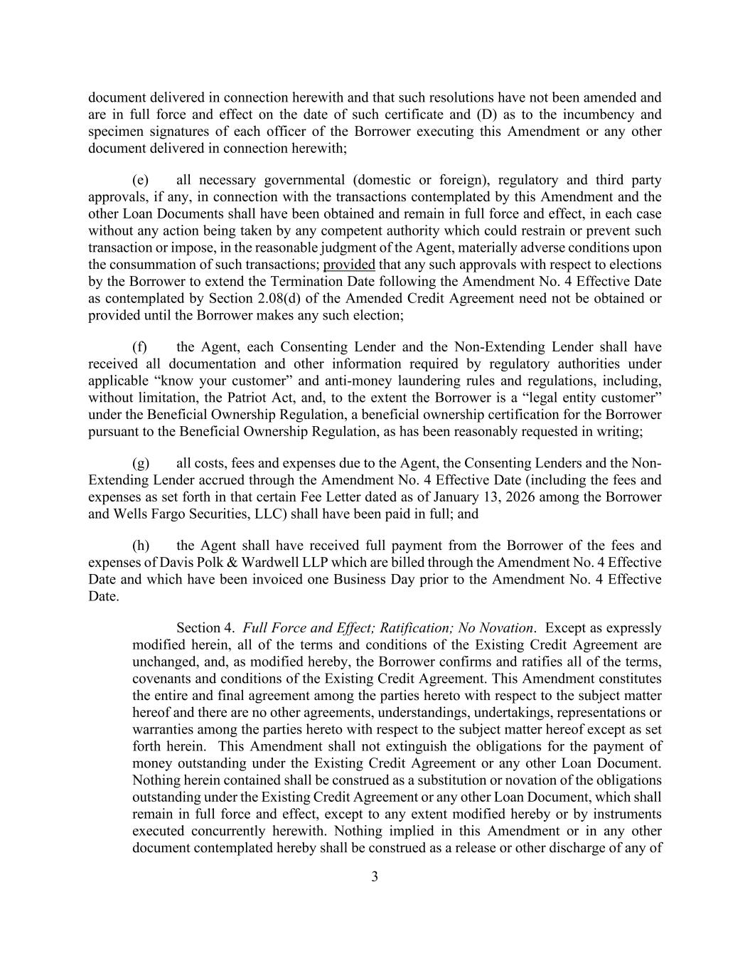 3 document delivered in connection herewith and that such resolutions have not been amended and are in full force and effect on the date of such certificate and (D) as to the incumbency and specimen signatures of each officer of the Borrower executing this Amendment or any other document delivered in connection herewith; (e) all necessary governmental (domestic or foreign), regulatory and third party approvals, if any, in connection with the transactions contemplated by this Amendment and the other Loan Documents shall have been obtained and remain in full force and effect, in each case without any action being taken by any competent authority which could restrain or prevent such transaction or impose, in the reasonable judgment of the Agent, materially adverse conditions upon the consummation of such transactions; provided that any such approvals with respect to elections by the Borrower to extend the Termination Date following the Amendment No. 4 Effective Date as contemplated by Section 2.08(d) of the Amended Credit Agreement need not be obtained or provided until the Borrower makes any such election; (f) the Agent, each Consenting Lender and the Non-Extending Lender shall have received all documentation and other information required by regulatory authorities under applicable “know your customer” and anti-money laundering rules and regulations, including, without limitation, the Patriot Act, and, to the extent the Borrower is a “legal entity customer” under the Beneficial Ownership Regulation, a beneficial ownership certification for the Borrower pursuant to the Beneficial Ownership Regulation, as has been reasonably requested in writing; (g) all costs, fees and expenses due to the Agent, the Consenting Lenders and the Non- Extending Lender accrued through the Amendment No. 4 Effective Date (including the fees and expenses as set forth in that certain Fee Letter dated as of January 13, 2026 among the Borrower and Wells Fargo Securities, LLC) shall have been paid in full; and (h) the Agent shall have received full payment from the Borrower of the fees and expenses of Davis Polk & Wardwell LLP which are billed through the Amendment No. 4 Effective Date and which have been invoiced one Business Day prior to the Amendment No. 4 Effective Date. Section 4. Full Force and Effect; Ratification; No Novation. Except as expressly modified herein, all of the terms and conditions of the Existing Credit Agreement are unchanged, and, as modified hereby, the Borrower confirms and ratifies all of the terms, covenants and conditions of the Existing Credit Agreement. This Amendment constitutes the entire and final agreement among the parties hereto with respect to the subject matter hereof and there are no other agreements, understandings, undertakings, representations or warranties among the parties hereto with respect to the subject matter hereof except as set forth herein. This Amendment shall not extinguish the obligations for the payment of money outstanding under the Existing Credit Agreement or any other Loan Document. Nothing herein contained shall be construed as a substitution or novation of the obligations outstanding under the Existing Credit Agreement or any other Loan Document, which shall remain in full force and effect, except to any extent modified hereby or by instruments executed concurrently herewith. Nothing implied in this Amendment or in any other document contemplated hereby shall be construed as a release or other discharge of any of