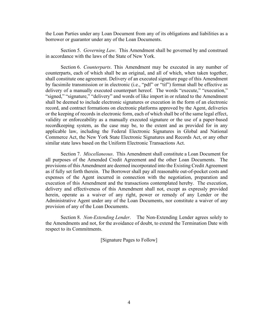 4 the Loan Parties under any Loan Document from any of its obligations and liabilities as a borrower or guarantor under any of the Loan Documents. Section 5. Governing Law. This Amendment shall be governed by and construed in accordance with the laws of the State of New York. Section 6. Counterparts. This Amendment may be executed in any number of counterparts, each of which shall be an original, and all of which, when taken together, shall constitute one agreement. Delivery of an executed signature page of this Amendment by facsimile transmission or in electronic (i.e., “pdf” or “tif”) format shall be effective as delivery of a manually executed counterpart hereof. The words “execute,” “execution,” “signed,” “signature,” “delivery” and words of like import in or related to the Amendment shall be deemed to include electronic signatures or execution in the form of an electronic record, and contract formations on electronic platforms approved by the Agent, deliveries or the keeping of records in electronic form, each of which shall be of the same legal effect, validity or enforceability as a manually executed signature or the use of a paper-based recordkeeping system, as the case may be, to the extent and as provided for in any applicable law, including the Federal Electronic Signatures in Global and National Commerce Act, the New York State Electronic Signatures and Records Act, or any other similar state laws based on the Uniform Electronic Transactions Act. Section 7. Miscellaneous. This Amendment shall constitute a Loan Document for all purposes of the Amended Credit Agreement and the other Loan Documents. The provisions of this Amendment are deemed incorporated into the Existing Credit Agreement as if fully set forth therein. The Borrower shall pay all reasonable out-of-pocket costs and expenses of the Agent incurred in connection with the negotiation, preparation and execution of this Amendment and the transactions contemplated hereby. The execution, delivery and effectiveness of this Amendment shall not, except as expressly provided herein, operate as a waiver of any right, power or remedy of any Lender or the Administrative Agent under any of the Loan Documents, nor constitute a waiver of any provision of any of the Loan Documents. Section 8. Non-Extending Lender. The Non-Extending Lender agrees solely to the Amendments and not, for the avoidance of doubt, to extend the Termination Date with respect to its Commitments. [Signature Pages to Follow]
