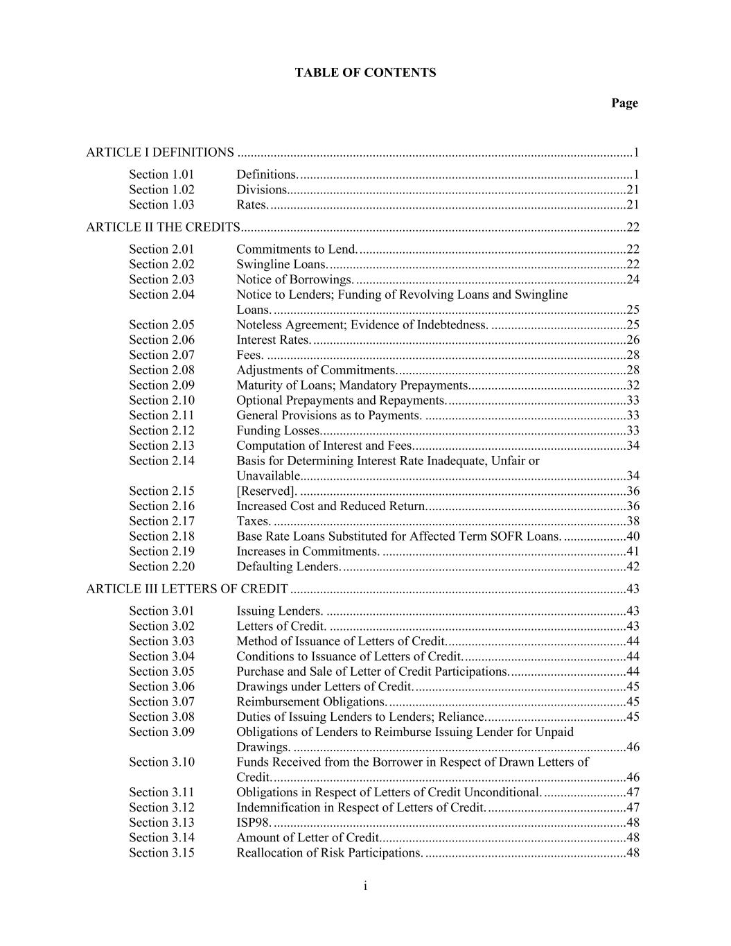 TABLE OF CONTENTS Page i ARTICLE I DEFINITIONS ........................................................................................................................ 1 Section 1.01 Definitions. ..................................................................................................... 1 Section 1.02 Divisions....................................................................................................... 21 Section 1.03 Rates. ............................................................................................................ 21 ARTICLE II THE CREDITS ..................................................................................................................... 22 Section 2.01 Commitments to Lend. ................................................................................. 22 Section 2.02 Swingline Loans. .......................................................................................... 22 Section 2.03 Notice of Borrowings. .................................................................................. 24 Section 2.04 Notice to Lenders; Funding of Revolving Loans and Swingline Loans. ........................................................................................................... 25 Section 2.05 Noteless Agreement; Evidence of Indebtedness. ......................................... 25 Section 2.06 Interest Rates. ............................................................................................... 26 Section 2.07 Fees. ............................................................................................................. 28 Section 2.08 Adjustments of Commitments. ..................................................................... 28 Section 2.09 Maturity of Loans; Mandatory Prepayments. ............................................... 32 Section 2.10 Optional Prepayments and Repayments. ...................................................... 33 Section 2.11 General Provisions as to Payments. ............................................................. 33 Section 2.12 Funding Losses. ............................................................................................ 33 Section 2.13 Computation of Interest and Fees. ................................................................ 34 Section 2.14 Basis for Determining Interest Rate Inadequate, Unfair or Unavailable................................................................................................... 34 Section 2.15 [Reserved]. ................................................................................................... 36 Section 2.16 Increased Cost and Reduced Return. ............................................................ 36 Section 2.17 Taxes. ........................................................................................................... 38 Section 2.18 Base Rate Loans Substituted for Affected Term SOFR Loans. ................... 40 Section 2.19 Increases in Commitments. .......................................................................... 41 Section 2.20 Defaulting Lenders. ...................................................................................... 42 ARTICLE III LETTERS OF CREDIT ...................................................................................................... 43 Section 3.01 Issuing Lenders. ........................................................................................... 43 Section 3.02 Letters of Credit. .......................................................................................... 43 Section 3.03 Method of Issuance of Letters of Credit. ...................................................... 44 Section 3.04 Conditions to Issuance of Letters of Credit. ................................................. 44 Section 3.05 Purchase and Sale of Letter of Credit Participations. ................................... 44 Section 3.06 Drawings under Letters of Credit. ................................................................ 45 Section 3.07 Reimbursement Obligations. ........................................................................ 45 Section 3.08 Duties of Issuing Lenders to Lenders; Reliance. .......................................... 45 Section 3.09 Obligations of Lenders to Reimburse Issuing Lender for Unpaid Drawings. ..................................................................................................... 46 Section 3.10 Funds Received from the Borrower in Respect of Drawn Letters of Credit. ........................................................................................................... 46 Section 3.11 Obligations in Respect of Letters of Credit Unconditional. ......................... 47 Section 3.12 Indemnification in Respect of Letters of Credit. .......................................... 47 Section 3.13 ISP98. ........................................................................................................... 48 Section 3.14 Amount of Letter of Credit. .......................................................................... 48 Section 3.15 Reallocation of Risk Participations. ............................................................. 48
