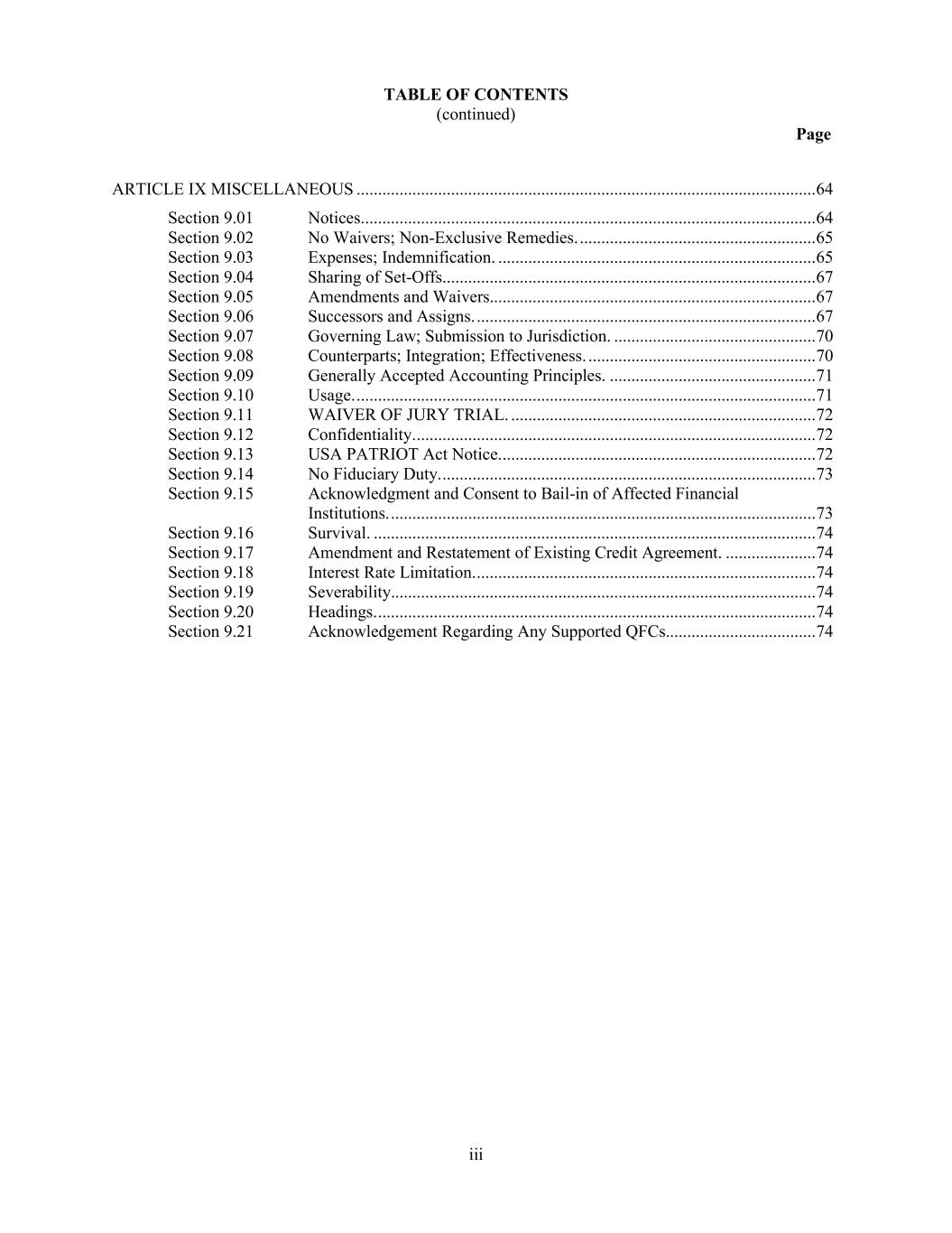 TABLE OF CONTENTS (continued) Page iii ARTICLE IX MISCELLANEOUS ........................................................................................................... 64 Section 9.01 Notices. ......................................................................................................... 64 Section 9.02 No Waivers; Non-Exclusive Remedies. ....................................................... 65 Section 9.03 Expenses; Indemnification. .......................................................................... 65 Section 9.04 Sharing of Set-Offs. ...................................................................................... 67 Section 9.05 Amendments and Waivers............................................................................ 67 Section 9.06 Successors and Assigns. ............................................................................... 67 Section 9.07 Governing Law; Submission to Jurisdiction. ............................................... 70 Section 9.08 Counterparts; Integration; Effectiveness. ..................................................... 70 Section 9.09 Generally Accepted Accounting Principles. ................................................ 71 Section 9.10 Usage. ........................................................................................................... 71 Section 9.11 WAIVER OF JURY TRIAL. ....................................................................... 72 Section 9.12 Confidentiality. ............................................................................................. 72 Section 9.13 USA PATRIOT Act Notice. ......................................................................... 72 Section 9.14 No Fiduciary Duty. ....................................................................................... 73 Section 9.15 Acknowledgment and Consent to Bail-in of Affected Financial Institutions. ................................................................................................... 73 Section 9.16 Survival. ....................................................................................................... 74 Section 9.17 Amendment and Restatement of Existing Credit Agreement. ..................... 74 Section 9.18 Interest Rate Limitation. ............................................................................... 74 Section 9.19 Severability................................................................................................... 74 Section 9.20 Headings. ...................................................................................................... 74 Section 9.21 Acknowledgement Regarding Any Supported QFCs................................... 74