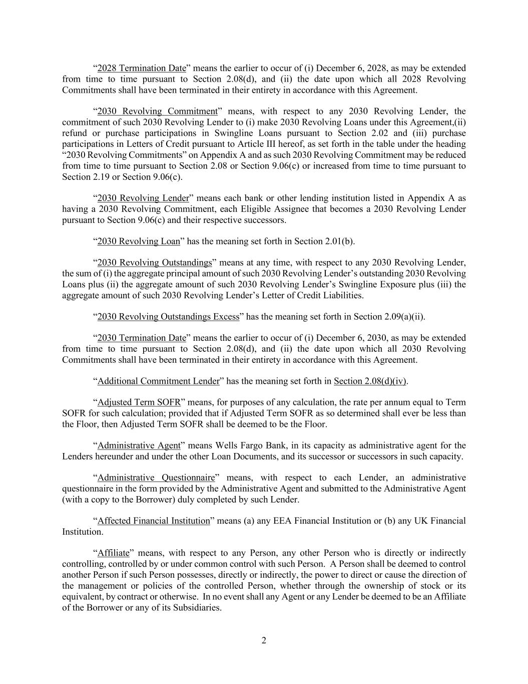 2 “2028 Termination Date” means the earlier to occur of (i) December 6, 2028, as may be extended from time to time pursuant to Section 2.08(d), and (ii) the date upon which all 2028 Revolving Commitments shall have been terminated in their entirety in accordance with this Agreement. “2030 Revolving Commitment” means, with respect to any 2030 Revolving Lender, the commitment of such 2030 Revolving Lender to (i) make 2030 Revolving Loans under this Agreement,(ii) refund or purchase participations in Swingline Loans pursuant to Section 2.02 and (iii) purchase participations in Letters of Credit pursuant to Article III hereof, as set forth in the table under the heading “2030 Revolving Commitments” on Appendix A and as such 2030 Revolving Commitment may be reduced from time to time pursuant to Section 2.08 or Section 9.06(c) or increased from time to time pursuant to Section 2.19 or Section 9.06(c). “2030 Revolving Lender” means each bank or other lending institution listed in Appendix A as having a 2030 Revolving Commitment, each Eligible Assignee that becomes a 2030 Revolving Lender pursuant to Section 9.06(c) and their respective successors. “2030 Revolving Loan” has the meaning set forth in Section 2.01(b). “2030 Revolving Outstandings” means at any time, with respect to any 2030 Revolving Lender, the sum of (i) the aggregate principal amount of such 2030 Revolving Lender’s outstanding 2030 Revolving Loans plus (ii) the aggregate amount of such 2030 Revolving Lender’s Swingline Exposure plus (iii) the aggregate amount of such 2030 Revolving Lender’s Letter of Credit Liabilities. “2030 Revolving Outstandings Excess” has the meaning set forth in Section 2.09(a)(ii). “2030 Termination Date” means the earlier to occur of (i) December 6, 2030, as may be extended from time to time pursuant to Section 2.08(d), and (ii) the date upon which all 2030 Revolving Commitments shall have been terminated in their entirety in accordance with this Agreement. “Additional Commitment Lender” has the meaning set forth in Section 2.08(d)(iv). “Adjusted Term SOFR” means, for purposes of any calculation, the rate per annum equal to Term SOFR for such calculation; provided that if Adjusted Term SOFR as so determined shall ever be less than the Floor, then Adjusted Term SOFR shall be deemed to be the Floor. “Administrative Agent” means Wells Fargo Bank, in its capacity as administrative agent for the Lenders hereunder and under the other Loan Documents, and its successor or successors in such capacity. “Administrative Questionnaire” means, with respect to each Lender, an administrative questionnaire in the form provided by the Administrative Agent and submitted to the Administrative Agent (with a copy to the Borrower) duly completed by such Lender. “Affected Financial Institution” means (a) any EEA Financial Institution or (b) any UK Financial Institution. “Affiliate” means, with respect to any Person, any other Person who is directly or indirectly controlling, controlled by or under common control with such Person. A Person shall be deemed to control another Person if such Person possesses, directly or indirectly, the power to direct or cause the direction of the management or policies of the controlled Person, whether through the ownership of stock or its equivalent, by contract or otherwise. In no event shall any Agent or any Lender be deemed to be an Affiliate of the Borrower or any of its Subsidiaries.