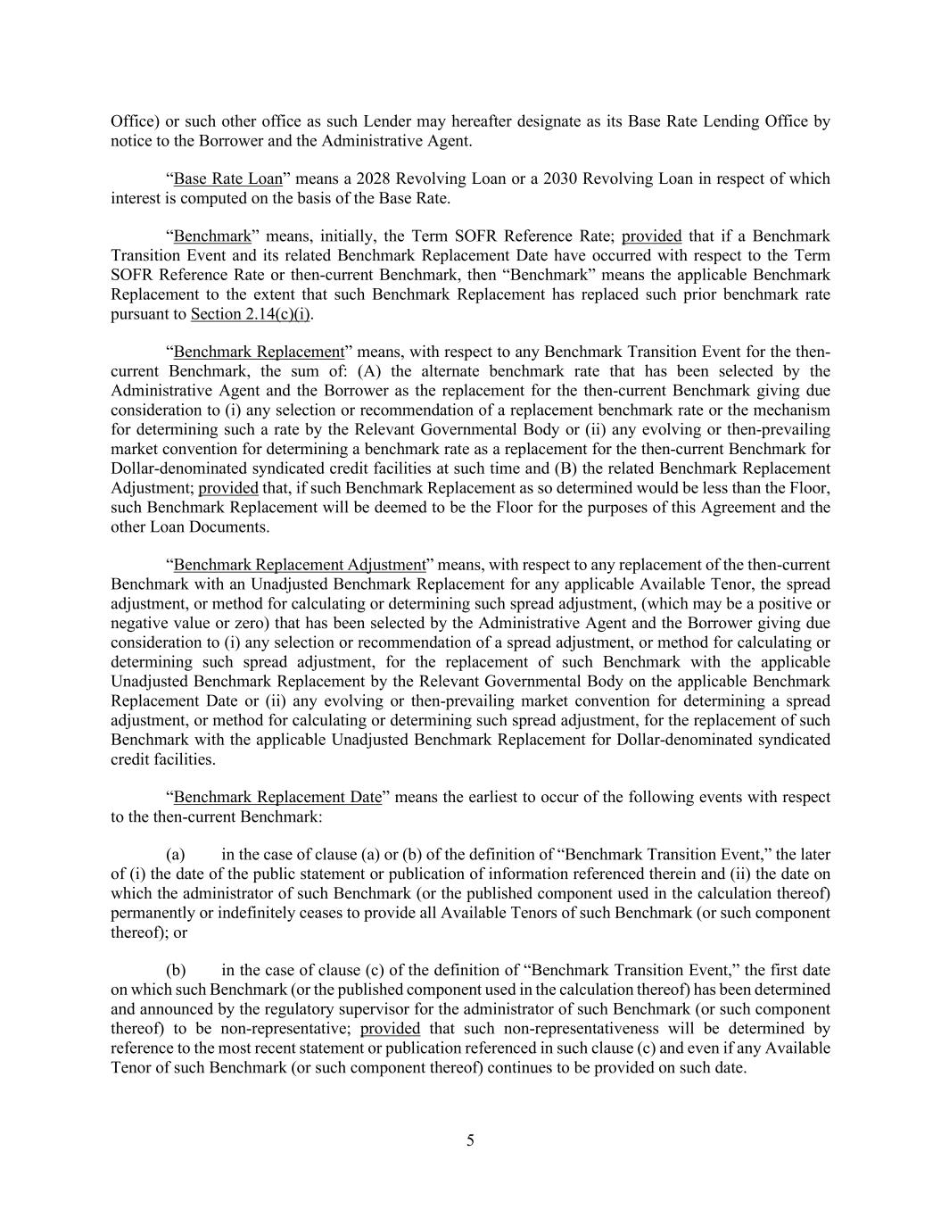 5 Office) or such other office as such Lender may hereafter designate as its Base Rate Lending Office by notice to the Borrower and the Administrative Agent. “Base Rate Loan” means a 2028 Revolving Loan or a 2030 Revolving Loan in respect of which interest is computed on the basis of the Base Rate. “Benchmark” means, initially, the Term SOFR Reference Rate; provided that if a Benchmark Transition Event and its related Benchmark Replacement Date have occurred with respect to the Term SOFR Reference Rate or then-current Benchmark, then “Benchmark” means the applicable Benchmark Replacement to the extent that such Benchmark Replacement has replaced such prior benchmark rate pursuant to Section 2.14(c)(i). “Benchmark Replacement” means, with respect to any Benchmark Transition Event for the then- current Benchmark, the sum of: (A) the alternate benchmark rate that has been selected by the Administrative Agent and the Borrower as the replacement for the then-current Benchmark giving due consideration to (i) any selection or recommendation of a replacement benchmark rate or the mechanism for determining such a rate by the Relevant Governmental Body or (ii) any evolving or then-prevailing market convention for determining a benchmark rate as a replacement for the then-current Benchmark for Dollar-denominated syndicated credit facilities at such time and (B) the related Benchmark Replacement Adjustment; provided that, if such Benchmark Replacement as so determined would be less than the Floor, such Benchmark Replacement will be deemed to be the Floor for the purposes of this Agreement and the other Loan Documents. “Benchmark Replacement Adjustment” means, with respect to any replacement of the then-current Benchmark with an Unadjusted Benchmark Replacement for any applicable Available Tenor, the spread adjustment, or method for calculating or determining such spread adjustment, (which may be a positive or negative value or zero) that has been selected by the Administrative Agent and the Borrower giving due consideration to (i) any selection or recommendation of a spread adjustment, or method for calculating or determining such spread adjustment, for the replacement of such Benchmark with the applicable Unadjusted Benchmark Replacement by the Relevant Governmental Body on the applicable Benchmark Replacement Date or (ii) any evolving or then-prevailing market convention for determining a spread adjustment, or method for calculating or determining such spread adjustment, for the replacement of such Benchmark with the applicable Unadjusted Benchmark Replacement for Dollar-denominated syndicated credit facilities. “Benchmark Replacement Date” means the earliest to occur of the following events with respect to the then-current Benchmark: (a) in the case of clause (a) or (b) of the definition of “Benchmark Transition Event,” the later of (i) the date of the public statement or publication of information referenced therein and (ii) the date on which the administrator of such Benchmark (or the published component used in the calculation thereof) permanently or indefinitely ceases to provide all Available Tenors of such Benchmark (or such component thereof); or (b) in the case of clause (c) of the definition of “Benchmark Transition Event,” the first date on which such Benchmark (or the published component used in the calculation thereof) has been determined and announced by the regulatory supervisor for the administrator of such Benchmark (or such component thereof) to be non-representative; provided that such non-representativeness will be determined by reference to the most recent statement or publication referenced in such clause (c) and even if any Available Tenor of such Benchmark (or such component thereof) continues to be provided on such date.