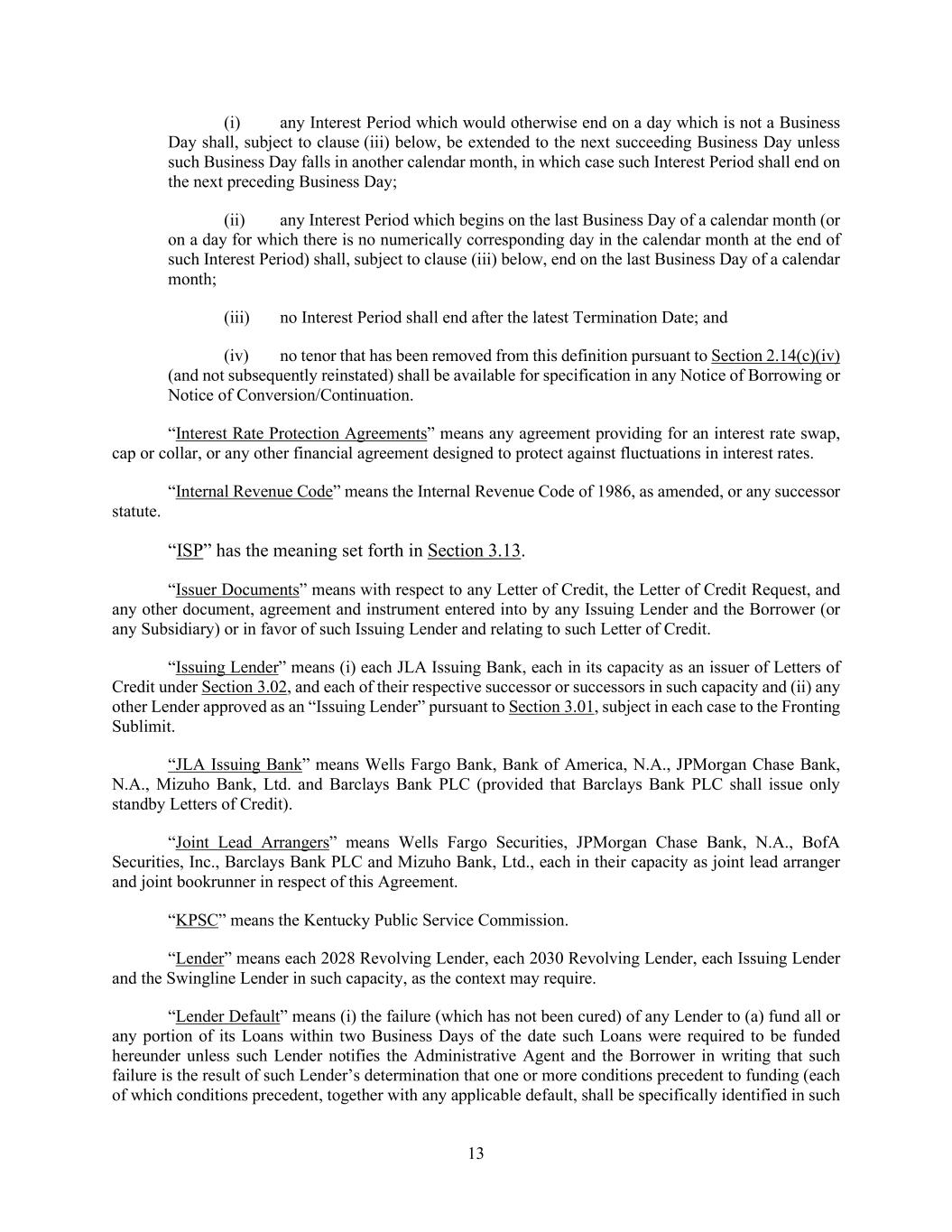 13 (i) any Interest Period which would otherwise end on a day which is not a Business Day shall, subject to clause (iii) below, be extended to the next succeeding Business Day unless such Business Day falls in another calendar month, in which case such Interest Period shall end on the next preceding Business Day; (ii) any Interest Period which begins on the last Business Day of a calendar month (or on a day for which there is no numerically corresponding day in the calendar month at the end of such Interest Period) shall, subject to clause (iii) below, end on the last Business Day of a calendar month; (iii) no Interest Period shall end after the latest Termination Date; and (iv) no tenor that has been removed from this definition pursuant to Section 2.14(c)(iv) (and not subsequently reinstated) shall be available for specification in any Notice of Borrowing or Notice of Conversion/Continuation. “Interest Rate Protection Agreements” means any agreement providing for an interest rate swap, cap or collar, or any other financial agreement designed to protect against fluctuations in interest rates. “Internal Revenue Code” means the Internal Revenue Code of 1986, as amended, or any successor statute. “ISP” has the meaning set forth in Section 3.13. “Issuer Documents” means with respect to any Letter of Credit, the Letter of Credit Request, and any other document, agreement and instrument entered into by any Issuing Lender and the Borrower (or any Subsidiary) or in favor of such Issuing Lender and relating to such Letter of Credit. “Issuing Lender” means (i) each JLA Issuing Bank, each in its capacity as an issuer of Letters of Credit under Section 3.02, and each of their respective successor or successors in such capacity and (ii) any other Lender approved as an “Issuing Lender” pursuant to Section 3.01, subject in each case to the Fronting Sublimit. “JLA Issuing Bank” means Wells Fargo Bank, Bank of America, N.A., JPMorgan Chase Bank, N.A., Mizuho Bank, Ltd. and Barclays Bank PLC (provided that Barclays Bank PLC shall issue only standby Letters of Credit). “Joint Lead Arrangers” means Wells Fargo Securities, JPMorgan Chase Bank, N.A., BofA Securities, Inc., Barclays Bank PLC and Mizuho Bank, Ltd., each in their capacity as joint lead arranger and joint bookrunner in respect of this Agreement. “KPSC” means the Kentucky Public Service Commission. “Lender” means each 2028 Revolving Lender, each 2030 Revolving Lender, each Issuing Lender and the Swingline Lender in such capacity, as the context may require. “Lender Default” means (i) the failure (which has not been cured) of any Lender to (a) fund all or any portion of its Loans within two Business Days of the date such Loans were required to be funded hereunder unless such Lender notifies the Administrative Agent and the Borrower in writing that such failure is the result of such Lender’s determination that one or more conditions precedent to funding (each of which conditions precedent, together with any applicable default, shall be specifically identified in such