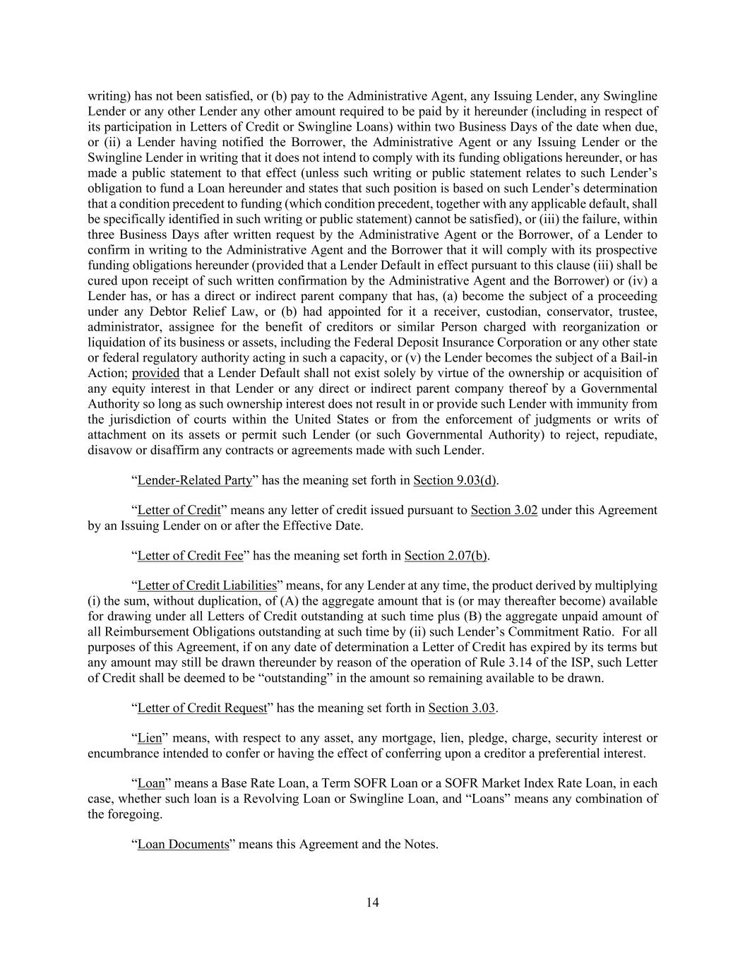 14 writing) has not been satisfied, or (b) pay to the Administrative Agent, any Issuing Lender, any Swingline Lender or any other Lender any other amount required to be paid by it hereunder (including in respect of its participation in Letters of Credit or Swingline Loans) within two Business Days of the date when due, or (ii) a Lender having notified the Borrower, the Administrative Agent or any Issuing Lender or the Swingline Lender in writing that it does not intend to comply with its funding obligations hereunder, or has made a public statement to that effect (unless such writing or public statement relates to such Lender’s obligation to fund a Loan hereunder and states that such position is based on such Lender’s determination that a condition precedent to funding (which condition precedent, together with any applicable default, shall be specifically identified in such writing or public statement) cannot be satisfied), or (iii) the failure, within three Business Days after written request by the Administrative Agent or the Borrower, of a Lender to confirm in writing to the Administrative Agent and the Borrower that it will comply with its prospective funding obligations hereunder (provided that a Lender Default in effect pursuant to this clause (iii) shall be cured upon receipt of such written confirmation by the Administrative Agent and the Borrower) or (iv) a Lender has, or has a direct or indirect parent company that has, (a) become the subject of a proceeding under any Debtor Relief Law, or (b) had appointed for it a receiver, custodian, conservator, trustee, administrator, assignee for the benefit of creditors or similar Person charged with reorganization or liquidation of its business or assets, including the Federal Deposit Insurance Corporation or any other state or federal regulatory authority acting in such a capacity, or (v) the Lender becomes the subject of a Bail-in Action; provided that a Lender Default shall not exist solely by virtue of the ownership or acquisition of any equity interest in that Lender or any direct or indirect parent company thereof by a Governmental Authority so long as such ownership interest does not result in or provide such Lender with immunity from the jurisdiction of courts within the United States or from the enforcement of judgments or writs of attachment on its assets or permit such Lender (or such Governmental Authority) to reject, repudiate, disavow or disaffirm any contracts or agreements made with such Lender. “Lender-Related Party” has the meaning set forth in Section 9.03(d). “Letter of Credit” means any letter of credit issued pursuant to Section 3.02 under this Agreement by an Issuing Lender on or after the Effective Date. “Letter of Credit Fee” has the meaning set forth in Section 2.07(b). “Letter of Credit Liabilities” means, for any Lender at any time, the product derived by multiplying (i) the sum, without duplication, of (A) the aggregate amount that is (or may thereafter become) available for drawing under all Letters of Credit outstanding at such time plus (B) the aggregate unpaid amount of all Reimbursement Obligations outstanding at such time by (ii) such Lender’s Commitment Ratio. For all purposes of this Agreement, if on any date of determination a Letter of Credit has expired by its terms but any amount may still be drawn thereunder by reason of the operation of Rule 3.14 of the ISP, such Letter of Credit shall be deemed to be “outstanding” in the amount so remaining available to be drawn. “Letter of Credit Request” has the meaning set forth in Section 3.03. “Lien” means, with respect to any asset, any mortgage, lien, pledge, charge, security interest or encumbrance intended to confer or having the effect of conferring upon a creditor a preferential interest. “Loan” means a Base Rate Loan, a Term SOFR Loan or a SOFR Market Index Rate Loan, in each case, whether such loan is a Revolving Loan or Swingline Loan, and “Loans” means any combination of the foregoing. “Loan Documents” means this Agreement and the Notes.