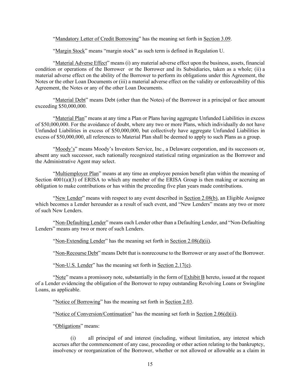 15 “Mandatory Letter of Credit Borrowing” has the meaning set forth in Section 3.09. “Margin Stock” means “margin stock” as such term is defined in Regulation U. “Material Adverse Effect” means (i) any material adverse effect upon the business, assets, financial condition or operations of the Borrower or the Borrower and its Subsidiaries, taken as a whole; (ii) a material adverse effect on the ability of the Borrower to perform its obligations under this Agreement, the Notes or the other Loan Documents or (iii) a material adverse effect on the validity or enforceability of this Agreement, the Notes or any of the other Loan Documents. “Material Debt” means Debt (other than the Notes) of the Borrower in a principal or face amount exceeding $50,000,000. “Material Plan” means at any time a Plan or Plans having aggregate Unfunded Liabilities in excess of $50,000,000. For the avoidance of doubt, where any two or more Plans, which individually do not have Unfunded Liabilities in excess of $50,000,000, but collectively have aggregate Unfunded Liabilities in excess of $50,000,000, all references to Material Plan shall be deemed to apply to such Plans as a group. “Moody’s” means Moody’s Investors Service, Inc., a Delaware corporation, and its successors or, absent any such successor, such nationally recognized statistical rating organization as the Borrower and the Administrative Agent may select. “Multiemployer Plan” means at any time an employee pension benefit plan within the meaning of Section 4001(a)(3) of ERISA to which any member of the ERISA Group is then making or accruing an obligation to make contributions or has within the preceding five plan years made contributions. “New Lender” means with respect to any event described in Section 2.08(b), an Eligible Assignee which becomes a Lender hereunder as a result of such event, and “New Lenders” means any two or more of such New Lenders. “Non-Defaulting Lender” means each Lender other than a Defaulting Lender, and “Non-Defaulting Lenders” means any two or more of such Lenders. “Non-Extending Lender” has the meaning set forth in Section 2.08(d)(ii). “Non-Recourse Debt” means Debt that is nonrecourse to the Borrower or any asset of the Borrower. “Non-U.S. Lender” has the meaning set forth in Section 2.17(e). “Note” means a promissory note, substantially in the form of Exhibit B hereto, issued at the request of a Lender evidencing the obligation of the Borrower to repay outstanding Revolving Loans or Swingline Loans, as applicable. “Notice of Borrowing” has the meaning set forth in Section 2.03. “Notice of Conversion/Continuation” has the meaning set forth in Section 2.06(d)(ii). “Obligations” means: (i) all principal of and interest (including, without limitation, any interest which accrues after the commencement of any case, proceeding or other action relating to the bankruptcy, insolvency or reorganization of the Borrower, whether or not allowed or allowable as a claim in