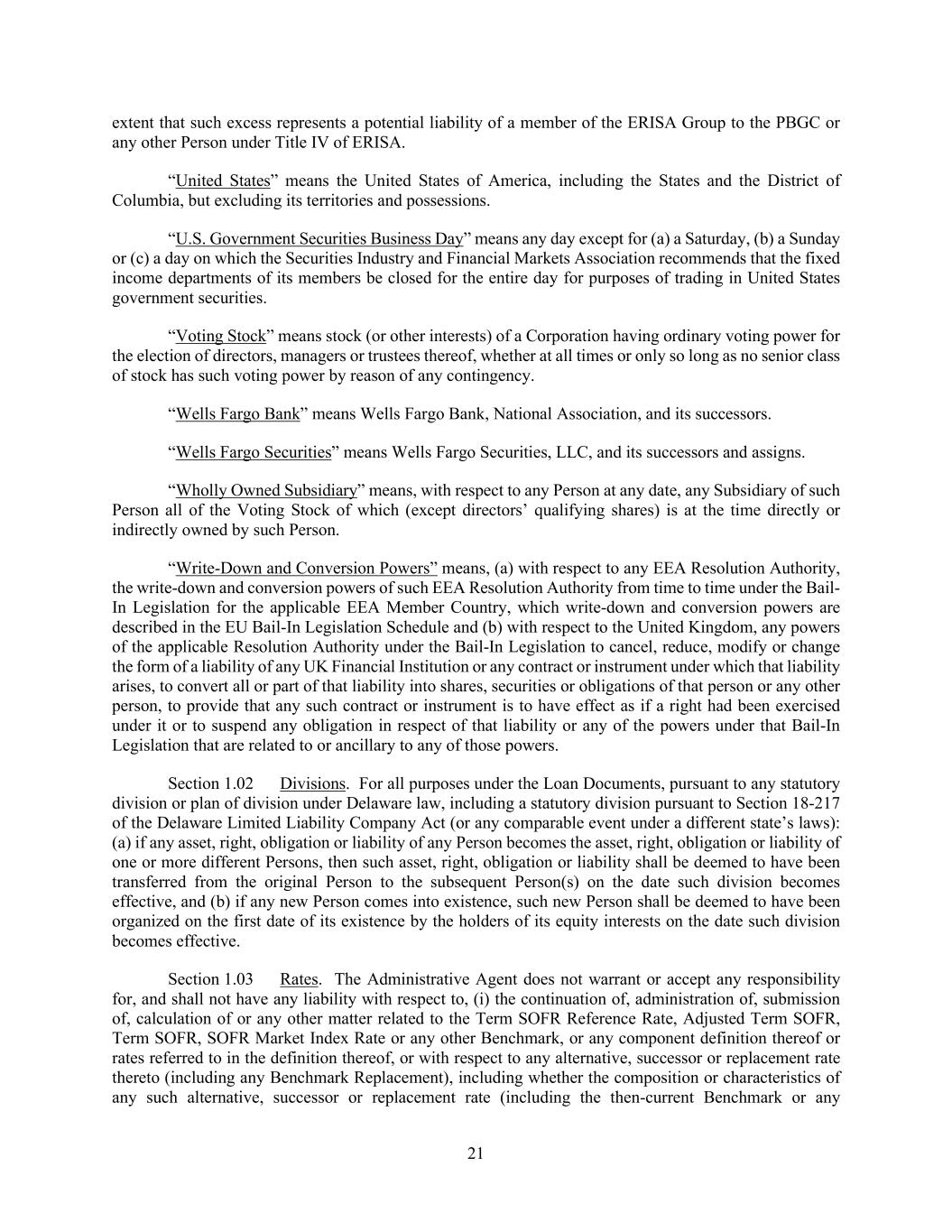 21 extent that such excess represents a potential liability of a member of the ERISA Group to the PBGC or any other Person under Title IV of ERISA. “United States” means the United States of America, including the States and the District of Columbia, but excluding its territories and possessions. “U.S. Government Securities Business Day” means any day except for (a) a Saturday, (b) a Sunday or (c) a day on which the Securities Industry and Financial Markets Association recommends that the fixed income departments of its members be closed for the entire day for purposes of trading in United States government securities. “Voting Stock” means stock (or other interests) of a Corporation having ordinary voting power for the election of directors, managers or trustees thereof, whether at all times or only so long as no senior class of stock has such voting power by reason of any contingency. “Wells Fargo Bank” means Wells Fargo Bank, National Association, and its successors. “Wells Fargo Securities” means Wells Fargo Securities, LLC, and its successors and assigns. “Wholly Owned Subsidiary” means, with respect to any Person at any date, any Subsidiary of such Person all of the Voting Stock of which (except directors’ qualifying shares) is at the time directly or indirectly owned by such Person. “Write-Down and Conversion Powers” means, (a) with respect to any EEA Resolution Authority, the write-down and conversion powers of such EEA Resolution Authority from time to time under the Bail- In Legislation for the applicable EEA Member Country, which write-down and conversion powers are described in the EU Bail-In Legislation Schedule and (b) with respect to the United Kingdom, any powers of the applicable Resolution Authority under the Bail-In Legislation to cancel, reduce, modify or change the form of a liability of any UK Financial Institution or any contract or instrument under which that liability arises, to convert all or part of that liability into shares, securities or obligations of that person or any other person, to provide that any such contract or instrument is to have effect as if a right had been exercised under it or to suspend any obligation in respect of that liability or any of the powers under that Bail-In Legislation that are related to or ancillary to any of those powers. Section 1.02 Divisions. For all purposes under the Loan Documents, pursuant to any statutory division or plan of division under Delaware law, including a statutory division pursuant to Section 18-217 of the Delaware Limited Liability Company Act (or any comparable event under a different state’s laws): (a) if any asset, right, obligation or liability of any Person becomes the asset, right, obligation or liability of one or more different Persons, then such asset, right, obligation or liability shall be deemed to have been transferred from the original Person to the subsequent Person(s) on the date such division becomes effective, and (b) if any new Person comes into existence, such new Person shall be deemed to have been organized on the first date of its existence by the holders of its equity interests on the date such division becomes effective. Section 1.03 Rates. The Administrative Agent does not warrant or accept any responsibility for, and shall not have any liability with respect to, (i) the continuation of, administration of, submission of, calculation of or any other matter related to the Term SOFR Reference Rate, Adjusted Term SOFR, Term SOFR, SOFR Market Index Rate or any other Benchmark, or any component definition thereof or rates referred to in the definition thereof, or with respect to any alternative, successor or replacement rate thereto (including any Benchmark Replacement), including whether the composition or characteristics of any such alternative, successor or replacement rate (including the then-current Benchmark or any