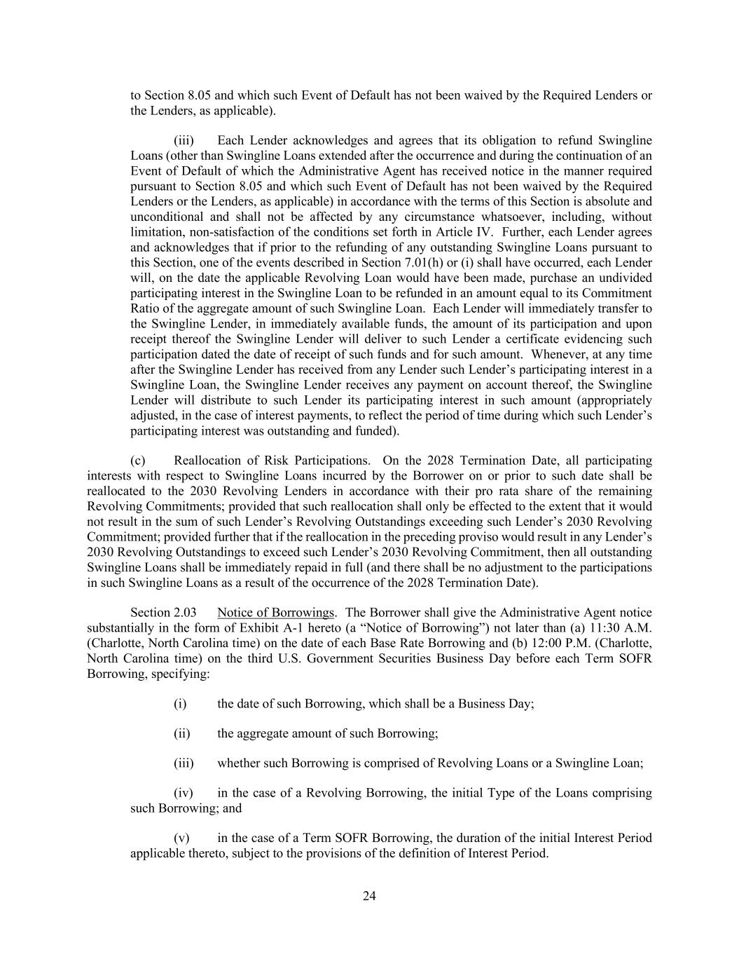 24 to Section 8.05 and which such Event of Default has not been waived by the Required Lenders or the Lenders, as applicable). (iii) Each Lender acknowledges and agrees that its obligation to refund Swingline Loans (other than Swingline Loans extended after the occurrence and during the continuation of an Event of Default of which the Administrative Agent has received notice in the manner required pursuant to Section 8.05 and which such Event of Default has not been waived by the Required Lenders or the Lenders, as applicable) in accordance with the terms of this Section is absolute and unconditional and shall not be affected by any circumstance whatsoever, including, without limitation, non-satisfaction of the conditions set forth in Article IV. Further, each Lender agrees and acknowledges that if prior to the refunding of any outstanding Swingline Loans pursuant to this Section, one of the events described in Section 7.01(h) or (i) shall have occurred, each Lender will, on the date the applicable Revolving Loan would have been made, purchase an undivided participating interest in the Swingline Loan to be refunded in an amount equal to its Commitment Ratio of the aggregate amount of such Swingline Loan. Each Lender will immediately transfer to the Swingline Lender, in immediately available funds, the amount of its participation and upon receipt thereof the Swingline Lender will deliver to such Lender a certificate evidencing such participation dated the date of receipt of such funds and for such amount. Whenever, at any time after the Swingline Lender has received from any Lender such Lender’s participating interest in a Swingline Loan, the Swingline Lender receives any payment on account thereof, the Swingline Lender will distribute to such Lender its participating interest in such amount (appropriately adjusted, in the case of interest payments, to reflect the period of time during which such Lender’s participating interest was outstanding and funded). (c) Reallocation of Risk Participations. On the 2028 Termination Date, all participating interests with respect to Swingline Loans incurred by the Borrower on or prior to such date shall be reallocated to the 2030 Revolving Lenders in accordance with their pro rata share of the remaining Revolving Commitments; provided that such reallocation shall only be effected to the extent that it would not result in the sum of such Lender’s Revolving Outstandings exceeding such Lender’s 2030 Revolving Commitment; provided further that if the reallocation in the preceding proviso would result in any Lender’s 2030 Revolving Outstandings to exceed such Lender’s 2030 Revolving Commitment, then all outstanding Swingline Loans shall be immediately repaid in full (and there shall be no adjustment to the participations in such Swingline Loans as a result of the occurrence of the 2028 Termination Date). Section 2.03 Notice of Borrowings. The Borrower shall give the Administrative Agent notice substantially in the form of Exhibit A-1 hereto (a “Notice of Borrowing”) not later than (a) 11:30 A.M. (Charlotte, North Carolina time) on the date of each Base Rate Borrowing and (b) 12:00 P.M. (Charlotte, North Carolina time) on the third U.S. Government Securities Business Day before each Term SOFR Borrowing, specifying: (i) the date of such Borrowing, which shall be a Business Day; (ii) the aggregate amount of such Borrowing; (iii) whether such Borrowing is comprised of Revolving Loans or a Swingline Loan; (iv) in the case of a Revolving Borrowing, the initial Type of the Loans comprising such Borrowing; and (v) in the case of a Term SOFR Borrowing, the duration of the initial Interest Period applicable thereto, subject to the provisions of the definition of Interest Period.