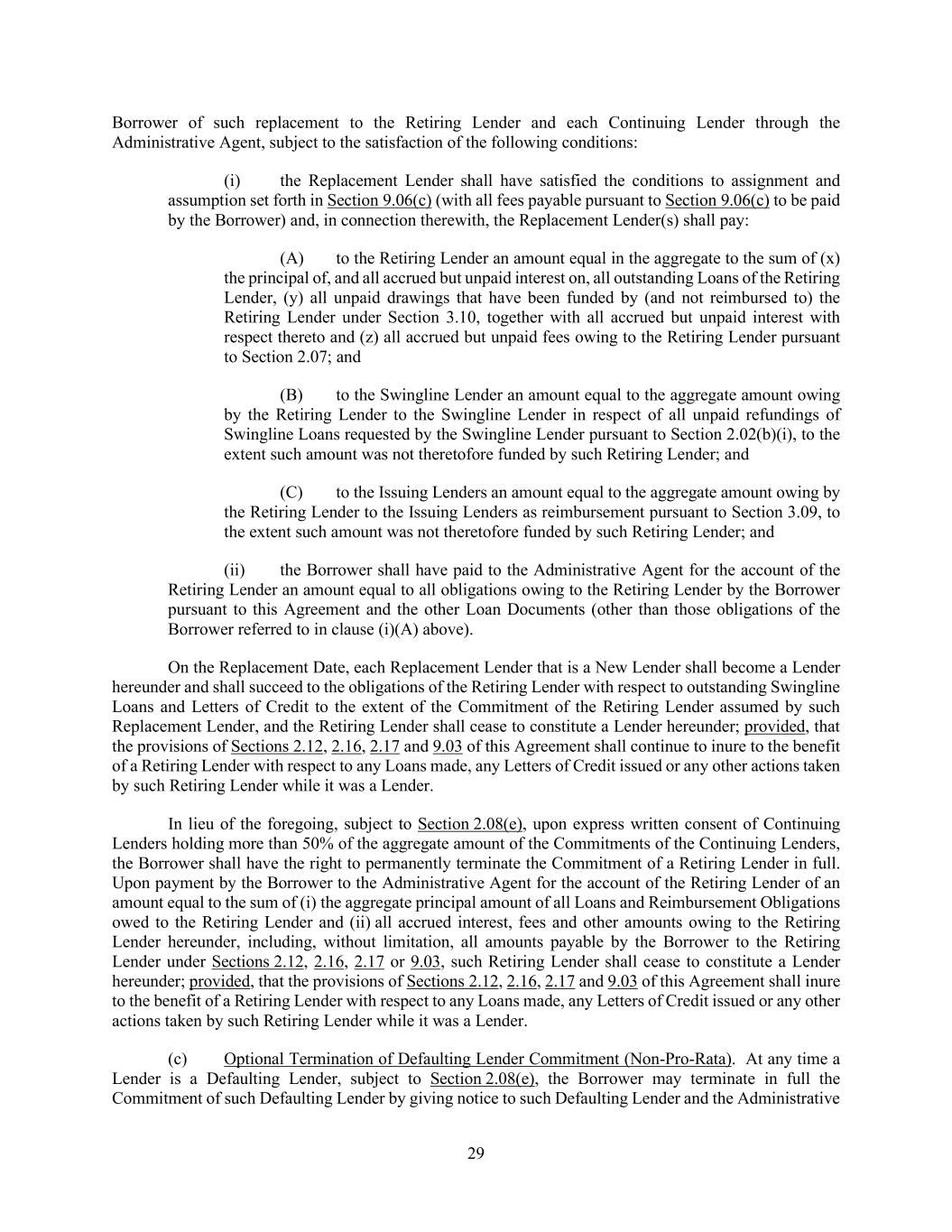 29 Borrower of such replacement to the Retiring Lender and each Continuing Lender through the Administrative Agent, subject to the satisfaction of the following conditions: (i) the Replacement Lender shall have satisfied the conditions to assignment and assumption set forth in Section 9.06(c) (with all fees payable pursuant to Section 9.06(c) to be paid by the Borrower) and, in connection therewith, the Replacement Lender(s) shall pay: (A) to the Retiring Lender an amount equal in the aggregate to the sum of (x) the principal of, and all accrued but unpaid interest on, all outstanding Loans of the Retiring Lender, (y) all unpaid drawings that have been funded by (and not reimbursed to) the Retiring Lender under Section 3.10, together with all accrued but unpaid interest with respect thereto and (z) all accrued but unpaid fees owing to the Retiring Lender pursuant to Section 2.07; and (B) to the Swingline Lender an amount equal to the aggregate amount owing by the Retiring Lender to the Swingline Lender in respect of all unpaid refundings of Swingline Loans requested by the Swingline Lender pursuant to Section 2.02(b)(i), to the extent such amount was not theretofore funded by such Retiring Lender; and (C) to the Issuing Lenders an amount equal to the aggregate amount owing by the Retiring Lender to the Issuing Lenders as reimbursement pursuant to Section 3.09, to the extent such amount was not theretofore funded by such Retiring Lender; and (ii) the Borrower shall have paid to the Administrative Agent for the account of the Retiring Lender an amount equal to all obligations owing to the Retiring Lender by the Borrower pursuant to this Agreement and the other Loan Documents (other than those obligations of the Borrower referred to in clause (i)(A) above). On the Replacement Date, each Replacement Lender that is a New Lender shall become a Lender hereunder and shall succeed to the obligations of the Retiring Lender with respect to outstanding Swingline Loans and Letters of Credit to the extent of the Commitment of the Retiring Lender assumed by such Replacement Lender, and the Retiring Lender shall cease to constitute a Lender hereunder; provided, that the provisions of Sections 2.12, 2.16, 2.17 and 9.03 of this Agreement shall continue to inure to the benefit of a Retiring Lender with respect to any Loans made, any Letters of Credit issued or any other actions taken by such Retiring Lender while it was a Lender. In lieu of the foregoing, subject to Section 2.08(e), upon express written consent of Continuing Lenders holding more than 50% of the aggregate amount of the Commitments of the Continuing Lenders, the Borrower shall have the right to permanently terminate the Commitment of a Retiring Lender in full. Upon payment by the Borrower to the Administrative Agent for the account of the Retiring Lender of an amount equal to the sum of (i) the aggregate principal amount of all Loans and Reimbursement Obligations owed to the Retiring Lender and (ii) all accrued interest, fees and other amounts owing to the Retiring Lender hereunder, including, without limitation, all amounts payable by the Borrower to the Retiring Lender under Sections 2.12, 2.16, 2.17 or 9.03, such Retiring Lender shall cease to constitute a Lender hereunder; provided, that the provisions of Sections 2.12, 2.16, 2.17 and 9.03 of this Agreement shall inure to the benefit of a Retiring Lender with respect to any Loans made, any Letters of Credit issued or any other actions taken by such Retiring Lender while it was a Lender. (c) Optional Termination of Defaulting Lender Commitment (Non-Pro-Rata). At any time a Lender is a Defaulting Lender, subject to Section 2.08(e), the Borrower may terminate in full the Commitment of such Defaulting Lender by giving notice to such Defaulting Lender and the Administrative