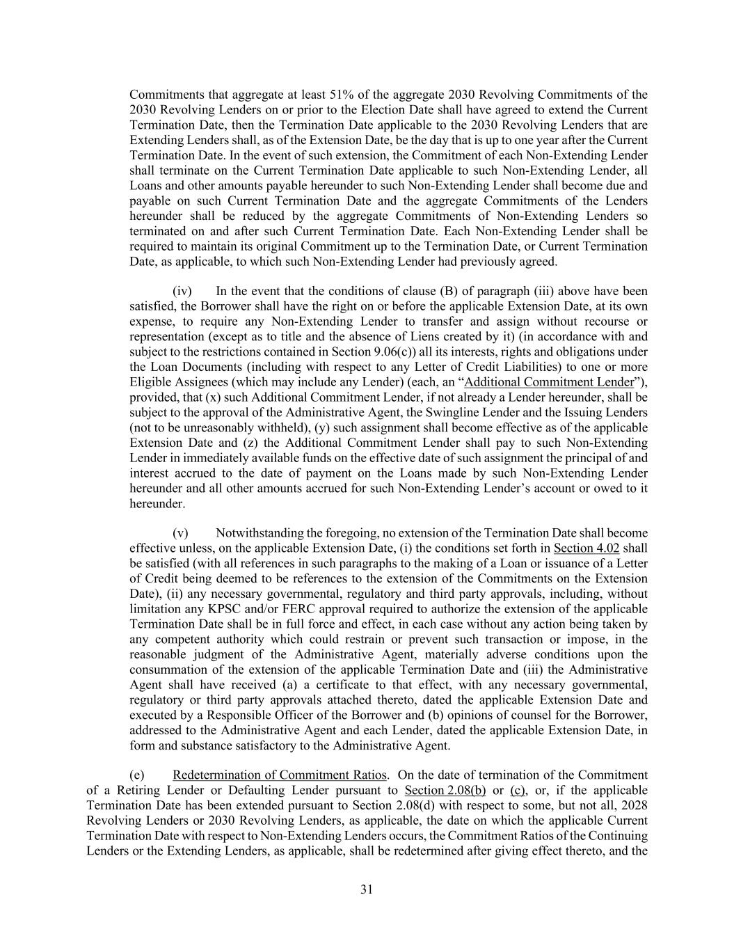 31 Commitments that aggregate at least 51% of the aggregate 2030 Revolving Commitments of the 2030 Revolving Lenders on or prior to the Election Date shall have agreed to extend the Current Termination Date, then the Termination Date applicable to the 2030 Revolving Lenders that are Extending Lenders shall, as of the Extension Date, be the day that is up to one year after the Current Termination Date. In the event of such extension, the Commitment of each Non-Extending Lender shall terminate on the Current Termination Date applicable to such Non-Extending Lender, all Loans and other amounts payable hereunder to such Non-Extending Lender shall become due and payable on such Current Termination Date and the aggregate Commitments of the Lenders hereunder shall be reduced by the aggregate Commitments of Non-Extending Lenders so terminated on and after such Current Termination Date. Each Non-Extending Lender shall be required to maintain its original Commitment up to the Termination Date, or Current Termination Date, as applicable, to which such Non-Extending Lender had previously agreed. (iv) In the event that the conditions of clause (B) of paragraph (iii) above have been satisfied, the Borrower shall have the right on or before the applicable Extension Date, at its own expense, to require any Non-Extending Lender to transfer and assign without recourse or representation (except as to title and the absence of Liens created by it) (in accordance with and subject to the restrictions contained in Section 9.06(c)) all its interests, rights and obligations under the Loan Documents (including with respect to any Letter of Credit Liabilities) to one or more Eligible Assignees (which may include any Lender) (each, an “Additional Commitment Lender”), provided, that (x) such Additional Commitment Lender, if not already a Lender hereunder, shall be subject to the approval of the Administrative Agent, the Swingline Lender and the Issuing Lenders (not to be unreasonably withheld), (y) such assignment shall become effective as of the applicable Extension Date and (z) the Additional Commitment Lender shall pay to such Non-Extending Lender in immediately available funds on the effective date of such assignment the principal of and interest accrued to the date of payment on the Loans made by such Non-Extending Lender hereunder and all other amounts accrued for such Non-Extending Lender’s account or owed to it hereunder. (v) Notwithstanding the foregoing, no extension of the Termination Date shall become effective unless, on the applicable Extension Date, (i) the conditions set forth in Section 4.02 shall be satisfied (with all references in such paragraphs to the making of a Loan or issuance of a Letter of Credit being deemed to be references to the extension of the Commitments on the Extension Date), (ii) any necessary governmental, regulatory and third party approvals, including, without limitation any KPSC and/or FERC approval required to authorize the extension of the applicable Termination Date shall be in full force and effect, in each case without any action being taken by any competent authority which could restrain or prevent such transaction or impose, in the reasonable judgment of the Administrative Agent, materially adverse conditions upon the consummation of the extension of the applicable Termination Date and (iii) the Administrative Agent shall have received (a) a certificate to that effect, with any necessary governmental, regulatory or third party approvals attached thereto, dated the applicable Extension Date and executed by a Responsible Officer of the Borrower and (b) opinions of counsel for the Borrower, addressed to the Administrative Agent and each Lender, dated the applicable Extension Date, in form and substance satisfactory to the Administrative Agent. (e) Redetermination of Commitment Ratios. On the date of termination of the Commitment of a Retiring Lender or Defaulting Lender pursuant to Section 2.08(b) or (c), or, if the applicable Termination Date has been extended pursuant to Section 2.08(d) with respect to some, but not all, 2028 Revolving Lenders or 2030 Revolving Lenders, as applicable, the date on which the applicable Current Termination Date with respect to Non-Extending Lenders occurs, the Commitment Ratios of the Continuing Lenders or the Extending Lenders, as applicable, shall be redetermined after giving effect thereto, and the