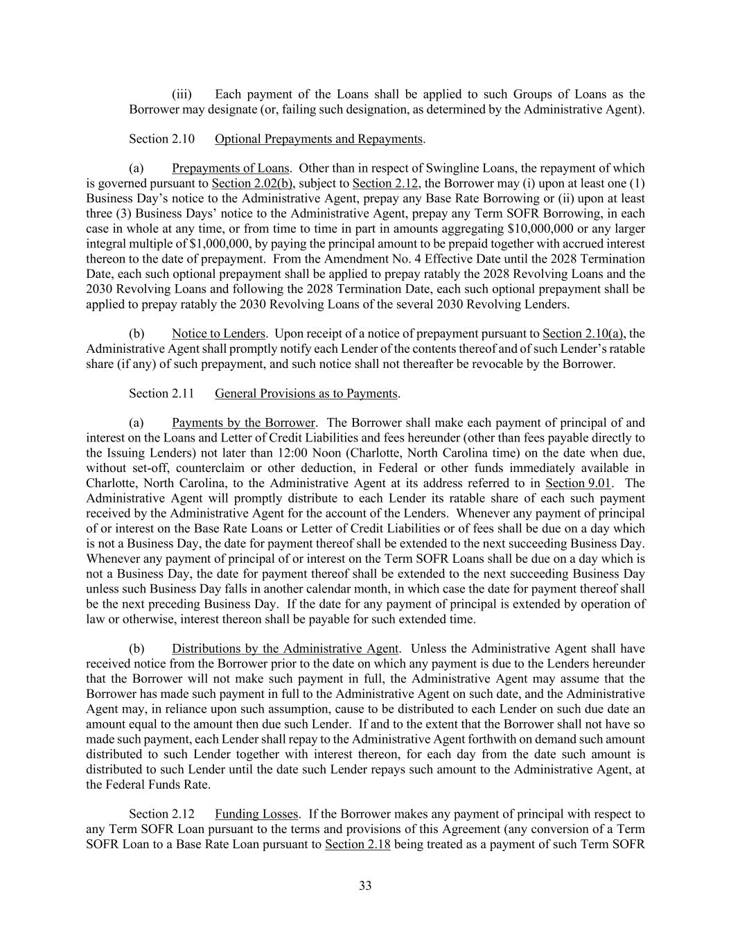 33 (iii) Each payment of the Loans shall be applied to such Groups of Loans as the Borrower may designate (or, failing such designation, as determined by the Administrative Agent). Section 2.10 Optional Prepayments and Repayments. (a) Prepayments of Loans. Other than in respect of Swingline Loans, the repayment of which is governed pursuant to Section 2.02(b), subject to Section 2.12, the Borrower may (i) upon at least one (1) Business Day’s notice to the Administrative Agent, prepay any Base Rate Borrowing or (ii) upon at least three (3) Business Days’ notice to the Administrative Agent, prepay any Term SOFR Borrowing, in each case in whole at any time, or from time to time in part in amounts aggregating $10,000,000 or any larger integral multiple of $1,000,000, by paying the principal amount to be prepaid together with accrued interest thereon to the date of prepayment. From the Amendment No. 4 Effective Date until the 2028 Termination Date, each such optional prepayment shall be applied to prepay ratably the 2028 Revolving Loans and the 2030 Revolving Loans and following the 2028 Termination Date, each such optional prepayment shall be applied to prepay ratably the 2030 Revolving Loans of the several 2030 Revolving Lenders. (b) Notice to Lenders. Upon receipt of a notice of prepayment pursuant to Section 2.10(a), the Administrative Agent shall promptly notify each Lender of the contents thereof and of such Lender’s ratable share (if any) of such prepayment, and such notice shall not thereafter be revocable by the Borrower. Section 2.11 General Provisions as to Payments. (a) Payments by the Borrower. The Borrower shall make each payment of principal of and interest on the Loans and Letter of Credit Liabilities and fees hereunder (other than fees payable directly to the Issuing Lenders) not later than 12:00 Noon (Charlotte, North Carolina time) on the date when due, without set-off, counterclaim or other deduction, in Federal or other funds immediately available in Charlotte, North Carolina, to the Administrative Agent at its address referred to in Section 9.01. The Administrative Agent will promptly distribute to each Lender its ratable share of each such payment received by the Administrative Agent for the account of the Lenders. Whenever any payment of principal of or interest on the Base Rate Loans or Letter of Credit Liabilities or of fees shall be due on a day which is not a Business Day, the date for payment thereof shall be extended to the next succeeding Business Day. Whenever any payment of principal of or interest on the Term SOFR Loans shall be due on a day which is not a Business Day, the date for payment thereof shall be extended to the next succeeding Business Day unless such Business Day falls in another calendar month, in which case the date for payment thereof shall be the next preceding Business Day. If the date for any payment of principal is extended by operation of law or otherwise, interest thereon shall be payable for such extended time. (b) Distributions by the Administrative Agent. Unless the Administrative Agent shall have received notice from the Borrower prior to the date on which any payment is due to the Lenders hereunder that the Borrower will not make such payment in full, the Administrative Agent may assume that the Borrower has made such payment in full to the Administrative Agent on such date, and the Administrative Agent may, in reliance upon such assumption, cause to be distributed to each Lender on such due date an amount equal to the amount then due such Lender. If and to the extent that the Borrower shall not have so made such payment, each Lender shall repay to the Administrative Agent forthwith on demand such amount distributed to such Lender together with interest thereon, for each day from the date such amount is distributed to such Lender until the date such Lender repays such amount to the Administrative Agent, at the Federal Funds Rate. Section 2.12 Funding Losses. If the Borrower makes any payment of principal with respect to any Term SOFR Loan pursuant to the terms and provisions of this Agreement (any conversion of a Term SOFR Loan to a Base Rate Loan pursuant to Section 2.18 being treated as a payment of such Term SOFR