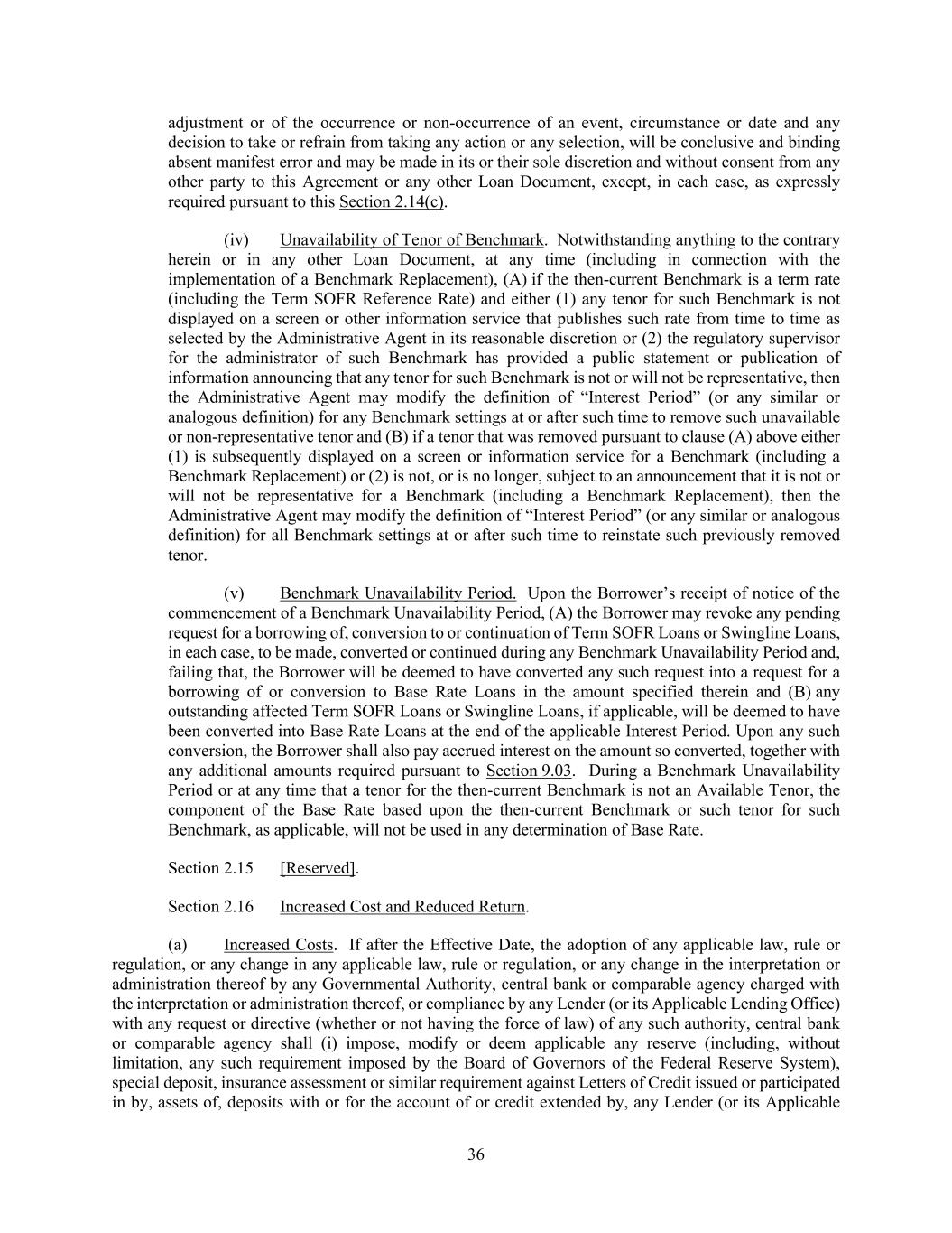 36 adjustment or of the occurrence or non-occurrence of an event, circumstance or date and any decision to take or refrain from taking any action or any selection, will be conclusive and binding absent manifest error and may be made in its or their sole discretion and without consent from any other party to this Agreement or any other Loan Document, except, in each case, as expressly required pursuant to this Section 2.14(c). (iv) Unavailability of Tenor of Benchmark. Notwithstanding anything to the contrary herein or in any other Loan Document, at any time (including in connection with the implementation of a Benchmark Replacement), (A) if the then-current Benchmark is a term rate (including the Term SOFR Reference Rate) and either (1) any tenor for such Benchmark is not displayed on a screen or other information service that publishes such rate from time to time as selected by the Administrative Agent in its reasonable discretion or (2) the regulatory supervisor for the administrator of such Benchmark has provided a public statement or publication of information announcing that any tenor for such Benchmark is not or will not be representative, then the Administrative Agent may modify the definition of “Interest Period” (or any similar or analogous definition) for any Benchmark settings at or after such time to remove such unavailable or non-representative tenor and (B) if a tenor that was removed pursuant to clause (A) above either (1) is subsequently displayed on a screen or information service for a Benchmark (including a Benchmark Replacement) or (2) is not, or is no longer, subject to an announcement that it is not or will not be representative for a Benchmark (including a Benchmark Replacement), then the Administrative Agent may modify the definition of “Interest Period” (or any similar or analogous definition) for all Benchmark settings at or after such time to reinstate such previously removed tenor. (v) Benchmark Unavailability Period. Upon the Borrower’s receipt of notice of the commencement of a Benchmark Unavailability Period, (A) the Borrower may revoke any pending request for a borrowing of, conversion to or continuation of Term SOFR Loans or Swingline Loans, in each case, to be made, converted or continued during any Benchmark Unavailability Period and, failing that, the Borrower will be deemed to have converted any such request into a request for a borrowing of or conversion to Base Rate Loans in the amount specified therein and (B) any outstanding affected Term SOFR Loans or Swingline Loans, if applicable, will be deemed to have been converted into Base Rate Loans at the end of the applicable Interest Period. Upon any such conversion, the Borrower shall also pay accrued interest on the amount so converted, together with any additional amounts required pursuant to Section 9.03. During a Benchmark Unavailability Period or at any time that a tenor for the then-current Benchmark is not an Available Tenor, the component of the Base Rate based upon the then-current Benchmark or such tenor for such Benchmark, as applicable, will not be used in any determination of Base Rate. Section 2.15 [Reserved]. Section 2.16 Increased Cost and Reduced Return. (a) Increased Costs. If after the Effective Date, the adoption of any applicable law, rule or regulation, or any change in any applicable law, rule or regulation, or any change in the interpretation or administration thereof by any Governmental Authority, central bank or comparable agency charged with the interpretation or administration thereof, or compliance by any Lender (or its Applicable Lending Office) with any request or directive (whether or not having the force of law) of any such authority, central bank or comparable agency shall (i) impose, modify or deem applicable any reserve (including, without limitation, any such requirement imposed by the Board of Governors of the Federal Reserve System), special deposit, insurance assessment or similar requirement against Letters of Credit issued or participated in by, assets of, deposits with or for the account of or credit extended by, any Lender (or its Applicable