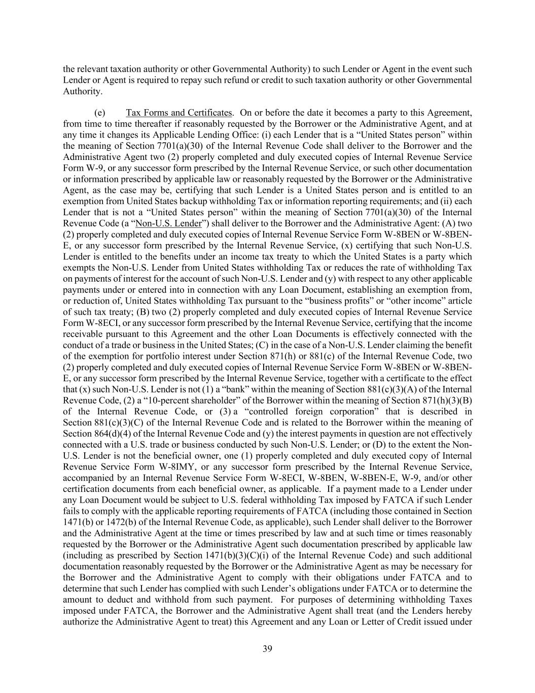 39 the relevant taxation authority or other Governmental Authority) to such Lender or Agent in the event such Lender or Agent is required to repay such refund or credit to such taxation authority or other Governmental Authority. (e) Tax Forms and Certificates. On or before the date it becomes a party to this Agreement, from time to time thereafter if reasonably requested by the Borrower or the Administrative Agent, and at any time it changes its Applicable Lending Office: (i) each Lender that is a “United States person” within the meaning of Section 7701(a)(30) of the Internal Revenue Code shall deliver to the Borrower and the Administrative Agent two (2) properly completed and duly executed copies of Internal Revenue Service Form W-9, or any successor form prescribed by the Internal Revenue Service, or such other documentation or information prescribed by applicable law or reasonably requested by the Borrower or the Administrative Agent, as the case may be, certifying that such Lender is a United States person and is entitled to an exemption from United States backup withholding Tax or information reporting requirements; and (ii) each Lender that is not a “United States person” within the meaning of Section 7701(a)(30) of the Internal Revenue Code (a “Non-U.S. Lender”) shall deliver to the Borrower and the Administrative Agent: (A) two (2) properly completed and duly executed copies of Internal Revenue Service Form W-8BEN or W-8BEN- E, or any successor form prescribed by the Internal Revenue Service, (x) certifying that such Non-U.S. Lender is entitled to the benefits under an income tax treaty to which the United States is a party which exempts the Non-U.S. Lender from United States withholding Tax or reduces the rate of withholding Tax on payments of interest for the account of such Non-U.S. Lender and (y) with respect to any other applicable payments under or entered into in connection with any Loan Document, establishing an exemption from, or reduction of, United States withholding Tax pursuant to the “business profits” or “other income” article of such tax treaty; (B) two (2) properly completed and duly executed copies of Internal Revenue Service Form W-8ECI, or any successor form prescribed by the Internal Revenue Service, certifying that the income receivable pursuant to this Agreement and the other Loan Documents is effectively connected with the conduct of a trade or business in the United States; (C) in the case of a Non-U.S. Lender claiming the benefit of the exemption for portfolio interest under Section 871(h) or 881(c) of the Internal Revenue Code, two (2) properly completed and duly executed copies of Internal Revenue Service Form W-8BEN or W-8BEN- E, or any successor form prescribed by the Internal Revenue Service, together with a certificate to the effect that (x) such Non-U.S. Lender is not (1) a “bank” within the meaning of Section 881(c)(3)(A) of the Internal Revenue Code, (2) a “10-percent shareholder” of the Borrower within the meaning of Section 871(h)(3)(B) of the Internal Revenue Code, or (3) a “controlled foreign corporation” that is described in Section 881(c)(3)(C) of the Internal Revenue Code and is related to the Borrower within the meaning of Section 864(d)(4) of the Internal Revenue Code and (y) the interest payments in question are not effectively connected with a U.S. trade or business conducted by such Non-U.S. Lender; or (D) to the extent the Non- U.S. Lender is not the beneficial owner, one (1) properly completed and duly executed copy of Internal Revenue Service Form W-8IMY, or any successor form prescribed by the Internal Revenue Service, accompanied by an Internal Revenue Service Form W-8ECI, W-8BEN, W-8BEN-E, W-9, and/or other certification documents from each beneficial owner, as applicable. If a payment made to a Lender under any Loan Document would be subject to U.S. federal withholding Tax imposed by FATCA if such Lender fails to comply with the applicable reporting requirements of FATCA (including those contained in Section 1471(b) or 1472(b) of the Internal Revenue Code, as applicable), such Lender shall deliver to the Borrower and the Administrative Agent at the time or times prescribed by law and at such time or times reasonably requested by the Borrower or the Administrative Agent such documentation prescribed by applicable law (including as prescribed by Section 1471(b)(3)(C)(i) of the Internal Revenue Code) and such additional documentation reasonably requested by the Borrower or the Administrative Agent as may be necessary for the Borrower and the Administrative Agent to comply with their obligations under FATCA and to determine that such Lender has complied with such Lender’s obligations under FATCA or to determine the amount to deduct and withhold from such payment. For purposes of determining withholding Taxes imposed under FATCA, the Borrower and the Administrative Agent shall treat (and the Lenders hereby authorize the Administrative Agent to treat) this Agreement and any Loan or Letter of Credit issued under