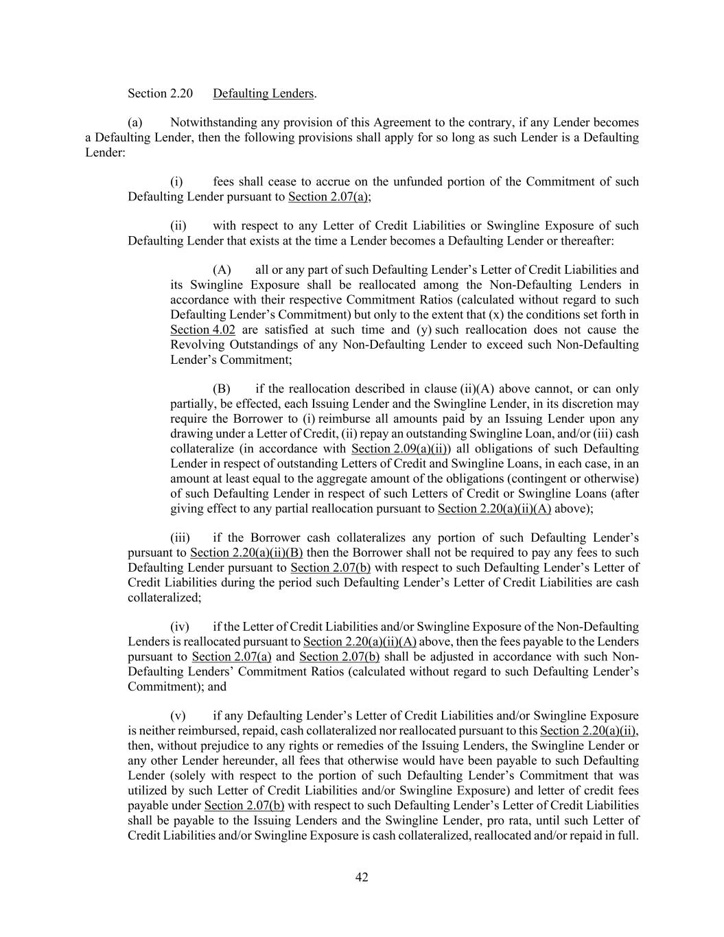 42 Section 2.20 Defaulting Lenders. (a) Notwithstanding any provision of this Agreement to the contrary, if any Lender becomes a Defaulting Lender, then the following provisions shall apply for so long as such Lender is a Defaulting Lender: (i) fees shall cease to accrue on the unfunded portion of the Commitment of such Defaulting Lender pursuant to Section 2.07(a); (ii) with respect to any Letter of Credit Liabilities or Swingline Exposure of such Defaulting Lender that exists at the time a Lender becomes a Defaulting Lender or thereafter: (A) all or any part of such Defaulting Lender’s Letter of Credit Liabilities and its Swingline Exposure shall be reallocated among the Non-Defaulting Lenders in accordance with their respective Commitment Ratios (calculated without regard to such Defaulting Lender’s Commitment) but only to the extent that (x) the conditions set forth in Section 4.02 are satisfied at such time and (y) such reallocation does not cause the Revolving Outstandings of any Non-Defaulting Lender to exceed such Non-Defaulting Lender’s Commitment; (B) if the reallocation described in clause (ii)(A) above cannot, or can only partially, be effected, each Issuing Lender and the Swingline Lender, in its discretion may require the Borrower to (i) reimburse all amounts paid by an Issuing Lender upon any drawing under a Letter of Credit, (ii) repay an outstanding Swingline Loan, and/or (iii) cash collateralize (in accordance with Section 2.09(a)(ii)) all obligations of such Defaulting Lender in respect of outstanding Letters of Credit and Swingline Loans, in each case, in an amount at least equal to the aggregate amount of the obligations (contingent or otherwise) of such Defaulting Lender in respect of such Letters of Credit or Swingline Loans (after giving effect to any partial reallocation pursuant to Section 2.20(a)(ii)(A) above); (iii) if the Borrower cash collateralizes any portion of such Defaulting Lender’s pursuant to Section 2.20(a)(ii)(B) then the Borrower shall not be required to pay any fees to such Defaulting Lender pursuant to Section 2.07(b) with respect to such Defaulting Lender’s Letter of Credit Liabilities during the period such Defaulting Lender’s Letter of Credit Liabilities are cash collateralized; (iv) if the Letter of Credit Liabilities and/or Swingline Exposure of the Non-Defaulting Lenders is reallocated pursuant to Section 2.20(a)(ii)(A) above, then the fees payable to the Lenders pursuant to Section 2.07(a) and Section 2.07(b) shall be adjusted in accordance with such Non- Defaulting Lenders’ Commitment Ratios (calculated without regard to such Defaulting Lender’s Commitment); and (v) if any Defaulting Lender’s Letter of Credit Liabilities and/or Swingline Exposure is neither reimbursed, repaid, cash collateralized nor reallocated pursuant to this Section 2.20(a)(ii), then, without prejudice to any rights or remedies of the Issuing Lenders, the Swingline Lender or any other Lender hereunder, all fees that otherwise would have been payable to such Defaulting Lender (solely with respect to the portion of such Defaulting Lender’s Commitment that was utilized by such Letter of Credit Liabilities and/or Swingline Exposure) and letter of credit fees payable under Section 2.07(b) with respect to such Defaulting Lender’s Letter of Credit Liabilities shall be payable to the Issuing Lenders and the Swingline Lender, pro rata, until such Letter of Credit Liabilities and/or Swingline Exposure is cash collateralized, reallocated and/or repaid in full.