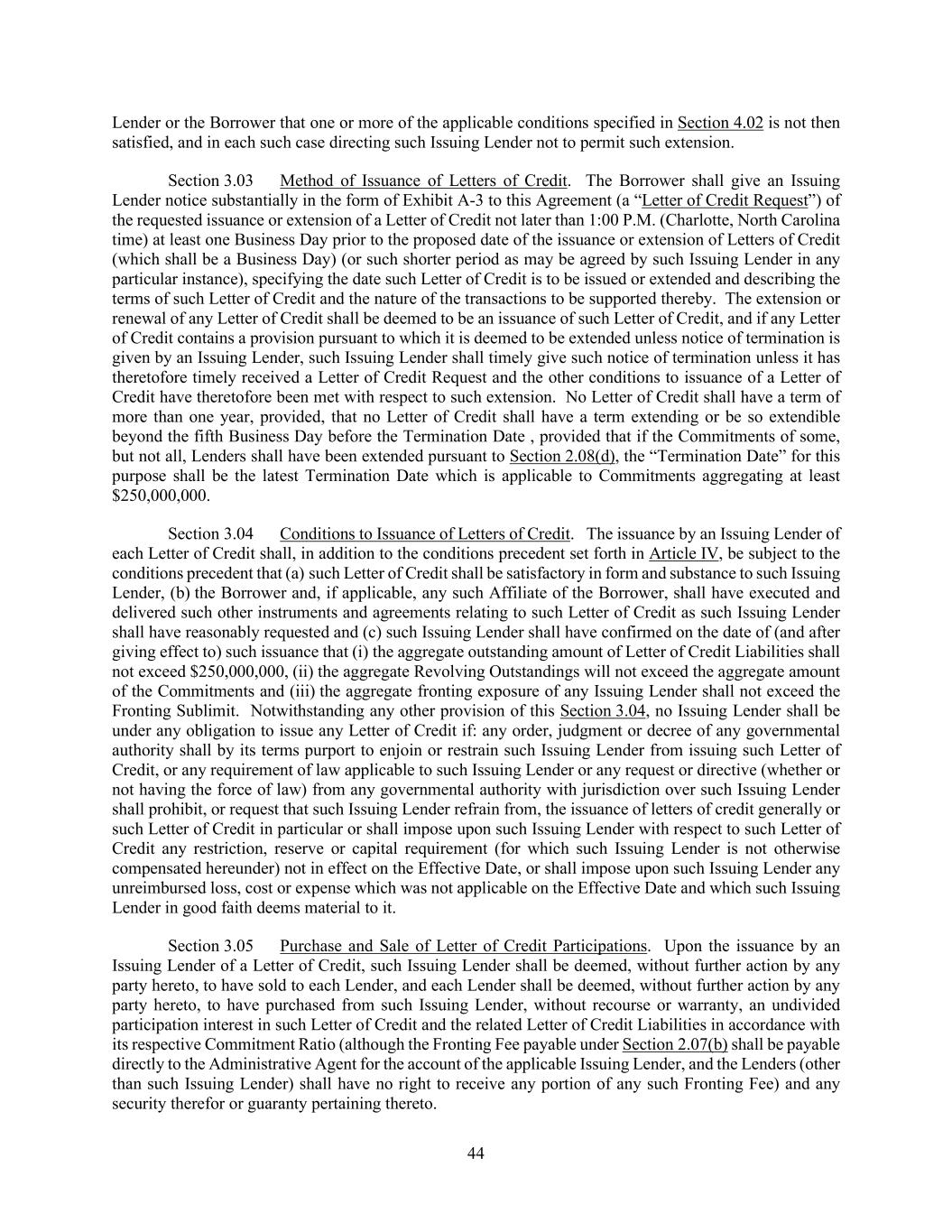 44 Lender or the Borrower that one or more of the applicable conditions specified in Section 4.02 is not then satisfied, and in each such case directing such Issuing Lender not to permit such extension. Section 3.03 Method of Issuance of Letters of Credit. The Borrower shall give an Issuing Lender notice substantially in the form of Exhibit A-3 to this Agreement (a “Letter of Credit Request”) of the requested issuance or extension of a Letter of Credit not later than 1:00 P.M. (Charlotte, North Carolina time) at least one Business Day prior to the proposed date of the issuance or extension of Letters of Credit (which shall be a Business Day) (or such shorter period as may be agreed by such Issuing Lender in any particular instance), specifying the date such Letter of Credit is to be issued or extended and describing the terms of such Letter of Credit and the nature of the transactions to be supported thereby. The extension or renewal of any Letter of Credit shall be deemed to be an issuance of such Letter of Credit, and if any Letter of Credit contains a provision pursuant to which it is deemed to be extended unless notice of termination is given by an Issuing Lender, such Issuing Lender shall timely give such notice of termination unless it has theretofore timely received a Letter of Credit Request and the other conditions to issuance of a Letter of Credit have theretofore been met with respect to such extension. No Letter of Credit shall have a term of more than one year, provided, that no Letter of Credit shall have a term extending or be so extendible beyond the fifth Business Day before the Termination Date , provided that if the Commitments of some, but not all, Lenders shall have been extended pursuant to Section 2.08(d), the “Termination Date” for this purpose shall be the latest Termination Date which is applicable to Commitments aggregating at least $250,000,000. Section 3.04 Conditions to Issuance of Letters of Credit. The issuance by an Issuing Lender of each Letter of Credit shall, in addition to the conditions precedent set forth in Article IV, be subject to the conditions precedent that (a) such Letter of Credit shall be satisfactory in form and substance to such Issuing Lender, (b) the Borrower and, if applicable, any such Affiliate of the Borrower, shall have executed and delivered such other instruments and agreements relating to such Letter of Credit as such Issuing Lender shall have reasonably requested and (c) such Issuing Lender shall have confirmed on the date of (and after giving effect to) such issuance that (i) the aggregate outstanding amount of Letter of Credit Liabilities shall not exceed $250,000,000, (ii) the aggregate Revolving Outstandings will not exceed the aggregate amount of the Commitments and (iii) the aggregate fronting exposure of any Issuing Lender shall not exceed the Fronting Sublimit. Notwithstanding any other provision of this Section 3.04, no Issuing Lender shall be under any obligation to issue any Letter of Credit if: any order, judgment or decree of any governmental authority shall by its terms purport to enjoin or restrain such Issuing Lender from issuing such Letter of Credit, or any requirement of law applicable to such Issuing Lender or any request or directive (whether or not having the force of law) from any governmental authority with jurisdiction over such Issuing Lender shall prohibit, or request that such Issuing Lender refrain from, the issuance of letters of credit generally or such Letter of Credit in particular or shall impose upon such Issuing Lender with respect to such Letter of Credit any restriction, reserve or capital requirement (for which such Issuing Lender is not otherwise compensated hereunder) not in effect on the Effective Date, or shall impose upon such Issuing Lender any unreimbursed loss, cost or expense which was not applicable on the Effective Date and which such Issuing Lender in good faith deems material to it. Section 3.05 Purchase and Sale of Letter of Credit Participations. Upon the issuance by an Issuing Lender of a Letter of Credit, such Issuing Lender shall be deemed, without further action by any party hereto, to have sold to each Lender, and each Lender shall be deemed, without further action by any party hereto, to have purchased from such Issuing Lender, without recourse or warranty, an undivided participation interest in such Letter of Credit and the related Letter of Credit Liabilities in accordance with its respective Commitment Ratio (although the Fronting Fee payable under Section 2.07(b) shall be payable directly to the Administrative Agent for the account of the applicable Issuing Lender, and the Lenders (other than such Issuing Lender) shall have no right to receive any portion of any such Fronting Fee) and any security therefor or guaranty pertaining thereto.