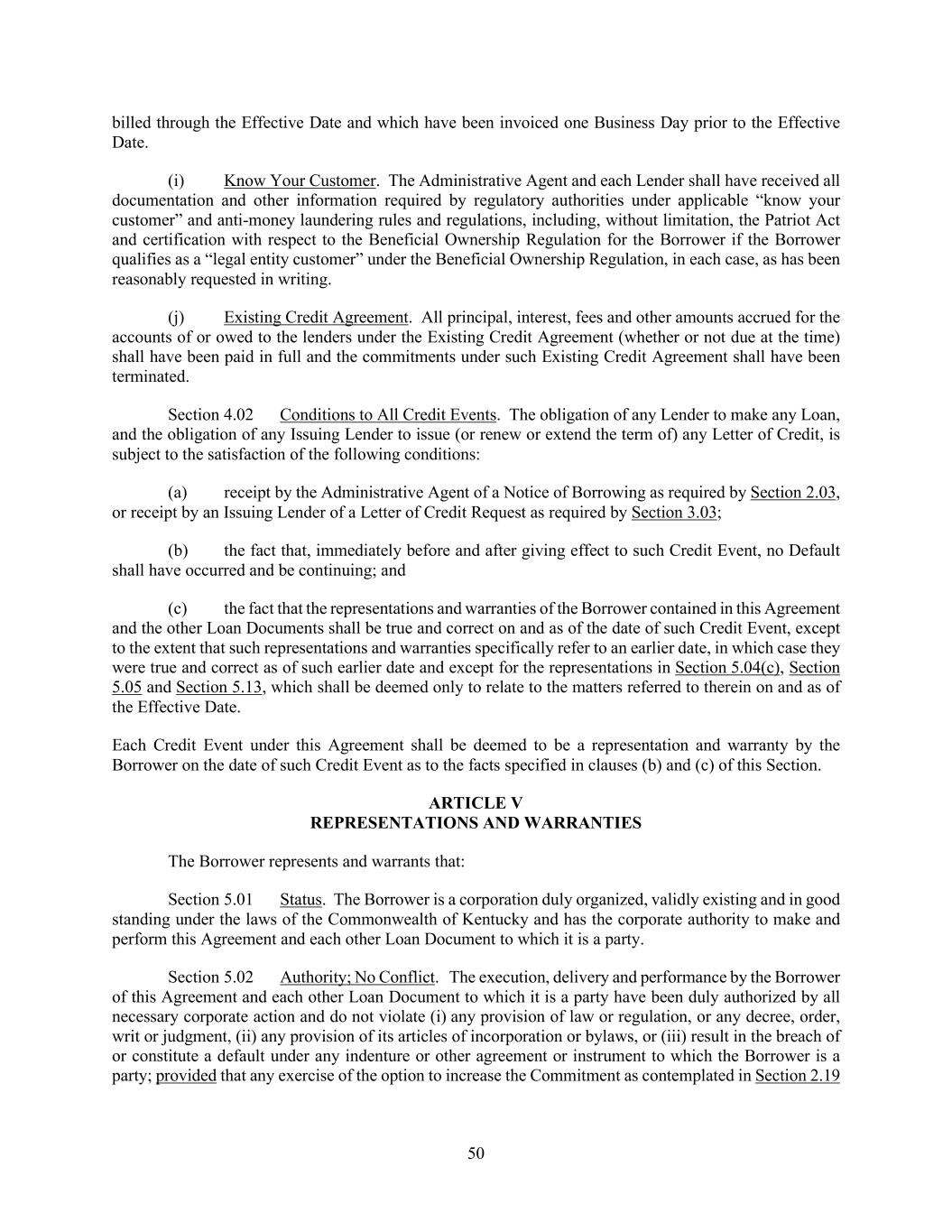 50 billed through the Effective Date and which have been invoiced one Business Day prior to the Effective Date. (i) Know Your Customer. The Administrative Agent and each Lender shall have received all documentation and other information required by regulatory authorities under applicable “know your customer” and anti-money laundering rules and regulations, including, without limitation, the Patriot Act and certification with respect to the Beneficial Ownership Regulation for the Borrower if the Borrower qualifies as a “legal entity customer” under the Beneficial Ownership Regulation, in each case, as has been reasonably requested in writing. (j) Existing Credit Agreement. All principal, interest, fees and other amounts accrued for the accounts of or owed to the lenders under the Existing Credit Agreement (whether or not due at the time) shall have been paid in full and the commitments under such Existing Credit Agreement shall have been terminated. Section 4.02 Conditions to All Credit Events. The obligation of any Lender to make any Loan, and the obligation of any Issuing Lender to issue (or renew or extend the term of) any Letter of Credit, is subject to the satisfaction of the following conditions: (a) receipt by the Administrative Agent of a Notice of Borrowing as required by Section 2.03, or receipt by an Issuing Lender of a Letter of Credit Request as required by Section 3.03; (b) the fact that, immediately before and after giving effect to such Credit Event, no Default shall have occurred and be continuing; and (c) the fact that the representations and warranties of the Borrower contained in this Agreement and the other Loan Documents shall be true and correct on and as of the date of such Credit Event, except to the extent that such representations and warranties specifically refer to an earlier date, in which case they were true and correct as of such earlier date and except for the representations in Section 5.04(c), Section 5.05 and Section 5.13, which shall be deemed only to relate to the matters referred to therein on and as of the Effective Date. Each Credit Event under this Agreement shall be deemed to be a representation and warranty by the Borrower on the date of such Credit Event as to the facts specified in clauses (b) and (c) of this Section. ARTICLE V REPRESENTATIONS AND WARRANTIES The Borrower represents and warrants that: Section 5.01 Status. The Borrower is a corporation duly organized, validly existing and in good standing under the laws of the Commonwealth of Kentucky and has the corporate authority to make and perform this Agreement and each other Loan Document to which it is a party. Section 5.02 Authority; No Conflict. The execution, delivery and performance by the Borrower of this Agreement and each other Loan Document to which it is a party have been duly authorized by all necessary corporate action and do not violate (i) any provision of law or regulation, or any decree, order, writ or judgment, (ii) any provision of its articles of incorporation or bylaws, or (iii) result in the breach of or constitute a default under any indenture or other agreement or instrument to which the Borrower is a party; provided that any exercise of the option to increase the Commitment as contemplated in Section 2.19