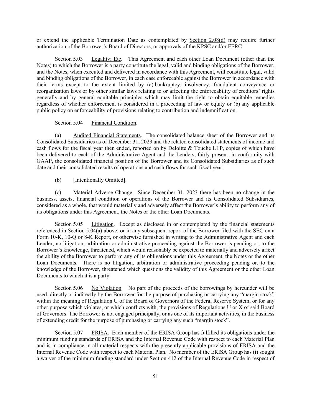 51 or extend the applicable Termination Date as contemplated by Section 2.08(d) may require further authorization of the Borrower’s Board of Directors, or approvals of the KPSC and/or FERC. Section 5.03 Legality; Etc. This Agreement and each other Loan Document (other than the Notes) to which the Borrower is a party constitute the legal, valid and binding obligations of the Borrower, and the Notes, when executed and delivered in accordance with this Agreement, will constitute legal, valid and binding obligations of the Borrower, in each case enforceable against the Borrower in accordance with their terms except to the extent limited by (a) bankruptcy, insolvency, fraudulent conveyance or reorganization laws or by other similar laws relating to or affecting the enforceability of creditors’ rights generally and by general equitable principles which may limit the right to obtain equitable remedies regardless of whether enforcement is considered in a proceeding of law or equity or (b) any applicable public policy on enforceability of provisions relating to contribution and indemnification. Section 5.04 Financial Condition. (a) Audited Financial Statements. The consolidated balance sheet of the Borrower and its Consolidated Subsidiaries as of December 31, 2023 and the related consolidated statements of income and cash flows for the fiscal year then ended, reported on by Deloitte & Touche LLP, copies of which have been delivered to each of the Administrative Agent and the Lenders, fairly present, in conformity with GAAP, the consolidated financial position of the Borrower and its Consolidated Subsidiaries as of such date and their consolidated results of operations and cash flows for such fiscal year. (b) [Intentionally Omitted]. (c) Material Adverse Change. Since December 31, 2023 there has been no change in the business, assets, financial condition or operations of the Borrower and its Consolidated Subsidiaries, considered as a whole, that would materially and adversely affect the Borrower’s ability to perform any of its obligations under this Agreement, the Notes or the other Loan Documents. Section 5.05 Litigation. Except as disclosed in or contemplated by the financial statements referenced in Section 5.04(a) above, or in any subsequent report of the Borrower filed with the SEC on a Form 10-K, 10-Q or 8-K Report, or otherwise furnished in writing to the Administrative Agent and each Lender, no litigation, arbitration or administrative proceeding against the Borrower is pending or, to the Borrower’s knowledge, threatened, which would reasonably be expected to materially and adversely affect the ability of the Borrower to perform any of its obligations under this Agreement, the Notes or the other Loan Documents. There is no litigation, arbitration or administrative proceeding pending or, to the knowledge of the Borrower, threatened which questions the validity of this Agreement or the other Loan Documents to which it is a party. Section 5.06 No Violation. No part of the proceeds of the borrowings by hereunder will be used, directly or indirectly by the Borrower for the purpose of purchasing or carrying any “margin stock” within the meaning of Regulation U of the Board of Governors of the Federal Reserve System, or for any other purpose which violates, or which conflicts with, the provisions of Regulations U or X of said Board of Governors. The Borrower is not engaged principally, or as one of its important activities, in the business of extending credit for the purpose of purchasing or carrying any such “margin stock”. Section 5.07 ERISA. Each member of the ERISA Group has fulfilled its obligations under the minimum funding standards of ERISA and the Internal Revenue Code with respect to each Material Plan and is in compliance in all material respects with the presently applicable provisions of ERISA and the Internal Revenue Code with respect to each Material Plan. No member of the ERISA Group has (i) sought a waiver of the minimum funding standard under Section 412 of the Internal Revenue Code in respect of