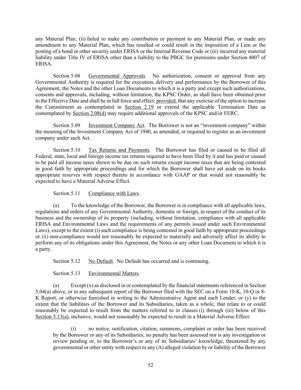52 any Material Plan, (ii) failed to make any contribution or payment to any Material Plan, or made any amendment to any Material Plan, which has resulted or could result in the imposition of a Lien or the posting of a bond or other security under ERISA or the Internal Revenue Code or (iii) incurred any material liability under Title IV of ERISA other than a liability to the PBGC for premiums under Section 4007 of ERISA. Section 5.08 Governmental Approvals. No authorization, consent or approval from any Governmental Authority is required for the execution, delivery and performance by the Borrower of this Agreement, the Notes and the other Loan Documents to which it is a party and except such authorizations, consents and approvals, including, without limitation, the KPSC Order, as shall have been obtained prior to the Effective Date and shall be in full force and effect; provided, that any exercise of the option to increase the Commitment as contemplated in Section 2.19 or extend the applicable Termination Date as contemplated by Section 2.08(d) may require additional approvals of the KPSC and/or FERC. Section 5.09 Investment Company Act. The Borrower is not an “investment company” within the meaning of the Investment Company Act of 1940, as amended, or required to register as an investment company under such Act. Section 5.10 Tax Returns and Payments. The Borrower has filed or caused to be filed all Federal, state, local and foreign income tax returns required to have been filed by it and has paid or caused to be paid all income taxes shown to be due on such returns except income taxes that are being contested in good faith by appropriate proceedings and for which the Borrower shall have set aside on its books appropriate reserves with respect thereto in accordance with GAAP or that would not reasonably be expected to have a Material Adverse Effect. Section 5.11 Compliance with Laws. (a) To the knowledge of the Borrower, the Borrower is in compliance with all applicable laws, regulations and orders of any Governmental Authority, domestic or foreign, in respect of the conduct of its business and the ownership of its property (including, without limitation, compliance with all applicable ERISA and Environmental Laws and the requirements of any permits issued under such Environmental Laws), except to the extent (i) such compliance is being contested in good faith by appropriate proceedings or (ii) non-compliance would not reasonably be expected to materially and adversely affect its ability to perform any of its obligations under this Agreement, the Notes or any other Loan Document to which it is a party. Section 5.12 No Default. No Default has occurred and is continuing. Section 5.13 Environmental Matters. (a) Except (x) as disclosed in or contemplated by the financial statements referenced in Section 5.04(a) above, or in any subsequent report of the Borrower filed with the SEC on a Form 10-K, 10-Q or 8- K Report, or otherwise furnished in writing to the Administrative Agent and each Lender, or (y) to the extent that the liabilities of the Borrower and its Subsidiaries, taken as a whole, that relate to or could reasonably be expected to result from the matters referred to in clauses (i) through (iii) below of this Section 5.13(a), inclusive, would not reasonably be expected to result in a Material Adverse Effect: (i) no notice, notification, citation, summons, complaint or order has been received by the Borrower or any of its Subsidiaries, no penalty has been assessed nor is any investigation or review pending or, to the Borrower’s or any of its Subsidiaries’ knowledge, threatened by any governmental or other entity with respect to any (A) alleged violation by or liability of the Borrower