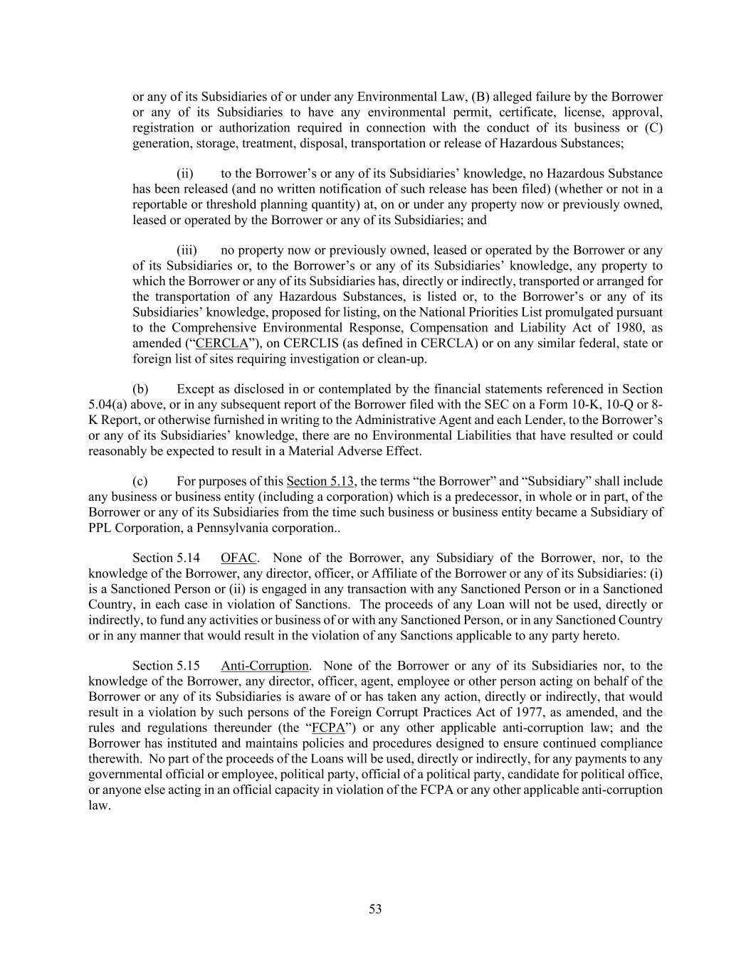 53 or any of its Subsidiaries of or under any Environmental Law, (B) alleged failure by the Borrower or any of its Subsidiaries to have any environmental permit, certificate, license, approval, registration or authorization required in connection with the conduct of its business or (C) generation, storage, treatment, disposal, transportation or release of Hazardous Substances; (ii) to the Borrower’s or any of its Subsidiaries’ knowledge, no Hazardous Substance has been released (and no written notification of such release has been filed) (whether or not in a reportable or threshold planning quantity) at, on or under any property now or previously owned, leased or operated by the Borrower or any of its Subsidiaries; and (iii) no property now or previously owned, leased or operated by the Borrower or any of its Subsidiaries or, to the Borrower’s or any of its Subsidiaries’ knowledge, any property to which the Borrower or any of its Subsidiaries has, directly or indirectly, transported or arranged for the transportation of any Hazardous Substances, is listed or, to the Borrower’s or any of its Subsidiaries’ knowledge, proposed for listing, on the National Priorities List promulgated pursuant to the Comprehensive Environmental Response, Compensation and Liability Act of 1980, as amended (“CERCLA”), on CERCLIS (as defined in CERCLA) or on any similar federal, state or foreign list of sites requiring investigation or clean-up. (b) Except as disclosed in or contemplated by the financial statements referenced in Section 5.04(a) above, or in any subsequent report of the Borrower filed with the SEC on a Form 10-K, 10-Q or 8- K Report, or otherwise furnished in writing to the Administrative Agent and each Lender, to the Borrower’s or any of its Subsidiaries’ knowledge, there are no Environmental Liabilities that have resulted or could reasonably be expected to result in a Material Adverse Effect. (c) For purposes of this Section 5.13, the terms “the Borrower” and “Subsidiary” shall include any business or business entity (including a corporation) which is a predecessor, in whole or in part, of the Borrower or any of its Subsidiaries from the time such business or business entity became a Subsidiary of PPL Corporation, a Pennsylvania corporation.. Section 5.14 OFAC. None of the Borrower, any Subsidiary of the Borrower, nor, to the knowledge of the Borrower, any director, officer, or Affiliate of the Borrower or any of its Subsidiaries: (i) is a Sanctioned Person or (ii) is engaged in any transaction with any Sanctioned Person or in a Sanctioned Country, in each case in violation of Sanctions. The proceeds of any Loan will not be used, directly or indirectly, to fund any activities or business of or with any Sanctioned Person, or in any Sanctioned Country or in any manner that would result in the violation of any Sanctions applicable to any party hereto. Section 5.15 Anti-Corruption. None of the Borrower or any of its Subsidiaries nor, to the knowledge of the Borrower, any director, officer, agent, employee or other person acting on behalf of the Borrower or any of its Subsidiaries is aware of or has taken any action, directly or indirectly, that would result in a violation by such persons of the Foreign Corrupt Practices Act of 1977, as amended, and the rules and regulations thereunder (the “FCPA”) or any other applicable anti-corruption law; and the Borrower has instituted and maintains policies and procedures designed to ensure continued compliance therewith. No part of the proceeds of the Loans will be used, directly or indirectly, for any payments to any governmental official or employee, political party, official of a political party, candidate for political office, or anyone else acting in an official capacity in violation of the FCPA or any other applicable anti-corruption law.