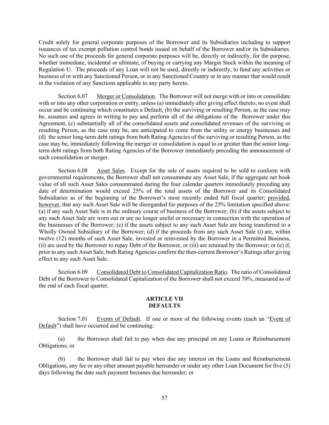 57 Credit solely for general corporate purposes of the Borrower and its Subsidiaries including to support issuances of tax exempt pollution control bonds issued on behalf of the Borrower and/or its Subsidiaries. No such use of the proceeds for general corporate purposes will be, directly or indirectly, for the purpose, whether immediate, incidental or ultimate, of buying or carrying any Margin Stock within the meaning of Regulation U. The proceeds of any Loan will not be used, directly or indirectly, to fund any activities or business of or with any Sanctioned Person, or in any Sanctioned Country or in any manner that would result in the violation of any Sanctions applicable to any party hereto. Section 6.07 Merger or Consolidation. The Borrower will not merge with or into or consolidate with or into any other corporation or entity, unless (a) immediately after giving effect thereto, no event shall occur and be continuing which constitutes a Default, (b) the surviving or resulting Person, as the case may be, assumes and agrees in writing to pay and perform all of the obligations of the Borrower under this Agreement, (c) substantially all of the consolidated assets and consolidated revenues of the surviving or resulting Person, as the case may be, are anticipated to come from the utility or energy businesses and (d) the senior long-term debt ratings from both Rating Agencies of the surviving or resulting Person, as the case may be, immediately following the merger or consolidation is equal to or greater than the senior long- term debt ratings from both Rating Agencies of the Borrower immediately preceding the announcement of such consolidation or merger. Section 6.08 Asset Sales. Except for the sale of assets required to be sold to conform with governmental requirements, the Borrower shall not consummate any Asset Sale, if the aggregate net book value of all such Asset Sales consummated during the four calendar quarters immediately preceding any date of determination would exceed 25% of the total assets of the Borrower and its Consolidated Subsidiaries as of the beginning of the Borrower’s most recently ended full fiscal quarter; provided, however, that any such Asset Sale will be disregarded for purposes of the 25% limitation specified above: (a) if any such Asset Sale is in the ordinary course of business of the Borrower; (b) if the assets subject to any such Asset Sale are worn out or are no longer useful or necessary in connection with the operation of the businesses of the Borrower; (c) if the assets subject to any such Asset Sale are being transferred to a Wholly Owned Subsidiary of the Borrower; (d) if the proceeds from any such Asset Sale (i) are, within twelve (12) months of such Asset Sale, invested or reinvested by the Borrower in a Permitted Business, (ii) are used by the Borrower to repay Debt of the Borrower, or (iii) are retained by the Borrower; or (e) if, prior to any such Asset Sale, both Rating Agencies confirm the then-current Borrower’s Ratings after giving effect to any such Asset Sale. Section 6.09 Consolidated Debt to Consolidated Capitalization Ratio. The ratio of Consolidated Debt of the Borrower to Consolidated Capitalization of the Borrower shall not exceed 70%, measured as of the end of each fiscal quarter. ARTICLE VII DEFAULTS Section 7.01 Events of Default. If one or more of the following events (each an “Event of Default”) shall have occurred and be continuing: (a) the Borrower shall fail to pay when due any principal on any Loans or Reimbursement Obligations; or (b) the Borrower shall fail to pay when due any interest on the Loans and Reimbursement Obligations, any fee or any other amount payable hereunder or under any other Loan Document for five (5) days following the date such payment becomes due hereunder; or