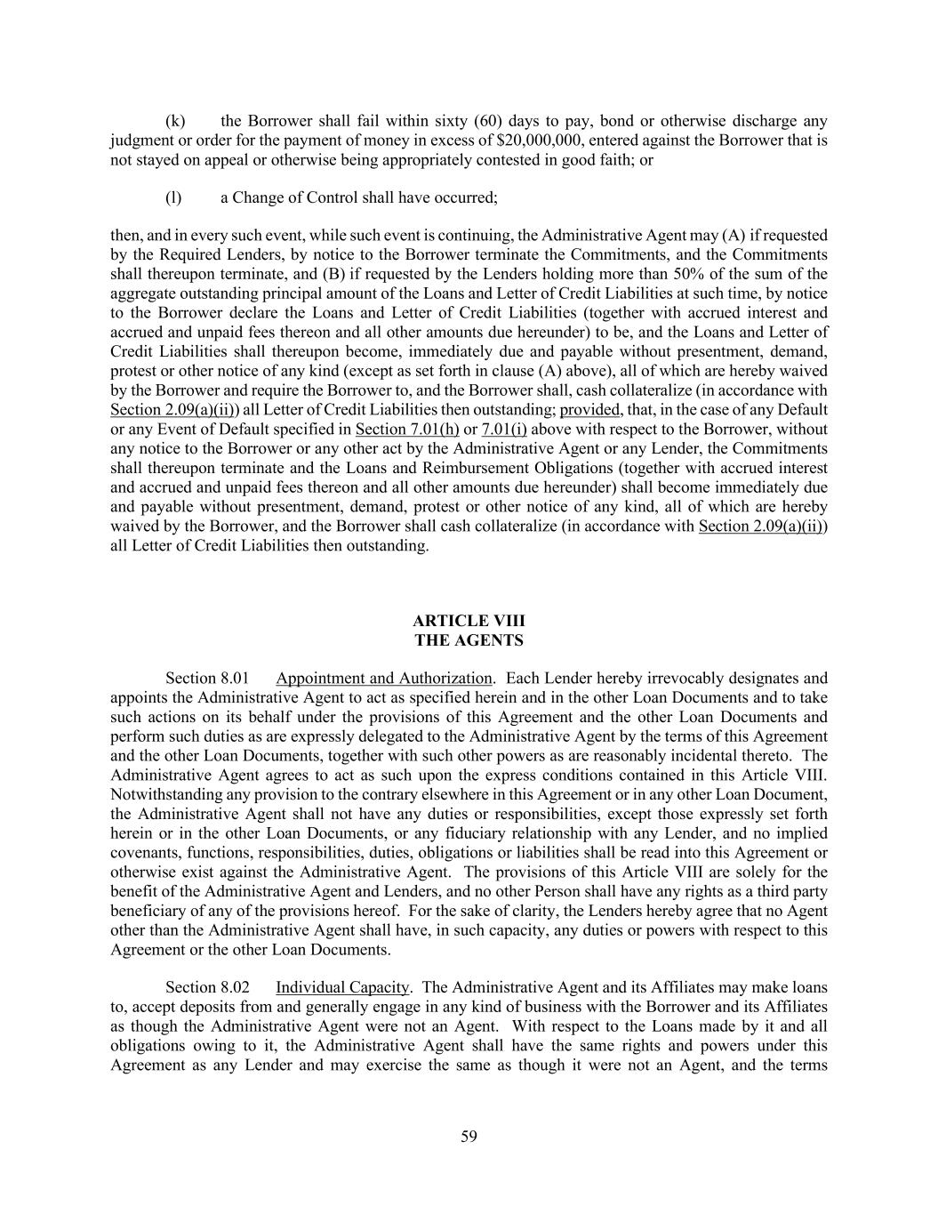 59 (k) the Borrower shall fail within sixty (60) days to pay, bond or otherwise discharge any judgment or order for the payment of money in excess of $20,000,000, entered against the Borrower that is not stayed on appeal or otherwise being appropriately contested in good faith; or (l) a Change of Control shall have occurred; then, and in every such event, while such event is continuing, the Administrative Agent may (A) if requested by the Required Lenders, by notice to the Borrower terminate the Commitments, and the Commitments shall thereupon terminate, and (B) if requested by the Lenders holding more than 50% of the sum of the aggregate outstanding principal amount of the Loans and Letter of Credit Liabilities at such time, by notice to the Borrower declare the Loans and Letter of Credit Liabilities (together with accrued interest and accrued and unpaid fees thereon and all other amounts due hereunder) to be, and the Loans and Letter of Credit Liabilities shall thereupon become, immediately due and payable without presentment, demand, protest or other notice of any kind (except as set forth in clause (A) above), all of which are hereby waived by the Borrower and require the Borrower to, and the Borrower shall, cash collateralize (in accordance with Section 2.09(a)(ii)) all Letter of Credit Liabilities then outstanding; provided, that, in the case of any Default or any Event of Default specified in Section 7.01(h) or 7.01(i) above with respect to the Borrower, without any notice to the Borrower or any other act by the Administrative Agent or any Lender, the Commitments shall thereupon terminate and the Loans and Reimbursement Obligations (together with accrued interest and accrued and unpaid fees thereon and all other amounts due hereunder) shall become immediately due and payable without presentment, demand, protest or other notice of any kind, all of which are hereby waived by the Borrower, and the Borrower shall cash collateralize (in accordance with Section 2.09(a)(ii)) all Letter of Credit Liabilities then outstanding. ARTICLE VIII THE AGENTS Section 8.01 Appointment and Authorization. Each Lender hereby irrevocably designates and appoints the Administrative Agent to act as specified herein and in the other Loan Documents and to take such actions on its behalf under the provisions of this Agreement and the other Loan Documents and perform such duties as are expressly delegated to the Administrative Agent by the terms of this Agreement and the other Loan Documents, together with such other powers as are reasonably incidental thereto. The Administrative Agent agrees to act as such upon the express conditions contained in this Article VIII. Notwithstanding any provision to the contrary elsewhere in this Agreement or in any other Loan Document, the Administrative Agent shall not have any duties or responsibilities, except those expressly set forth herein or in the other Loan Documents, or any fiduciary relationship with any Lender, and no implied covenants, functions, responsibilities, duties, obligations or liabilities shall be read into this Agreement or otherwise exist against the Administrative Agent. The provisions of this Article VIII are solely for the benefit of the Administrative Agent and Lenders, and no other Person shall have any rights as a third party beneficiary of any of the provisions hereof. For the sake of clarity, the Lenders hereby agree that no Agent other than the Administrative Agent shall have, in such capacity, any duties or powers with respect to this Agreement or the other Loan Documents. Section 8.02 Individual Capacity. The Administrative Agent and its Affiliates may make loans to, accept deposits from and generally engage in any kind of business with the Borrower and its Affiliates as though the Administrative Agent were not an Agent. With respect to the Loans made by it and all obligations owing to it, the Administrative Agent shall have the same rights and powers under this Agreement as any Lender and may exercise the same as though it were not an Agent, and the terms