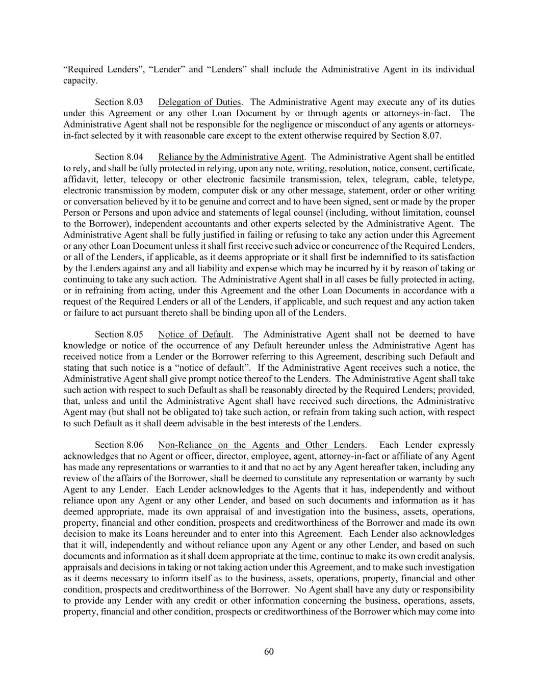 60 “Required Lenders”, “Lender” and “Lenders” shall include the Administrative Agent in its individual capacity. Section 8.03 Delegation of Duties. The Administrative Agent may execute any of its duties under this Agreement or any other Loan Document by or through agents or attorneys-in-fact. The Administrative Agent shall not be responsible for the negligence or misconduct of any agents or attorneys- in-fact selected by it with reasonable care except to the extent otherwise required by Section 8.07. Section 8.04 Reliance by the Administrative Agent. The Administrative Agent shall be entitled to rely, and shall be fully protected in relying, upon any note, writing, resolution, notice, consent, certificate, affidavit, letter, telecopy or other electronic facsimile transmission, telex, telegram, cable, teletype, electronic transmission by modem, computer disk or any other message, statement, order or other writing or conversation believed by it to be genuine and correct and to have been signed, sent or made by the proper Person or Persons and upon advice and statements of legal counsel (including, without limitation, counsel to the Borrower), independent accountants and other experts selected by the Administrative Agent. The Administrative Agent shall be fully justified in failing or refusing to take any action under this Agreement or any other Loan Document unless it shall first receive such advice or concurrence of the Required Lenders, or all of the Lenders, if applicable, as it deems appropriate or it shall first be indemnified to its satisfaction by the Lenders against any and all liability and expense which may be incurred by it by reason of taking or continuing to take any such action. The Administrative Agent shall in all cases be fully protected in acting, or in refraining from acting, under this Agreement and the other Loan Documents in accordance with a request of the Required Lenders or all of the Lenders, if applicable, and such request and any action taken or failure to act pursuant thereto shall be binding upon all of the Lenders. Section 8.05 Notice of Default. The Administrative Agent shall not be deemed to have knowledge or notice of the occurrence of any Default hereunder unless the Administrative Agent has received notice from a Lender or the Borrower referring to this Agreement, describing such Default and stating that such notice is a “notice of default”. If the Administrative Agent receives such a notice, the Administrative Agent shall give prompt notice thereof to the Lenders. The Administrative Agent shall take such action with respect to such Default as shall be reasonably directed by the Required Lenders; provided, that, unless and until the Administrative Agent shall have received such directions, the Administrative Agent may (but shall not be obligated to) take such action, or refrain from taking such action, with respect to such Default as it shall deem advisable in the best interests of the Lenders. Section 8.06 Non-Reliance on the Agents and Other Lenders. Each Lender expressly acknowledges that no Agent or officer, director, employee, agent, attorney-in-fact or affiliate of any Agent has made any representations or warranties to it and that no act by any Agent hereafter taken, including any review of the affairs of the Borrower, shall be deemed to constitute any representation or warranty by such Agent to any Lender. Each Lender acknowledges to the Agents that it has, independently and without reliance upon any Agent or any other Lender, and based on such documents and information as it has deemed appropriate, made its own appraisal of and investigation into the business, assets, operations, property, financial and other condition, prospects and creditworthiness of the Borrower and made its own decision to make its Loans hereunder and to enter into this Agreement. Each Lender also acknowledges that it will, independently and without reliance upon any Agent or any other Lender, and based on such documents and information as it shall deem appropriate at the time, continue to make its own credit analysis, appraisals and decisions in taking or not taking action under this Agreement, and to make such investigation as it deems necessary to inform itself as to the business, assets, operations, property, financial and other condition, prospects and creditworthiness of the Borrower. No Agent shall have any duty or responsibility to provide any Lender with any credit or other information concerning the business, operations, assets, property, financial and other condition, prospects or creditworthiness of the Borrower which may come into