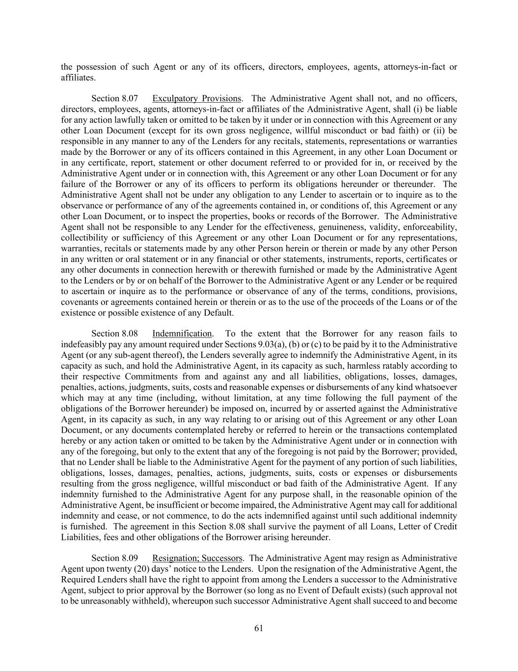 61 the possession of such Agent or any of its officers, directors, employees, agents, attorneys-in-fact or affiliates. Section 8.07 Exculpatory Provisions. The Administrative Agent shall not, and no officers, directors, employees, agents, attorneys-in-fact or affiliates of the Administrative Agent, shall (i) be liable for any action lawfully taken or omitted to be taken by it under or in connection with this Agreement or any other Loan Document (except for its own gross negligence, willful misconduct or bad faith) or (ii) be responsible in any manner to any of the Lenders for any recitals, statements, representations or warranties made by the Borrower or any of its officers contained in this Agreement, in any other Loan Document or in any certificate, report, statement or other document referred to or provided for in, or received by the Administrative Agent under or in connection with, this Agreement or any other Loan Document or for any failure of the Borrower or any of its officers to perform its obligations hereunder or thereunder. The Administrative Agent shall not be under any obligation to any Lender to ascertain or to inquire as to the observance or performance of any of the agreements contained in, or conditions of, this Agreement or any other Loan Document, or to inspect the properties, books or records of the Borrower. The Administrative Agent shall not be responsible to any Lender for the effectiveness, genuineness, validity, enforceability, collectibility or sufficiency of this Agreement or any other Loan Document or for any representations, warranties, recitals or statements made by any other Person herein or therein or made by any other Person in any written or oral statement or in any financial or other statements, instruments, reports, certificates or any other documents in connection herewith or therewith furnished or made by the Administrative Agent to the Lenders or by or on behalf of the Borrower to the Administrative Agent or any Lender or be required to ascertain or inquire as to the performance or observance of any of the terms, conditions, provisions, covenants or agreements contained herein or therein or as to the use of the proceeds of the Loans or of the existence or possible existence of any Default. Section 8.08 Indemnification. To the extent that the Borrower for any reason fails to indefeasibly pay any amount required under Sections 9.03(a), (b) or (c) to be paid by it to the Administrative Agent (or any sub-agent thereof), the Lenders severally agree to indemnify the Administrative Agent, in its capacity as such, and hold the Administrative Agent, in its capacity as such, harmless ratably according to their respective Commitments from and against any and all liabilities, obligations, losses, damages, penalties, actions, judgments, suits, costs and reasonable expenses or disbursements of any kind whatsoever which may at any time (including, without limitation, at any time following the full payment of the obligations of the Borrower hereunder) be imposed on, incurred by or asserted against the Administrative Agent, in its capacity as such, in any way relating to or arising out of this Agreement or any other Loan Document, or any documents contemplated hereby or referred to herein or the transactions contemplated hereby or any action taken or omitted to be taken by the Administrative Agent under or in connection with any of the foregoing, but only to the extent that any of the foregoing is not paid by the Borrower; provided, that no Lender shall be liable to the Administrative Agent for the payment of any portion of such liabilities, obligations, losses, damages, penalties, actions, judgments, suits, costs or expenses or disbursements resulting from the gross negligence, willful misconduct or bad faith of the Administrative Agent. If any indemnity furnished to the Administrative Agent for any purpose shall, in the reasonable opinion of the Administrative Agent, be insufficient or become impaired, the Administrative Agent may call for additional indemnity and cease, or not commence, to do the acts indemnified against until such additional indemnity is furnished. The agreement in this Section 8.08 shall survive the payment of all Loans, Letter of Credit Liabilities, fees and other obligations of the Borrower arising hereunder. Section 8.09 Resignation; Successors. The Administrative Agent may resign as Administrative Agent upon twenty (20) days’ notice to the Lenders. Upon the resignation of the Administrative Agent, the Required Lenders shall have the right to appoint from among the Lenders a successor to the Administrative Agent, subject to prior approval by the Borrower (so long as no Event of Default exists) (such approval not to be unreasonably withheld), whereupon such successor Administrative Agent shall succeed to and become