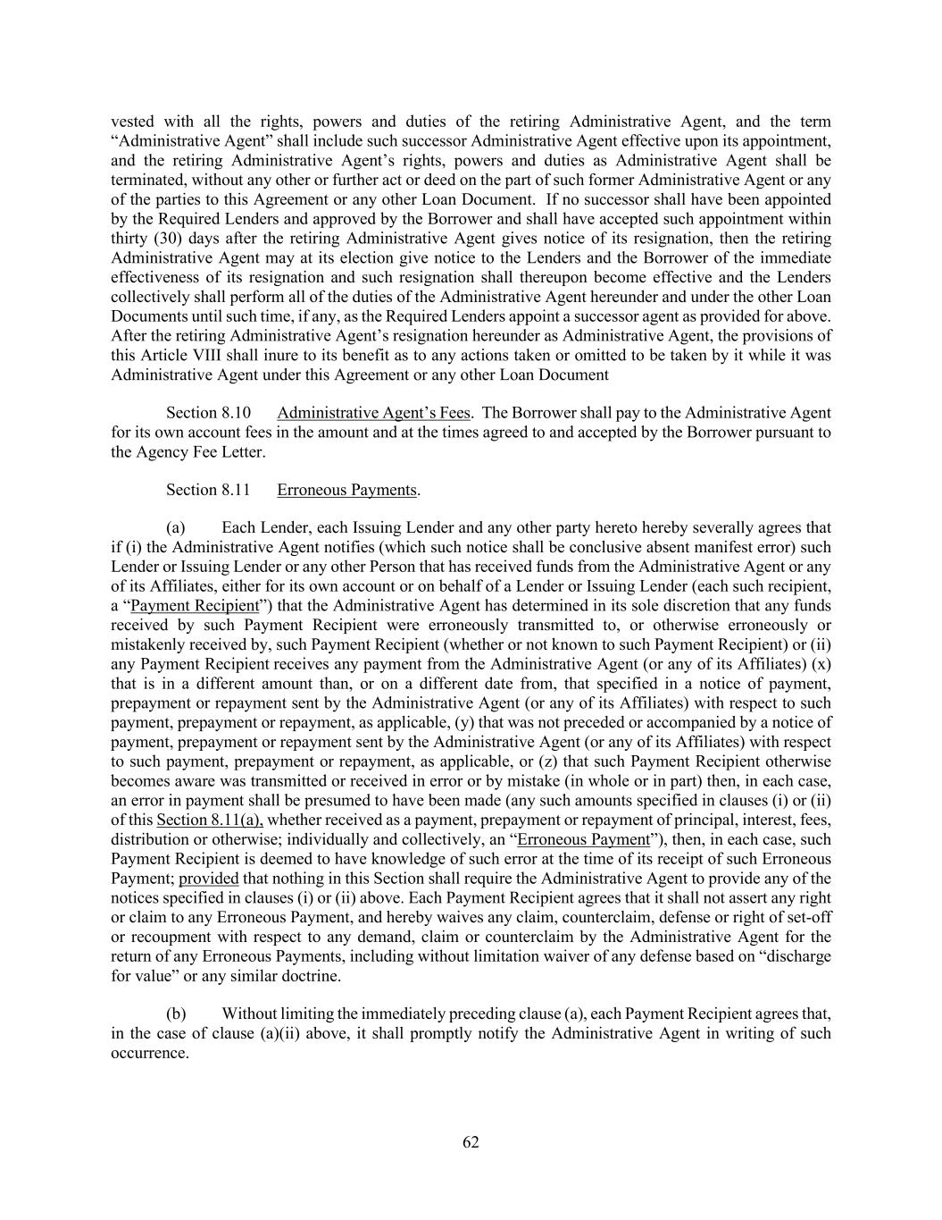 62 vested with all the rights, powers and duties of the retiring Administrative Agent, and the term “Administrative Agent” shall include such successor Administrative Agent effective upon its appointment, and the retiring Administrative Agent’s rights, powers and duties as Administrative Agent shall be terminated, without any other or further act or deed on the part of such former Administrative Agent or any of the parties to this Agreement or any other Loan Document. If no successor shall have been appointed by the Required Lenders and approved by the Borrower and shall have accepted such appointment within thirty (30) days after the retiring Administrative Agent gives notice of its resignation, then the retiring Administrative Agent may at its election give notice to the Lenders and the Borrower of the immediate effectiveness of its resignation and such resignation shall thereupon become effective and the Lenders collectively shall perform all of the duties of the Administrative Agent hereunder and under the other Loan Documents until such time, if any, as the Required Lenders appoint a successor agent as provided for above. After the retiring Administrative Agent’s resignation hereunder as Administrative Agent, the provisions of this Article VIII shall inure to its benefit as to any actions taken or omitted to be taken by it while it was Administrative Agent under this Agreement or any other Loan Document Section 8.10 Administrative Agent’s Fees. The Borrower shall pay to the Administrative Agent for its own account fees in the amount and at the times agreed to and accepted by the Borrower pursuant to the Agency Fee Letter. Section 8.11 Erroneous Payments. (a) Each Lender, each Issuing Lender and any other party hereto hereby severally agrees that if (i) the Administrative Agent notifies (which such notice shall be conclusive absent manifest error) such Lender or Issuing Lender or any other Person that has received funds from the Administrative Agent or any of its Affiliates, either for its own account or on behalf of a Lender or Issuing Lender (each such recipient, a “Payment Recipient”) that the Administrative Agent has determined in its sole discretion that any funds received by such Payment Recipient were erroneously transmitted to, or otherwise erroneously or mistakenly received by, such Payment Recipient (whether or not known to such Payment Recipient) or (ii) any Payment Recipient receives any payment from the Administrative Agent (or any of its Affiliates) (x) that is in a different amount than, or on a different date from, that specified in a notice of payment, prepayment or repayment sent by the Administrative Agent (or any of its Affiliates) with respect to such payment, prepayment or repayment, as applicable, (y) that was not preceded or accompanied by a notice of payment, prepayment or repayment sent by the Administrative Agent (or any of its Affiliates) with respect to such payment, prepayment or repayment, as applicable, or (z) that such Payment Recipient otherwise becomes aware was transmitted or received in error or by mistake (in whole or in part) then, in each case, an error in payment shall be presumed to have been made (any such amounts specified in clauses (i) or (ii) of this Section 8.11(a), whether received as a payment, prepayment or repayment of principal, interest, fees, distribution or otherwise; individually and collectively, an “Erroneous Payment”), then, in each case, such Payment Recipient is deemed to have knowledge of such error at the time of its receipt of such Erroneous Payment; provided that nothing in this Section shall require the Administrative Agent to provide any of the notices specified in clauses (i) or (ii) above. Each Payment Recipient agrees that it shall not assert any right or claim to any Erroneous Payment, and hereby waives any claim, counterclaim, defense or right of set-off or recoupment with respect to any demand, claim or counterclaim by the Administrative Agent for the return of any Erroneous Payments, including without limitation waiver of any defense based on “discharge for value” or any similar doctrine. (b) Without limiting the immediately preceding clause (a), each Payment Recipient agrees that, in the case of clause (a)(ii) above, it shall promptly notify the Administrative Agent in writing of such occurrence.
