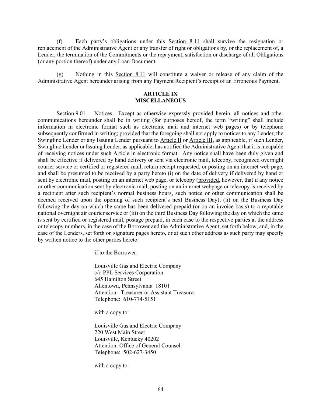 64 (f) Each party’s obligations under this Section 8.11 shall survive the resignation or replacement of the Administrative Agent or any transfer of right or obligations by, or the replacement of, a Lender, the termination of the Commitments or the repayment, satisfaction or discharge of all Obligations (or any portion thereof) under any Loan Document. (g) Nothing in this Section 8.11 will constitute a waiver or release of any claim of the Administrative Agent hereunder arising from any Payment Recipient’s receipt of an Erroneous Payment. ARTICLE IX MISCELLANEOUS Section 9.01 Notices. Except as otherwise expressly provided herein, all notices and other communications hereunder shall be in writing (for purposes hereof, the term “writing” shall include information in electronic format such as electronic mail and internet web pages) or by telephone subsequently confirmed in writing; provided that the foregoing shall not apply to notices to any Lender, the Swingline Lender or any Issuing Lender pursuant to Article II or Article III, as applicable, if such Lender, Swingline Lender or Issuing Lender, as applicable, has notified the Administrative Agent that it is incapable of receiving notices under such Article in electronic format. Any notice shall have been duly given and shall be effective if delivered by hand delivery or sent via electronic mail, telecopy, recognized overnight courier service or certified or registered mail, return receipt requested, or posting on an internet web page, and shall be presumed to be received by a party hereto (i) on the date of delivery if delivered by hand or sent by electronic mail, posting on an internet web page, or telecopy (provided, however, that if any notice or other communication sent by electronic mail, posting on an internet webpage or telecopy is received by a recipient after such recipient’s normal business hours, such notice or other communication shall be deemed received upon the opening of such recipient’s next Business Day), (ii) on the Business Day following the day on which the same has been delivered prepaid (or on an invoice basis) to a reputable national overnight air courier service or (iii) on the third Business Day following the day on which the same is sent by certified or registered mail, postage prepaid, in each case to the respective parties at the address or telecopy numbers, in the case of the Borrower and the Administrative Agent, set forth below, and, in the case of the Lenders, set forth on signature pages hereto, or at such other address as such party may specify by written notice to the other parties hereto: if to the Borrower: Louisville Gas and Electric Company c/o PPL Services Corporation 645 Hamilton Street Allentown, Pennsylvania 18101 Attention: Treasurer or Assistant Treasurer Telephone: 610-774-5151 with a copy to: Louisville Gas and Electric Company 220 West Main Street Louisville, Kentucky 40202 Attention: Office of General Counsel Telephone: 502-627-3450 with a copy to: