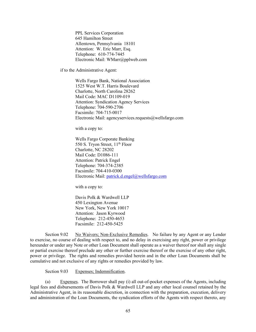 65 PPL Services Corporation 645 Hamilton Street Allentown, Pennsylvania 18101 Attention: W. Eric Marr, Esq. Telephone: 610-774-7445 Electronic Mail: WMarr@pplweb.com if to the Administrative Agent: Wells Fargo Bank, National Association 1525 West W.T. Harris Boulevard Charlotte, North Carolina 28262 Mail Code: MAC D1109-019 Attention: Syndication Agency Services Telephone: 704-590-2706 Facsimile: 704-715-0017 Electronic Mail: agencyservices.requests@wellsfargo.com with a copy to: Wells Fargo Corporate Banking 550 S. Tryon Street, 11th Floor Charlotte, NC 28202 Mail Code: D1086-111 Attention: Patrick Engel Telephone: 704-374-2385 Facsimile: 704-410-0300 Electronic Mail: patrick.d.engel@wellsfargo.com with a copy to: Davis Polk & Wardwell LLP 450 Lexington Avenue New York, New York 10017 Attention: Jason Kyrwood Telephone: 212-450-4653 Facsimile: 212-450-5425 Section 9.02 No Waivers; Non-Exclusive Remedies. No failure by any Agent or any Lender to exercise, no course of dealing with respect to, and no delay in exercising any right, power or privilege hereunder or under any Note or other Loan Document shall operate as a waiver thereof nor shall any single or partial exercise thereof preclude any other or further exercise thereof or the exercise of any other right, power or privilege. The rights and remedies provided herein and in the other Loan Documents shall be cumulative and not exclusive of any rights or remedies provided by law. Section 9.03 Expenses; Indemnification. (a) Expenses. The Borrower shall pay (i) all out-of-pocket expenses of the Agents, including legal fees and disbursements of Davis Polk & Wardwell LLP and any other local counsel retained by the Administrative Agent, in its reasonable discretion, in connection with the preparation, execution, delivery and administration of the Loan Documents, the syndication efforts of the Agents with respect thereto, any