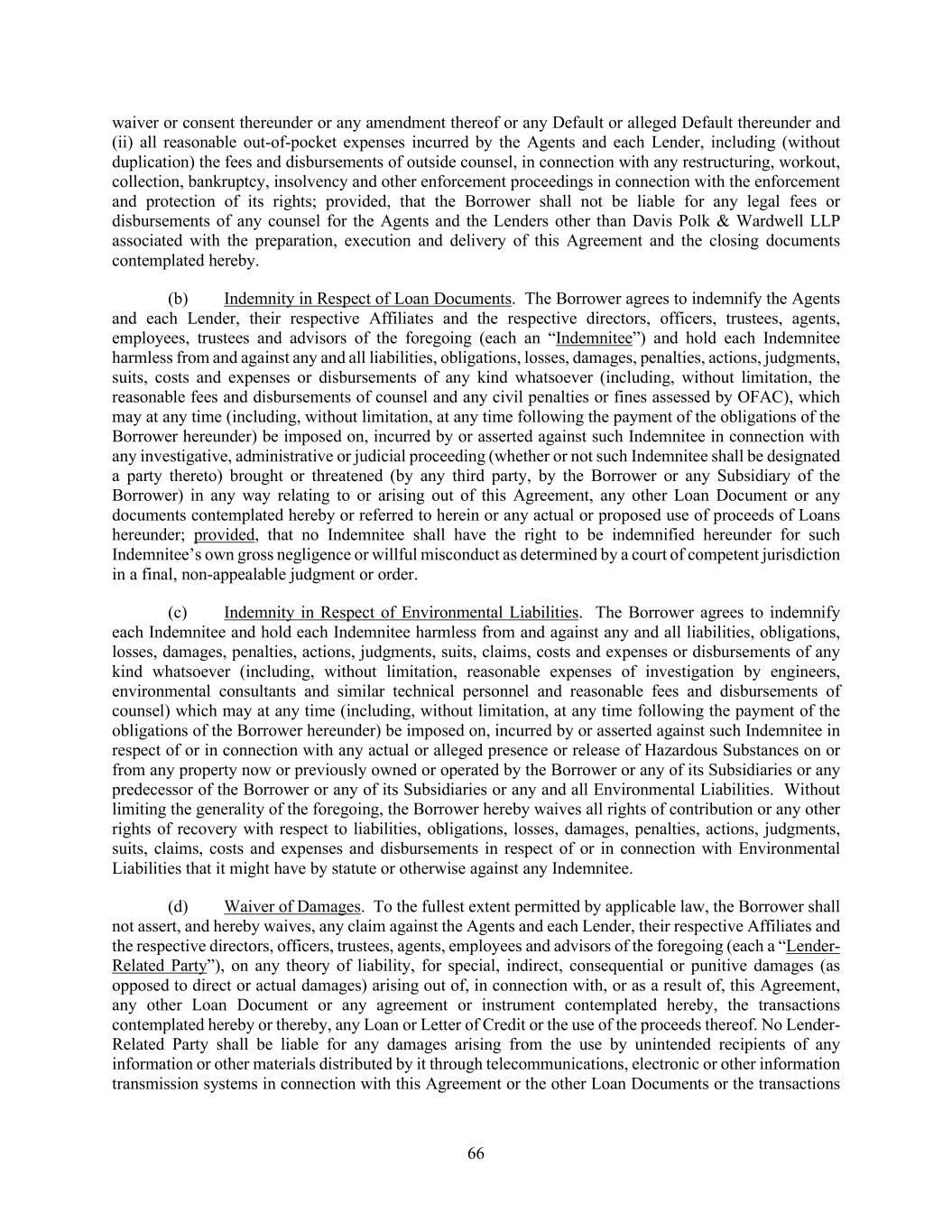 66 waiver or consent thereunder or any amendment thereof or any Default or alleged Default thereunder and (ii) all reasonable out-of-pocket expenses incurred by the Agents and each Lender, including (without duplication) the fees and disbursements of outside counsel, in connection with any restructuring, workout, collection, bankruptcy, insolvency and other enforcement proceedings in connection with the enforcement and protection of its rights; provided, that the Borrower shall not be liable for any legal fees or disbursements of any counsel for the Agents and the Lenders other than Davis Polk & Wardwell LLP associated with the preparation, execution and delivery of this Agreement and the closing documents contemplated hereby. (b) Indemnity in Respect of Loan Documents. The Borrower agrees to indemnify the Agents and each Lender, their respective Affiliates and the respective directors, officers, trustees, agents, employees, trustees and advisors of the foregoing (each an “Indemnitee”) and hold each Indemnitee harmless from and against any and all liabilities, obligations, losses, damages, penalties, actions, judgments, suits, costs and expenses or disbursements of any kind whatsoever (including, without limitation, the reasonable fees and disbursements of counsel and any civil penalties or fines assessed by OFAC), which may at any time (including, without limitation, at any time following the payment of the obligations of the Borrower hereunder) be imposed on, incurred by or asserted against such Indemnitee in connection with any investigative, administrative or judicial proceeding (whether or not such Indemnitee shall be designated a party thereto) brought or threatened (by any third party, by the Borrower or any Subsidiary of the Borrower) in any way relating to or arising out of this Agreement, any other Loan Document or any documents contemplated hereby or referred to herein or any actual or proposed use of proceeds of Loans hereunder; provided, that no Indemnitee shall have the right to be indemnified hereunder for such Indemnitee’s own gross negligence or willful misconduct as determined by a court of competent jurisdiction in a final, non-appealable judgment or order. (c) Indemnity in Respect of Environmental Liabilities. The Borrower agrees to indemnify each Indemnitee and hold each Indemnitee harmless from and against any and all liabilities, obligations, losses, damages, penalties, actions, judgments, suits, claims, costs and expenses or disbursements of any kind whatsoever (including, without limitation, reasonable expenses of investigation by engineers, environmental consultants and similar technical personnel and reasonable fees and disbursements of counsel) which may at any time (including, without limitation, at any time following the payment of the obligations of the Borrower hereunder) be imposed on, incurred by or asserted against such Indemnitee in respect of or in connection with any actual or alleged presence or release of Hazardous Substances on or from any property now or previously owned or operated by the Borrower or any of its Subsidiaries or any predecessor of the Borrower or any of its Subsidiaries or any and all Environmental Liabilities. Without limiting the generality of the foregoing, the Borrower hereby waives all rights of contribution or any other rights of recovery with respect to liabilities, obligations, losses, damages, penalties, actions, judgments, suits, claims, costs and expenses and disbursements in respect of or in connection with Environmental Liabilities that it might have by statute or otherwise against any Indemnitee. (d) Waiver of Damages. To the fullest extent permitted by applicable law, the Borrower shall not assert, and hereby waives, any claim against the Agents and each Lender, their respective Affiliates and the respective directors, officers, trustees, agents, employees and advisors of the foregoing (each a “Lender- Related Party”), on any theory of liability, for special, indirect, consequential or punitive damages (as opposed to direct or actual damages) arising out of, in connection with, or as a result of, this Agreement, any other Loan Document or any agreement or instrument contemplated hereby, the transactions contemplated hereby or thereby, any Loan or Letter of Credit or the use of the proceeds thereof. No Lender- Related Party shall be liable for any damages arising from the use by unintended recipients of any information or other materials distributed by it through telecommunications, electronic or other information transmission systems in connection with this Agreement or the other Loan Documents or the transactions