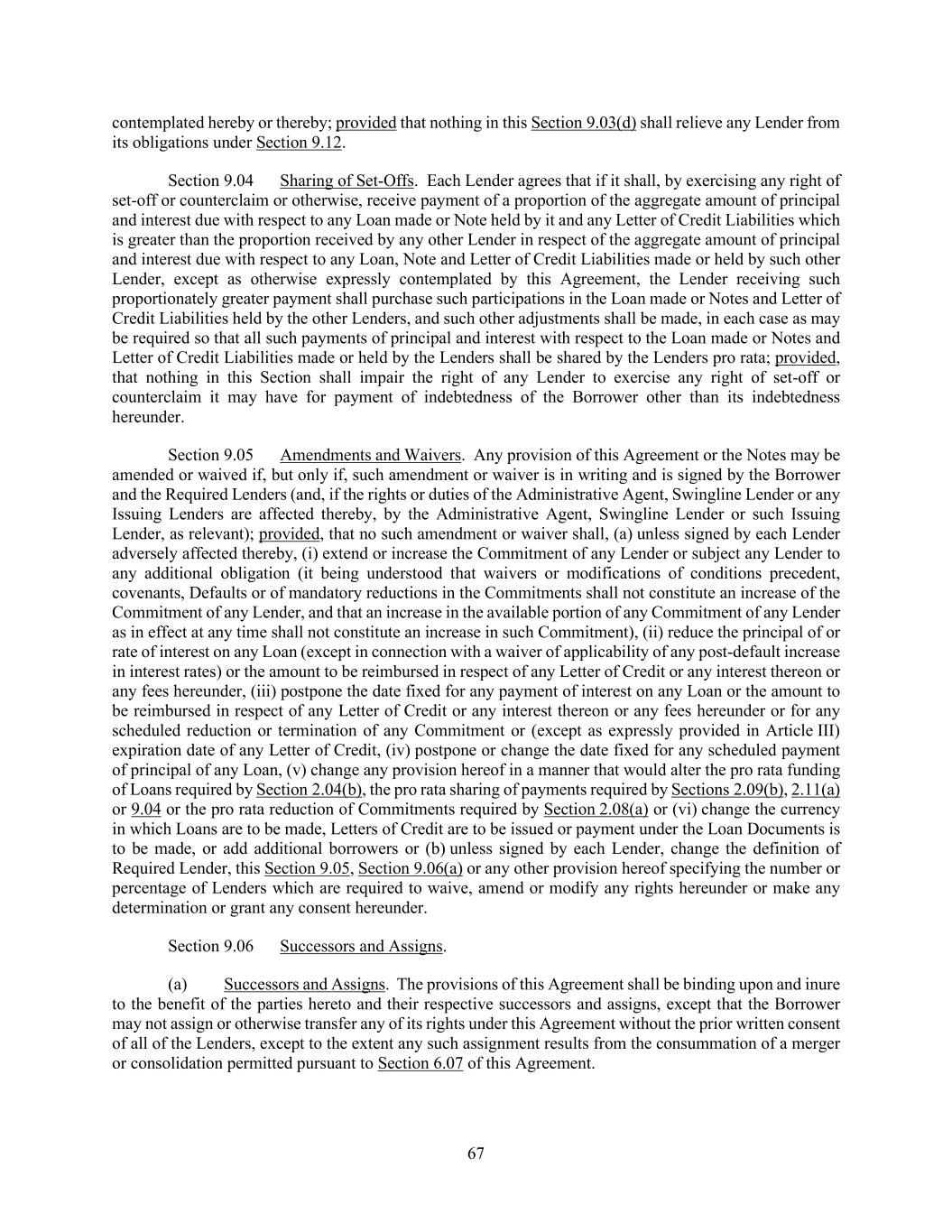 67 contemplated hereby or thereby; provided that nothing in this Section 9.03(d) shall relieve any Lender from its obligations under Section 9.12. Section 9.04 Sharing of Set-Offs. Each Lender agrees that if it shall, by exercising any right of set-off or counterclaim or otherwise, receive payment of a proportion of the aggregate amount of principal and interest due with respect to any Loan made or Note held by it and any Letter of Credit Liabilities which is greater than the proportion received by any other Lender in respect of the aggregate amount of principal and interest due with respect to any Loan, Note and Letter of Credit Liabilities made or held by such other Lender, except as otherwise expressly contemplated by this Agreement, the Lender receiving such proportionately greater payment shall purchase such participations in the Loan made or Notes and Letter of Credit Liabilities held by the other Lenders, and such other adjustments shall be made, in each case as may be required so that all such payments of principal and interest with respect to the Loan made or Notes and Letter of Credit Liabilities made or held by the Lenders shall be shared by the Lenders pro rata; provided, that nothing in this Section shall impair the right of any Lender to exercise any right of set-off or counterclaim it may have for payment of indebtedness of the Borrower other than its indebtedness hereunder. Section 9.05 Amendments and Waivers. Any provision of this Agreement or the Notes may be amended or waived if, but only if, such amendment or waiver is in writing and is signed by the Borrower and the Required Lenders (and, if the rights or duties of the Administrative Agent, Swingline Lender or any Issuing Lenders are affected thereby, by the Administrative Agent, Swingline Lender or such Issuing Lender, as relevant); provided, that no such amendment or waiver shall, (a) unless signed by each Lender adversely affected thereby, (i) extend or increase the Commitment of any Lender or subject any Lender to any additional obligation (it being understood that waivers or modifications of conditions precedent, covenants, Defaults or of mandatory reductions in the Commitments shall not constitute an increase of the Commitment of any Lender, and that an increase in the available portion of any Commitment of any Lender as in effect at any time shall not constitute an increase in such Commitment), (ii) reduce the principal of or rate of interest on any Loan (except in connection with a waiver of applicability of any post-default increase in interest rates) or the amount to be reimbursed in respect of any Letter of Credit or any interest thereon or any fees hereunder, (iii) postpone the date fixed for any payment of interest on any Loan or the amount to be reimbursed in respect of any Letter of Credit or any interest thereon or any fees hereunder or for any scheduled reduction or termination of any Commitment or (except as expressly provided in Article III) expiration date of any Letter of Credit, (iv) postpone or change the date fixed for any scheduled payment of principal of any Loan, (v) change any provision hereof in a manner that would alter the pro rata funding of Loans required by Section 2.04(b), the pro rata sharing of payments required by Sections 2.09(b), 2.11(a) or 9.04 or the pro rata reduction of Commitments required by Section 2.08(a) or (vi) change the currency in which Loans are to be made, Letters of Credit are to be issued or payment under the Loan Documents is to be made, or add additional borrowers or (b) unless signed by each Lender, change the definition of Required Lender, this Section 9.05, Section 9.06(a) or any other provision hereof specifying the number or percentage of Lenders which are required to waive, amend or modify any rights hereunder or make any determination or grant any consent hereunder. Section 9.06 Successors and Assigns. (a) Successors and Assigns. The provisions of this Agreement shall be binding upon and inure to the benefit of the parties hereto and their respective successors and assigns, except that the Borrower may not assign or otherwise transfer any of its rights under this Agreement without the prior written consent of all of the Lenders, except to the extent any such assignment results from the consummation of a merger or consolidation permitted pursuant to Section 6.07 of this Agreement.